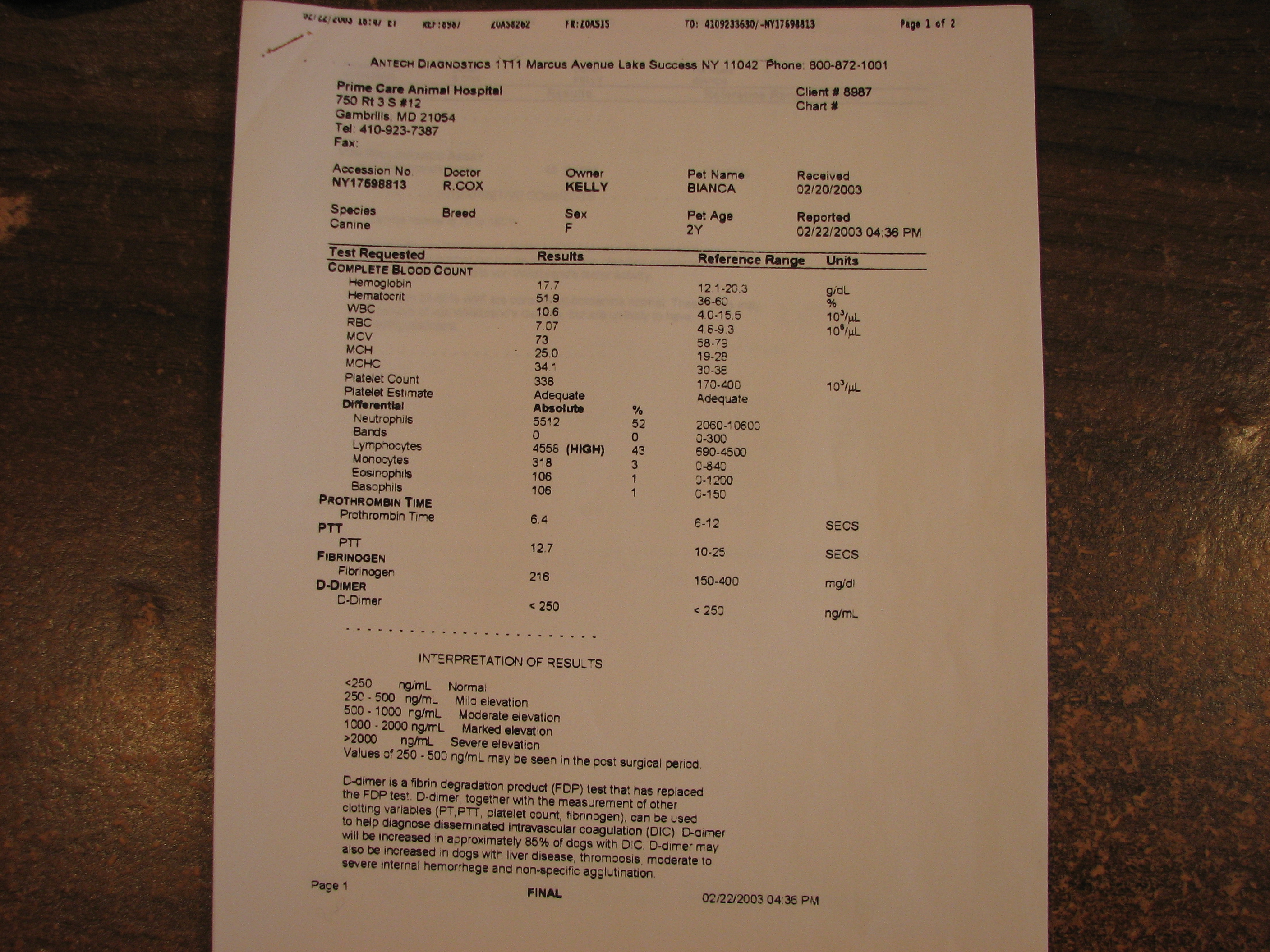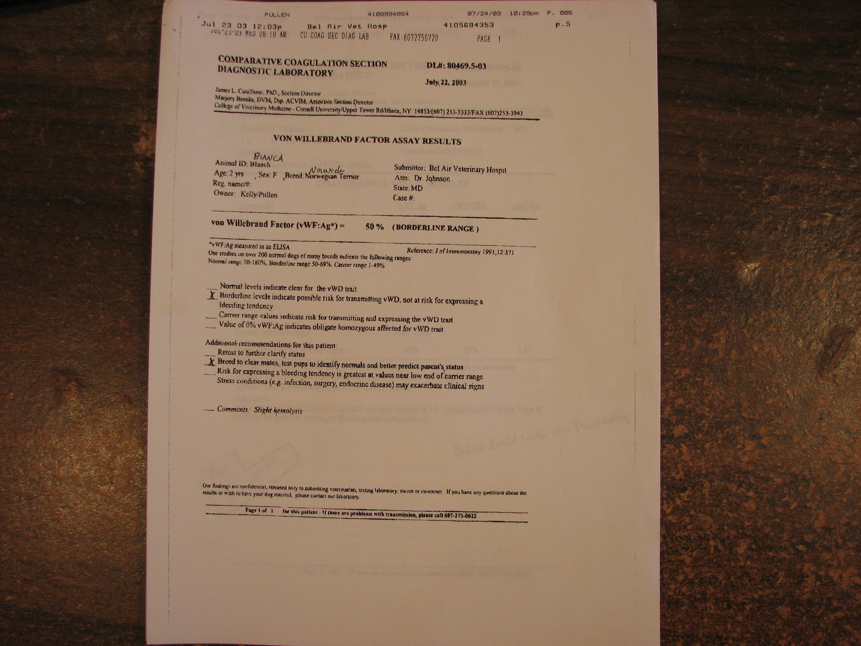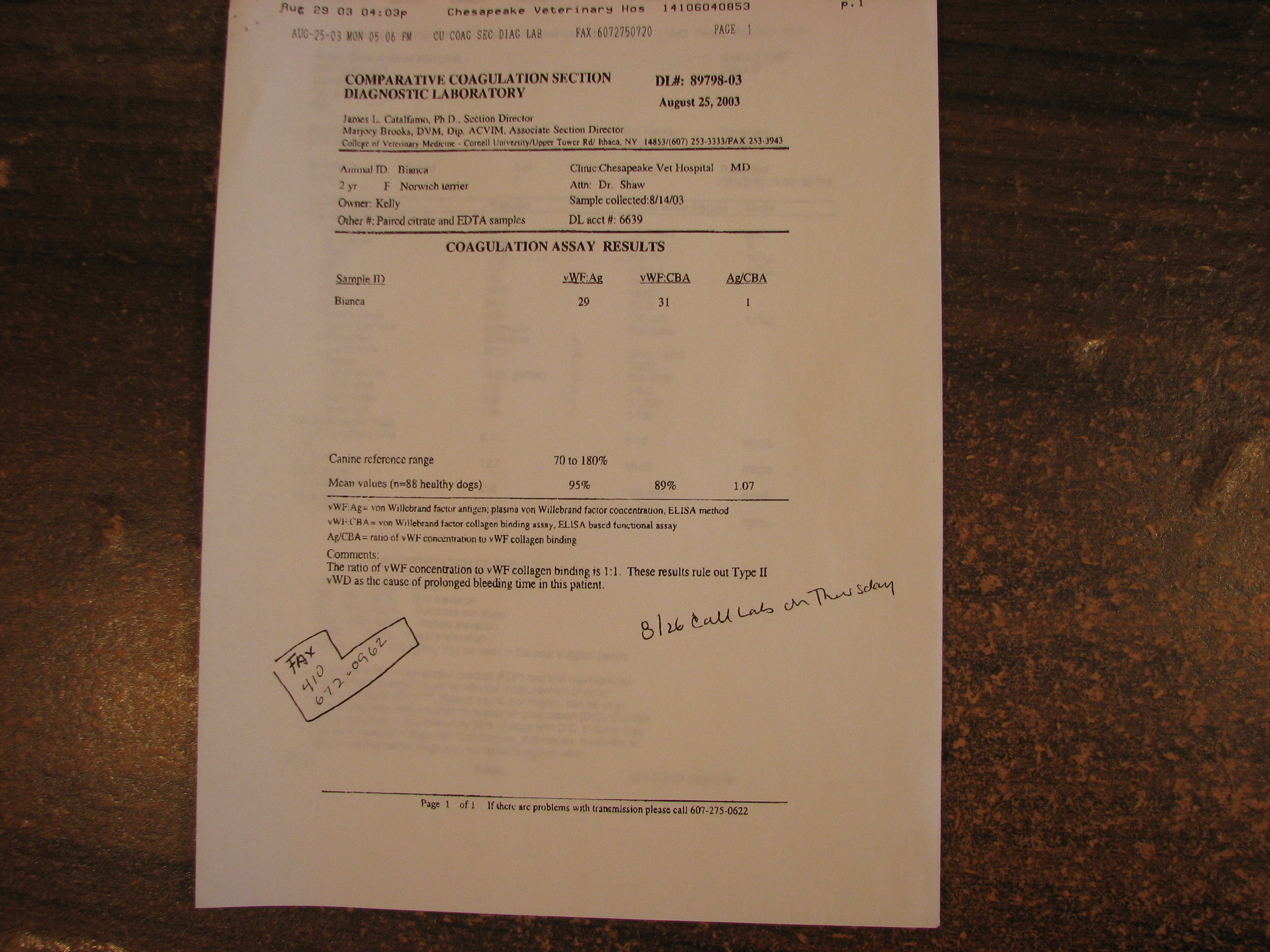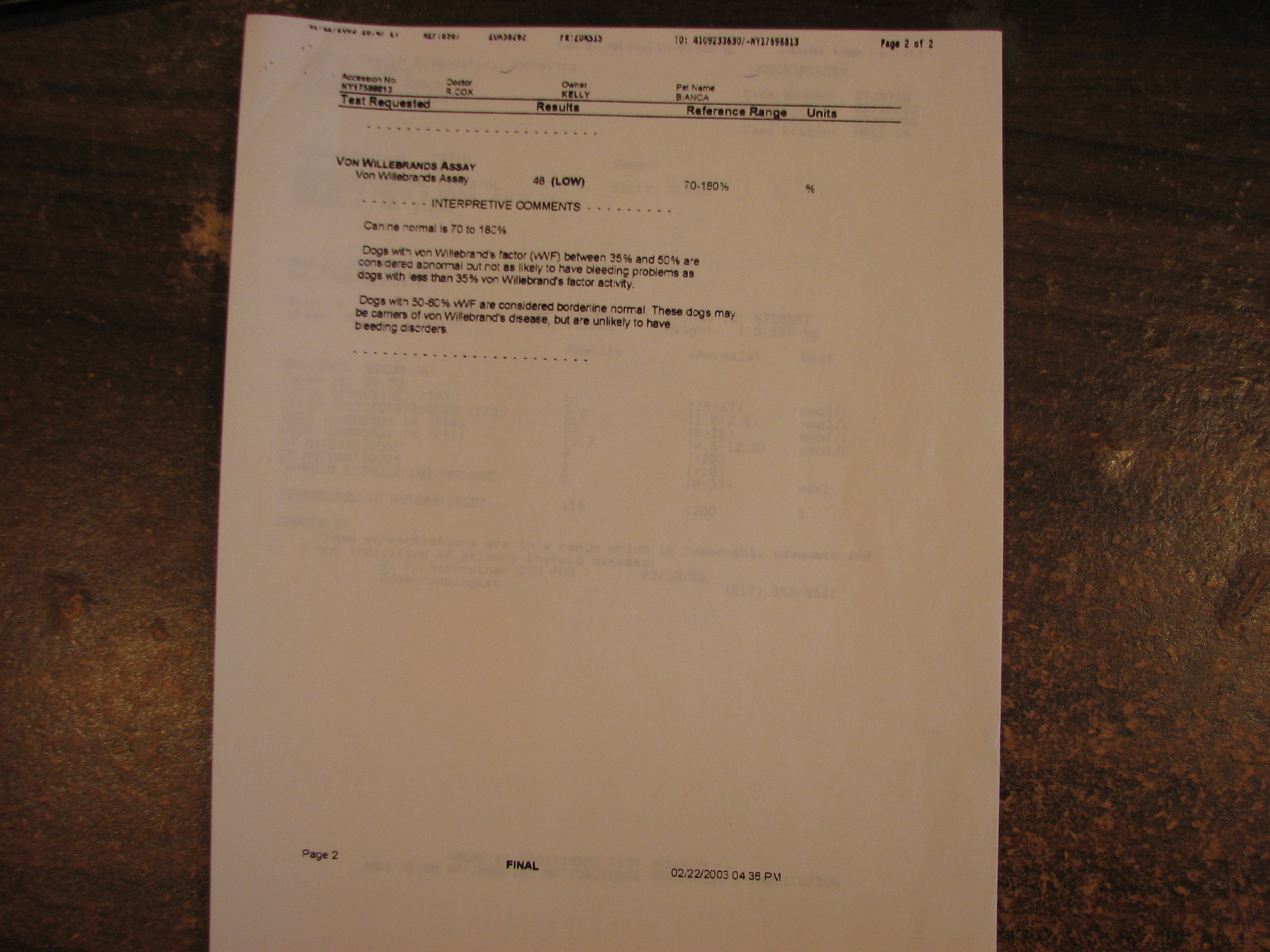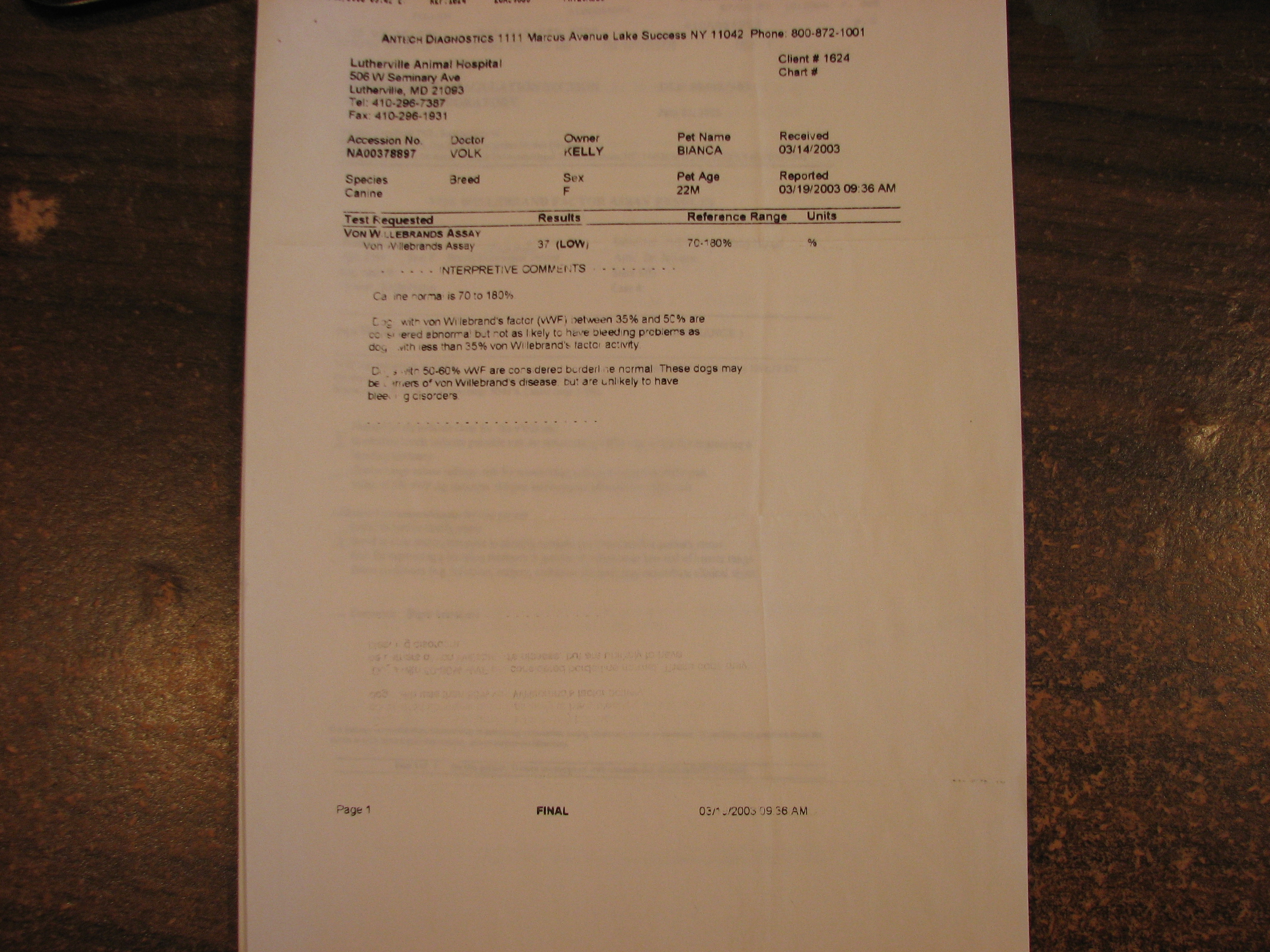 [3] Lab Report page 1, page 2, Feb 2003, Antech Diagnostics, Dr. Cox did blood draw, Von Willebrands assay of 48 with normal being 70-180.