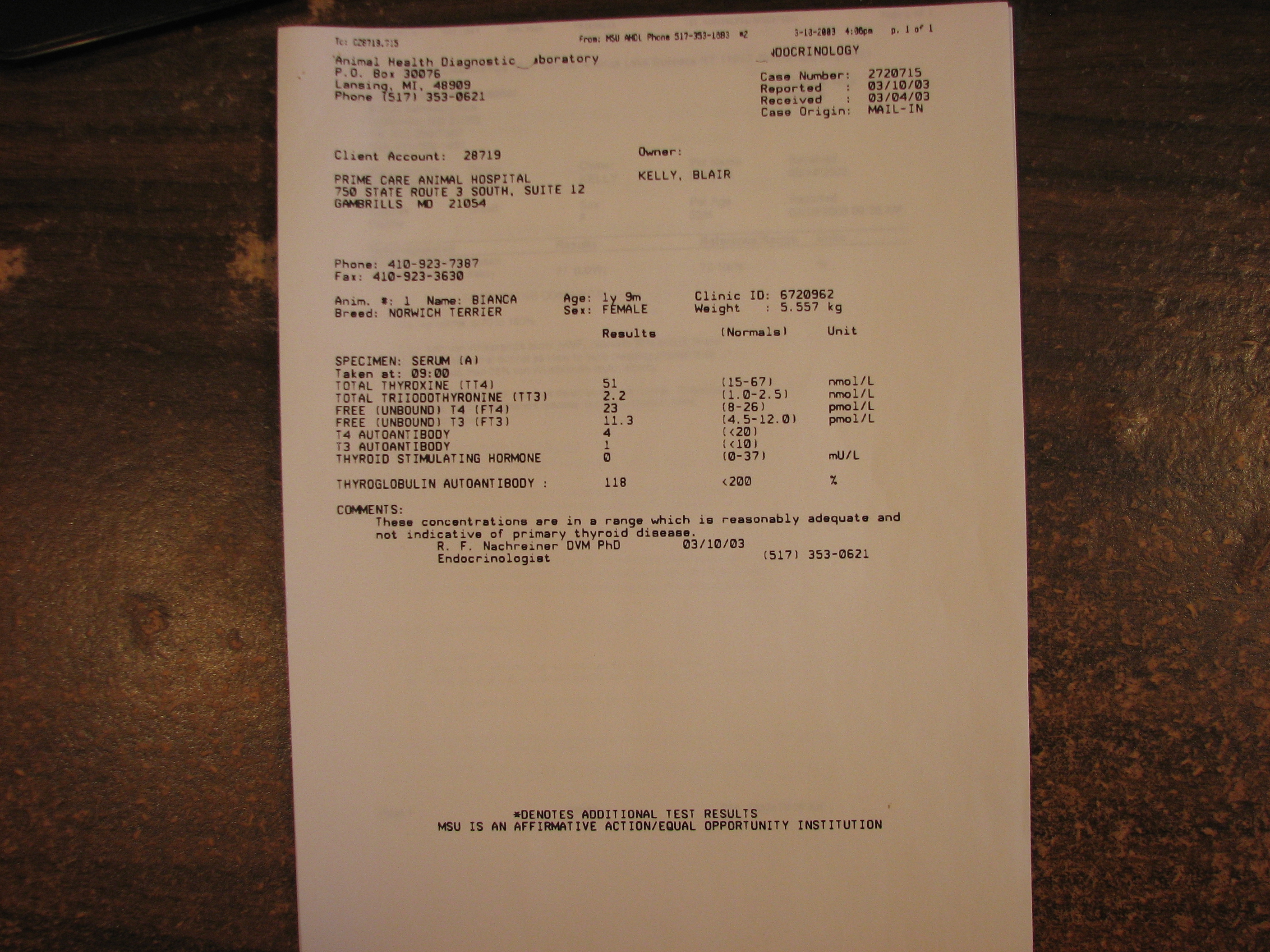 The coagulation study of [6] ruled out Type II in Bianca. (Type II is commonly found in Collies, Chinese Cresteds, and Pointers.) Since Bianca has some von Willebrands factor, this rules out Type III (a deadly form of vWD found in Shelties and Scotties). This means that the type of vWD in Norwich terriers is most likely Type I, which is commonly seen in Bernese Mountain Dogs, Pinchers, Kerry Blue Terriers, Manchester Terriers, Papillions, Pembroke Welsh Corgies, and Poodles.