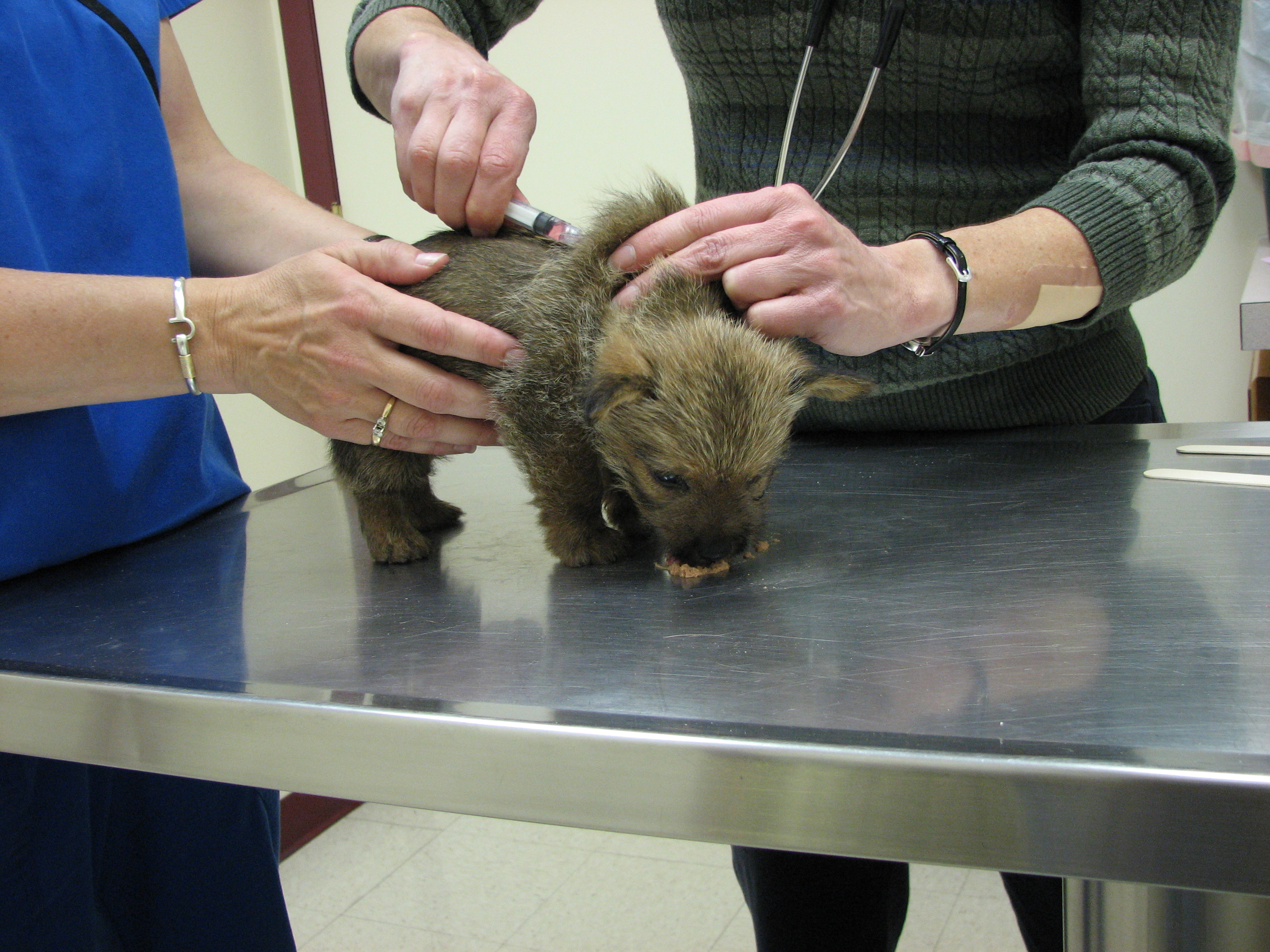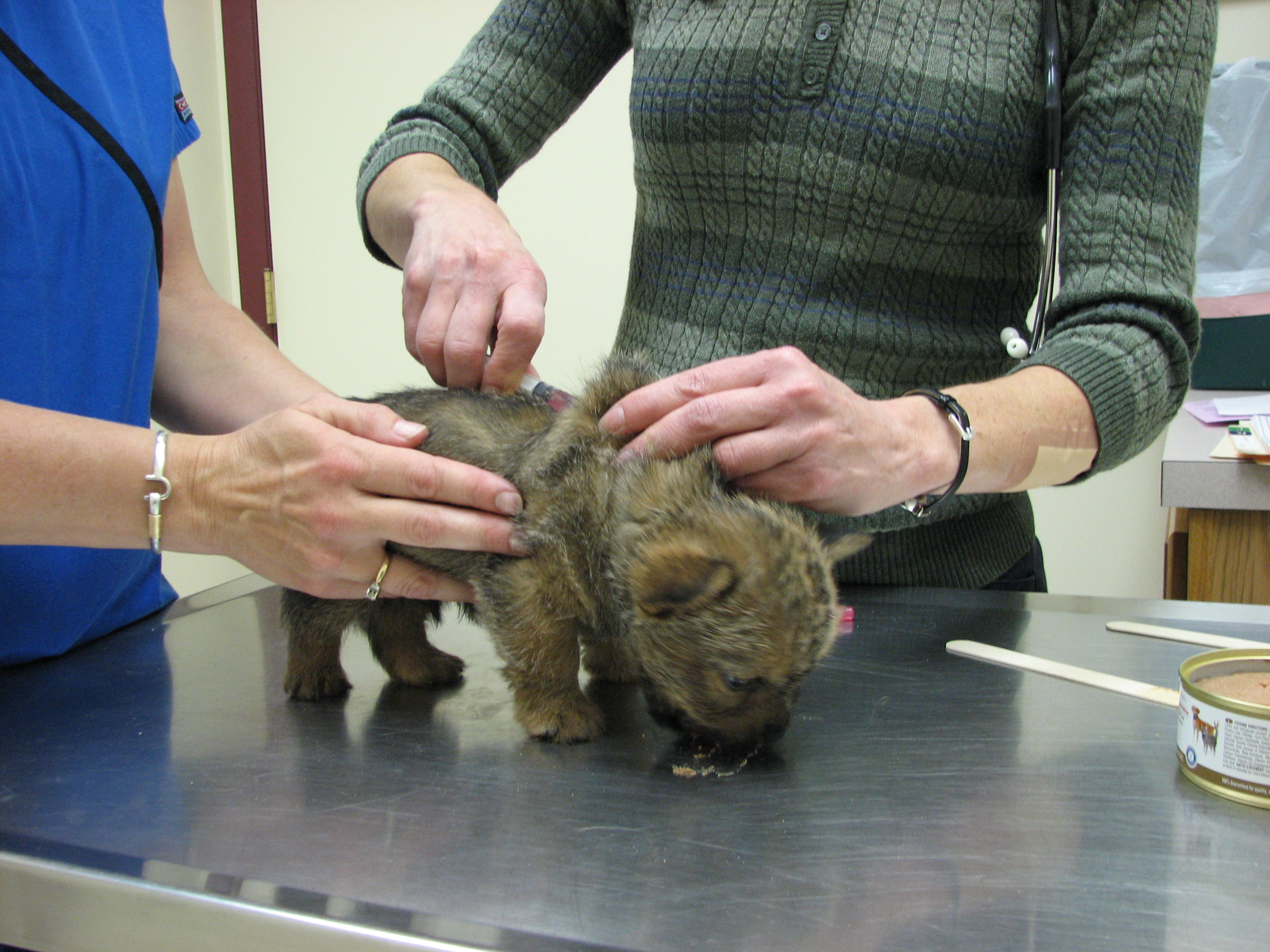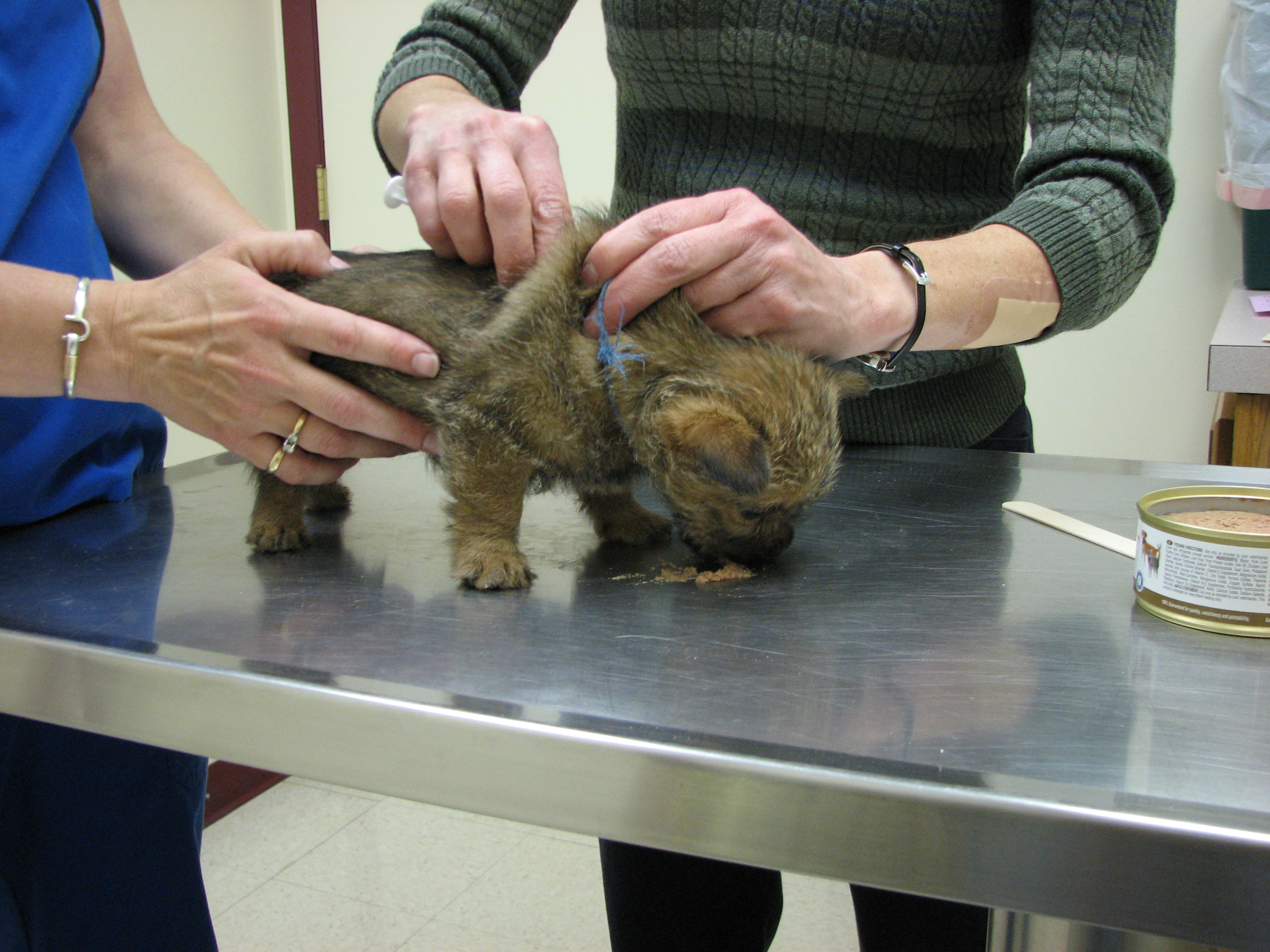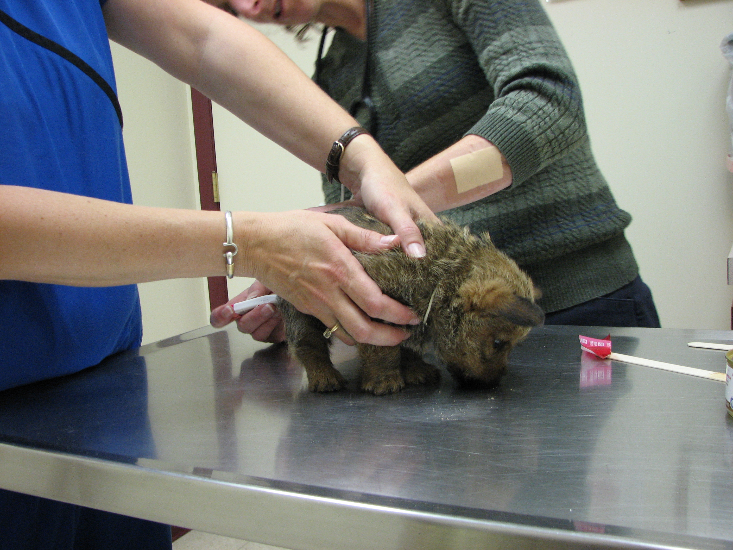 The puppies first visit to the vet. In spite of the hot water
