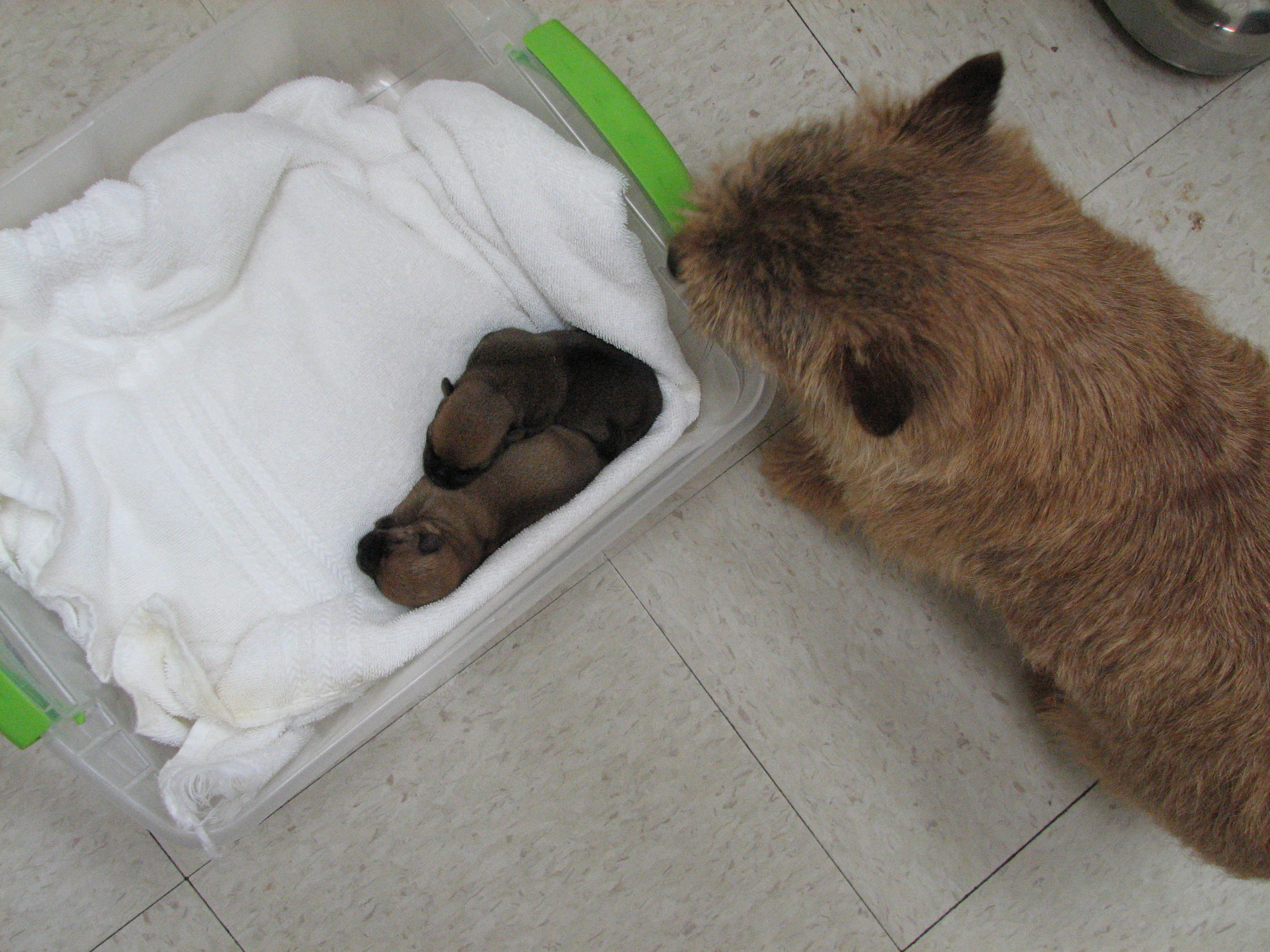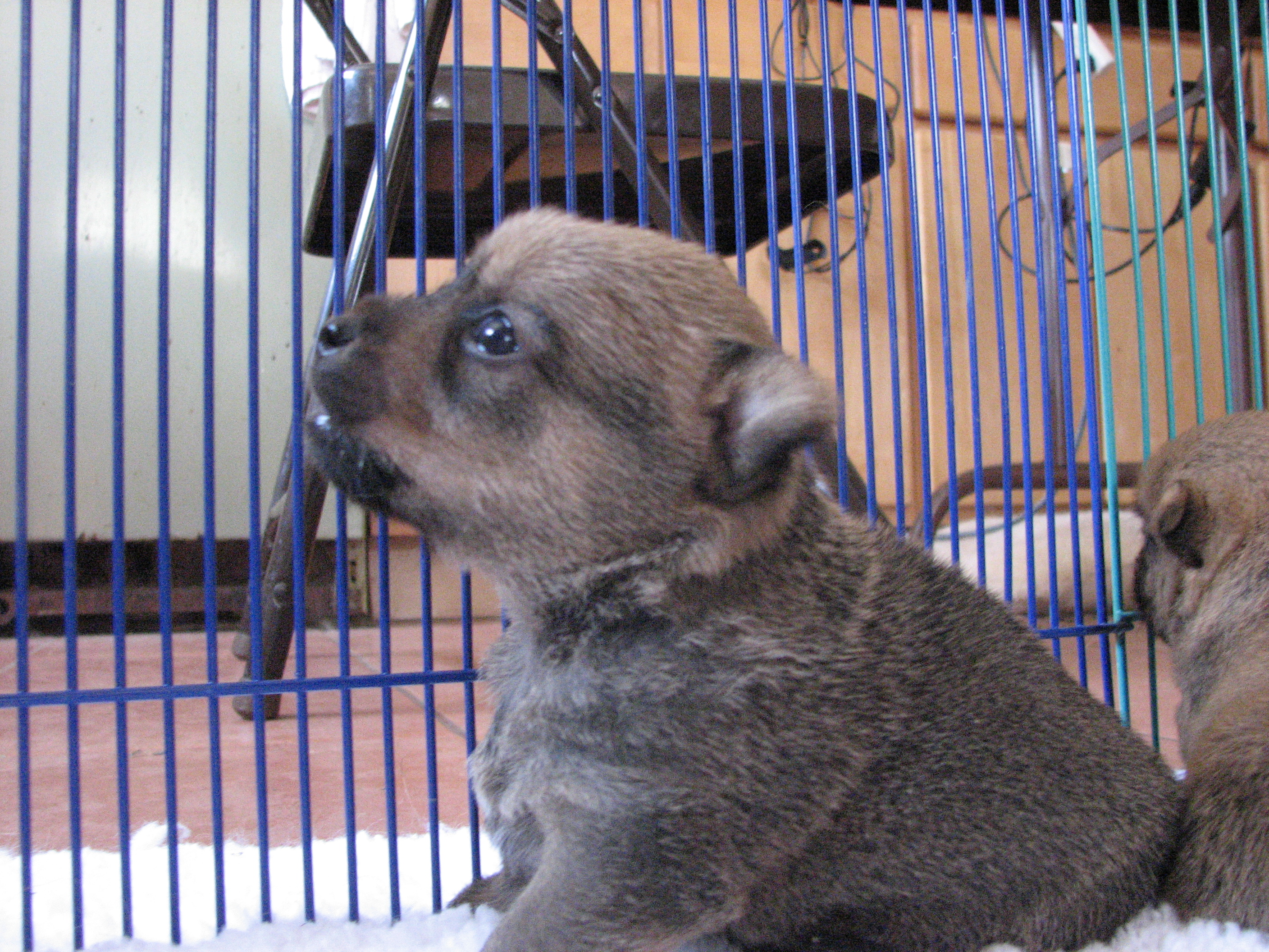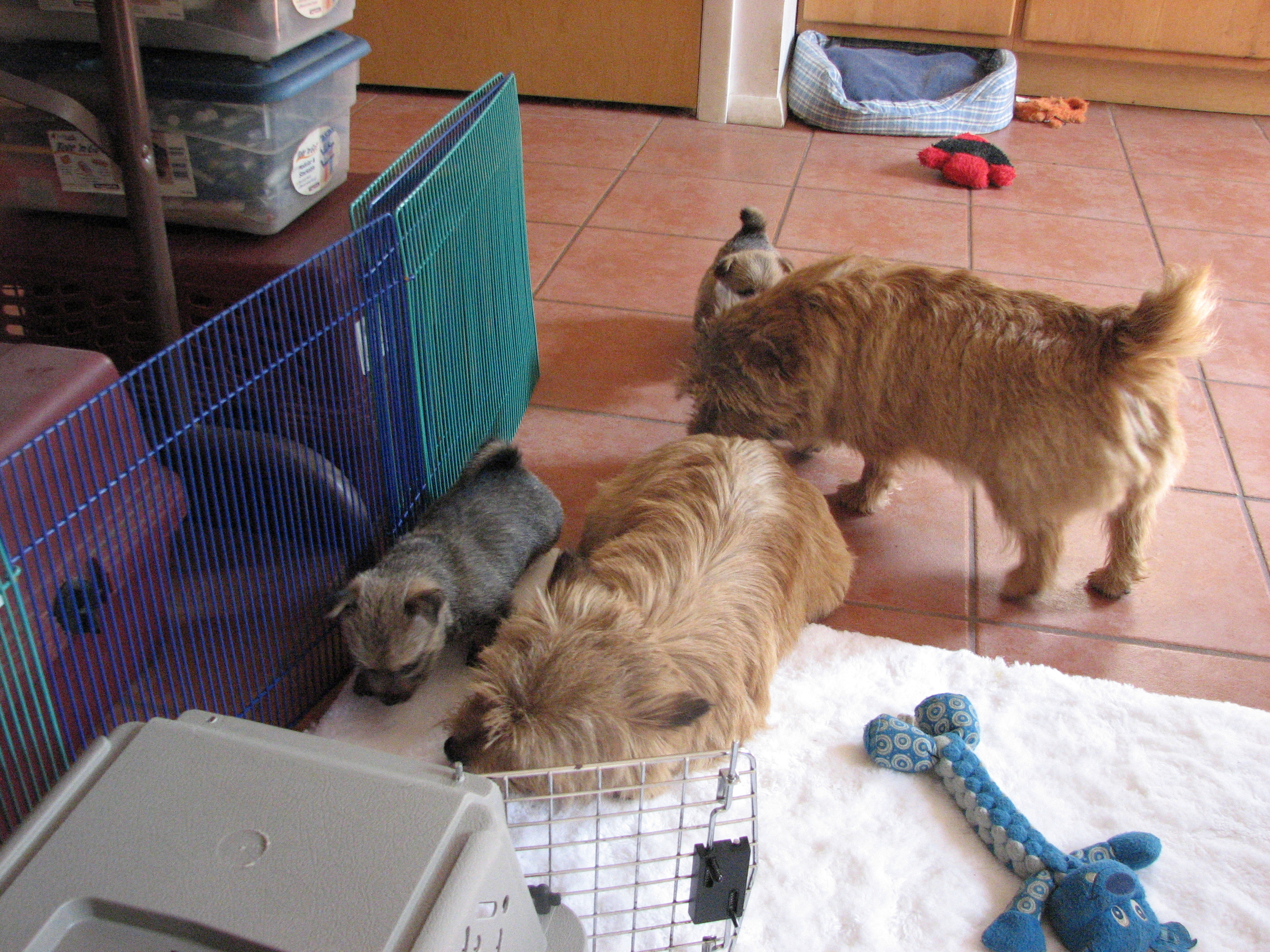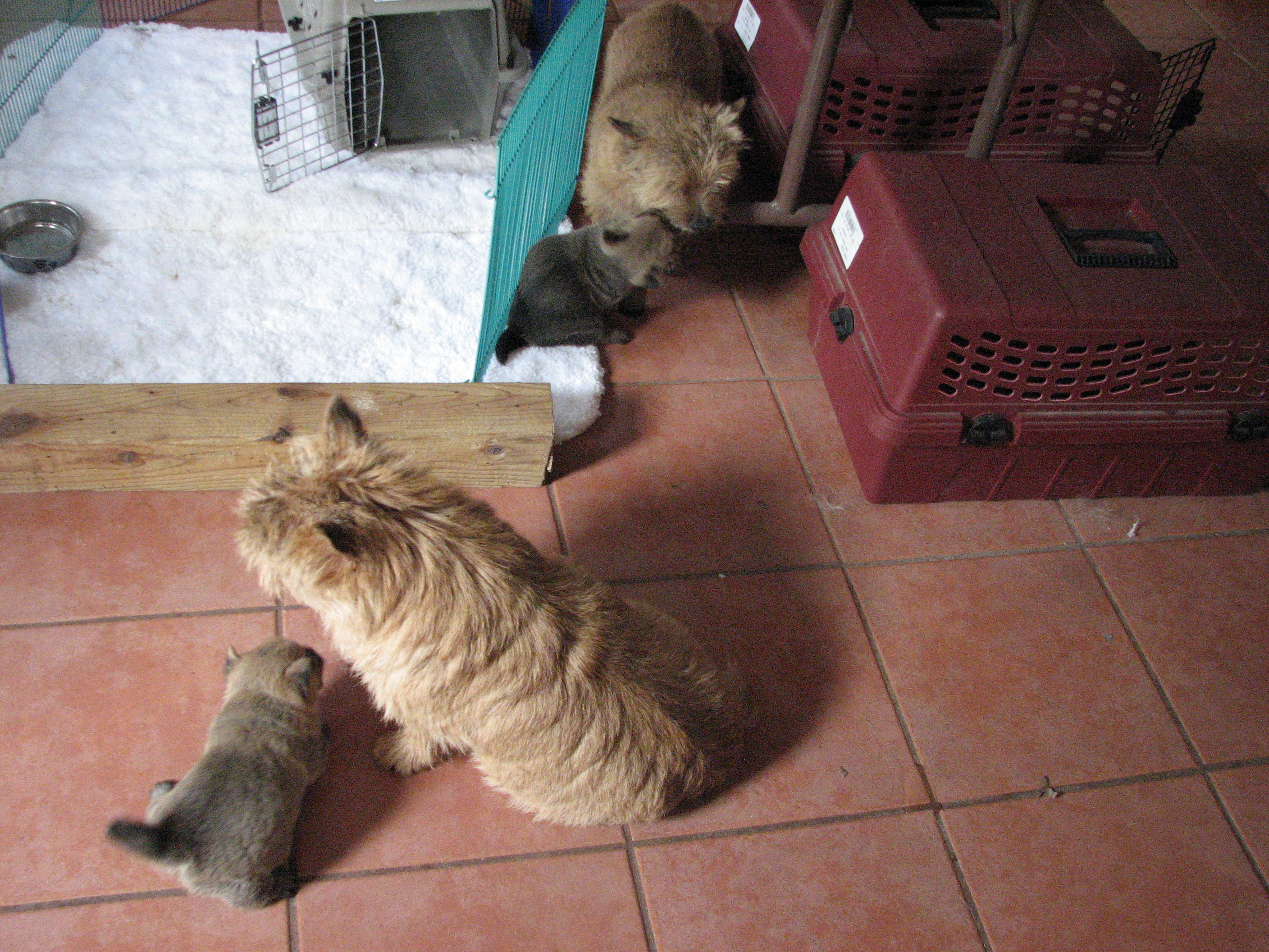 - Puppies investigating Mandy's crate.