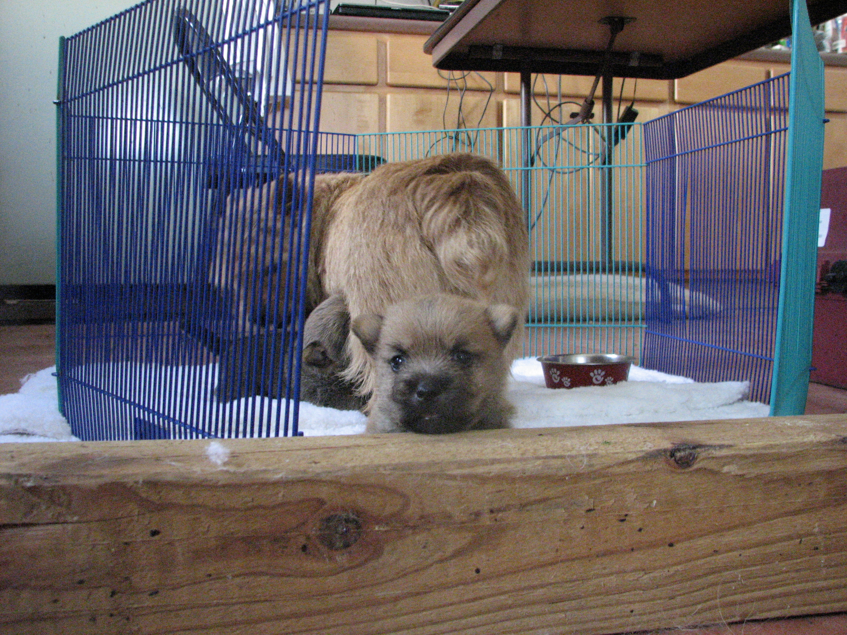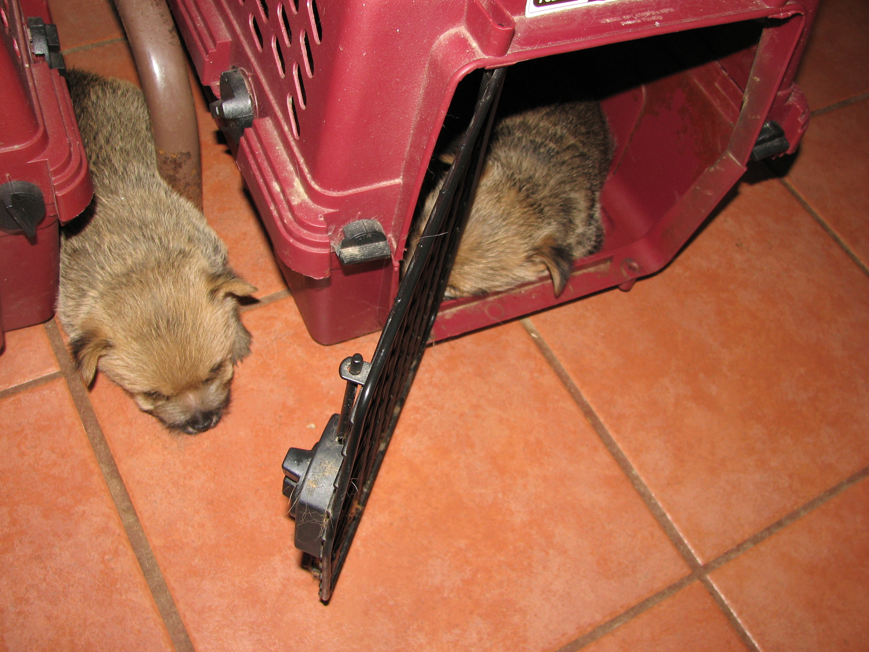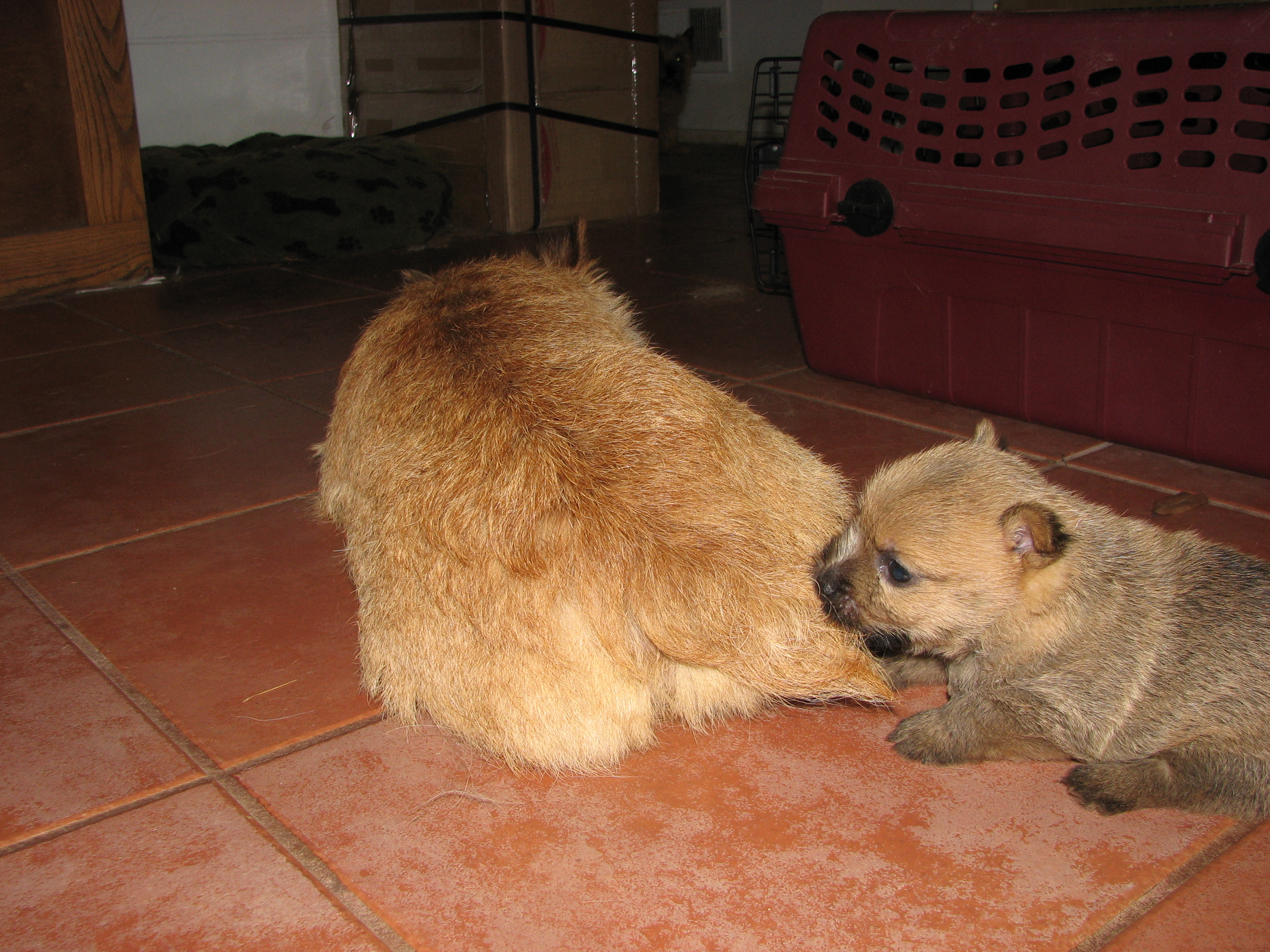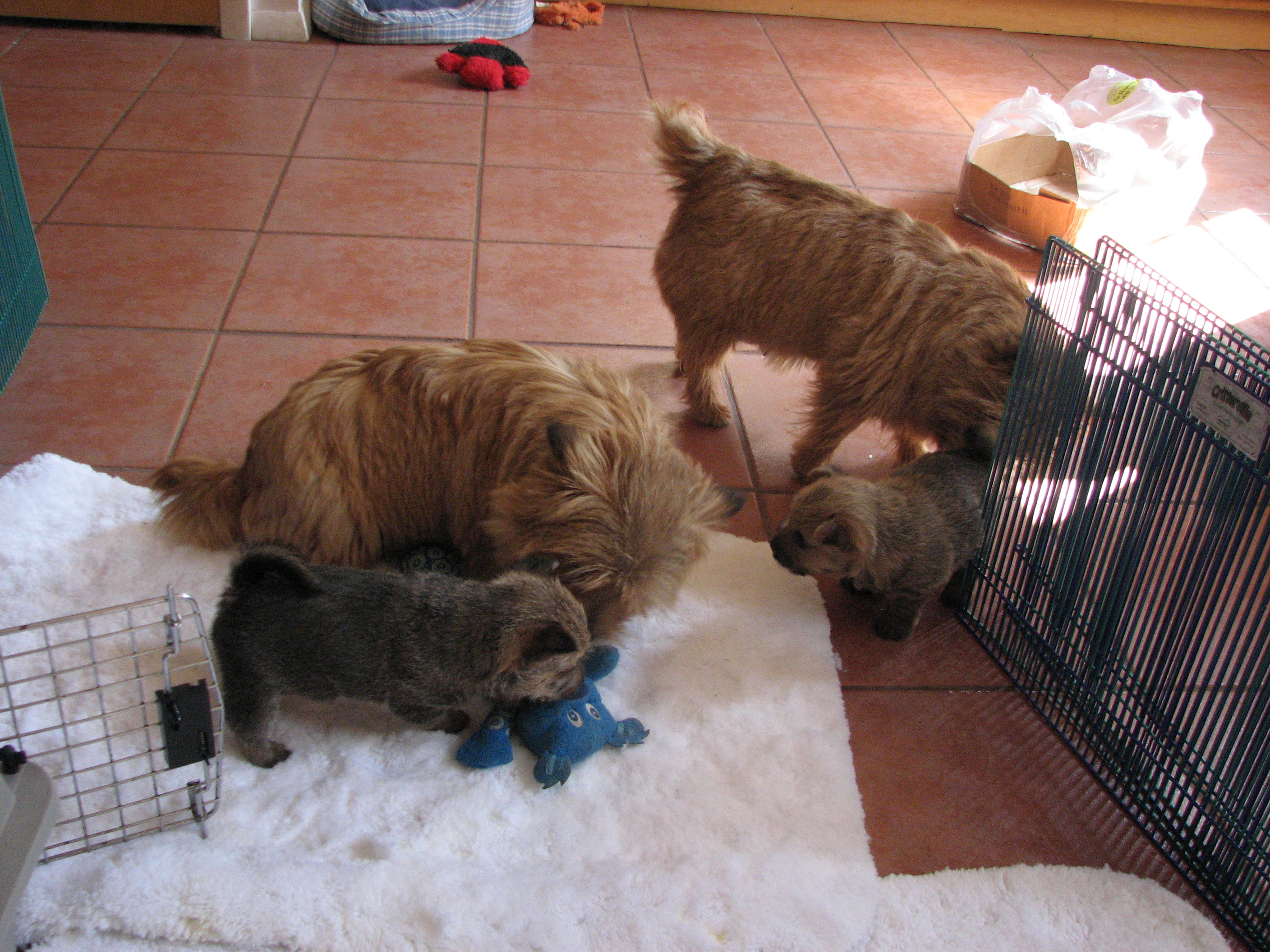 - Puppies investigating Mandy's crate.