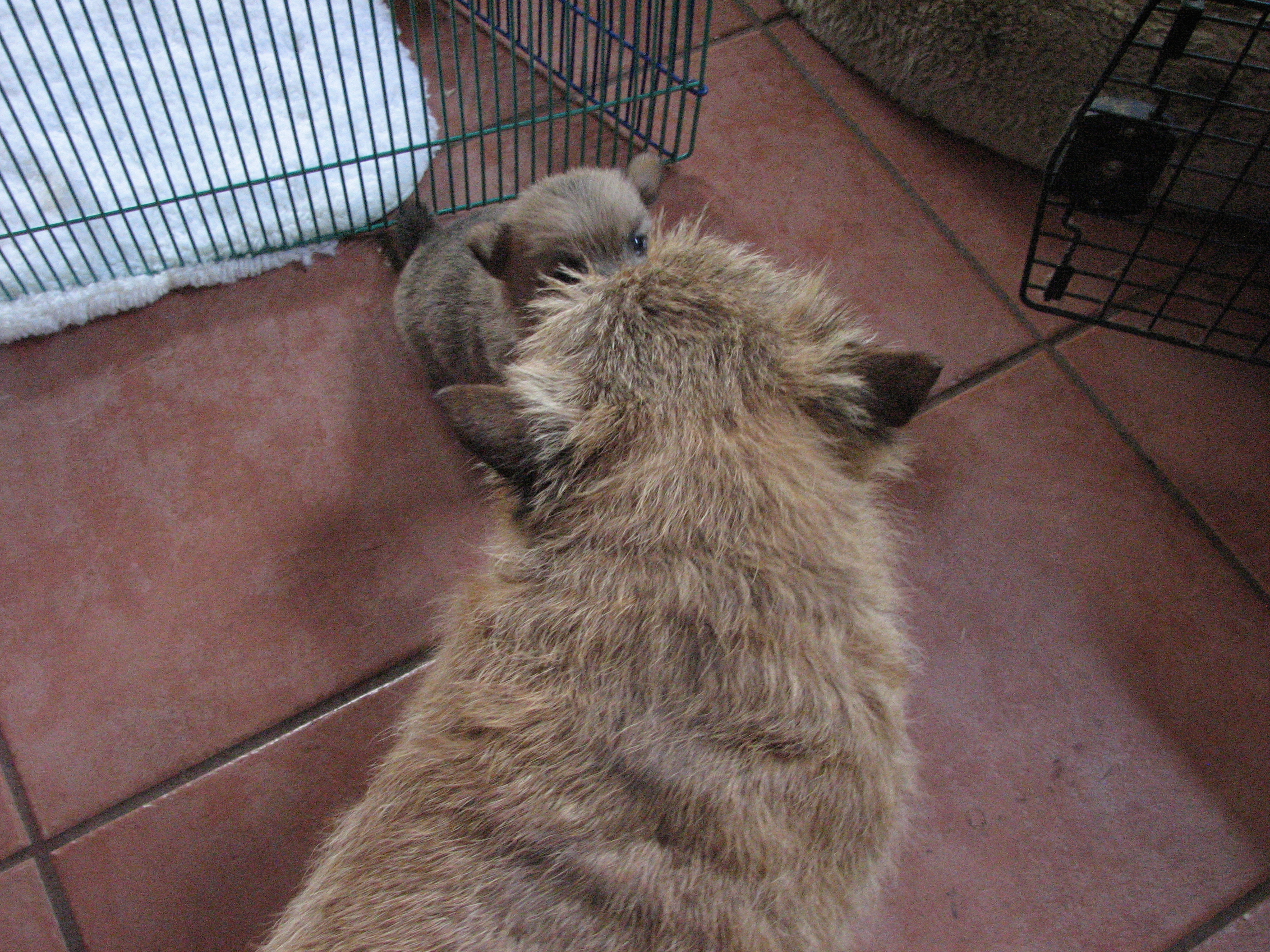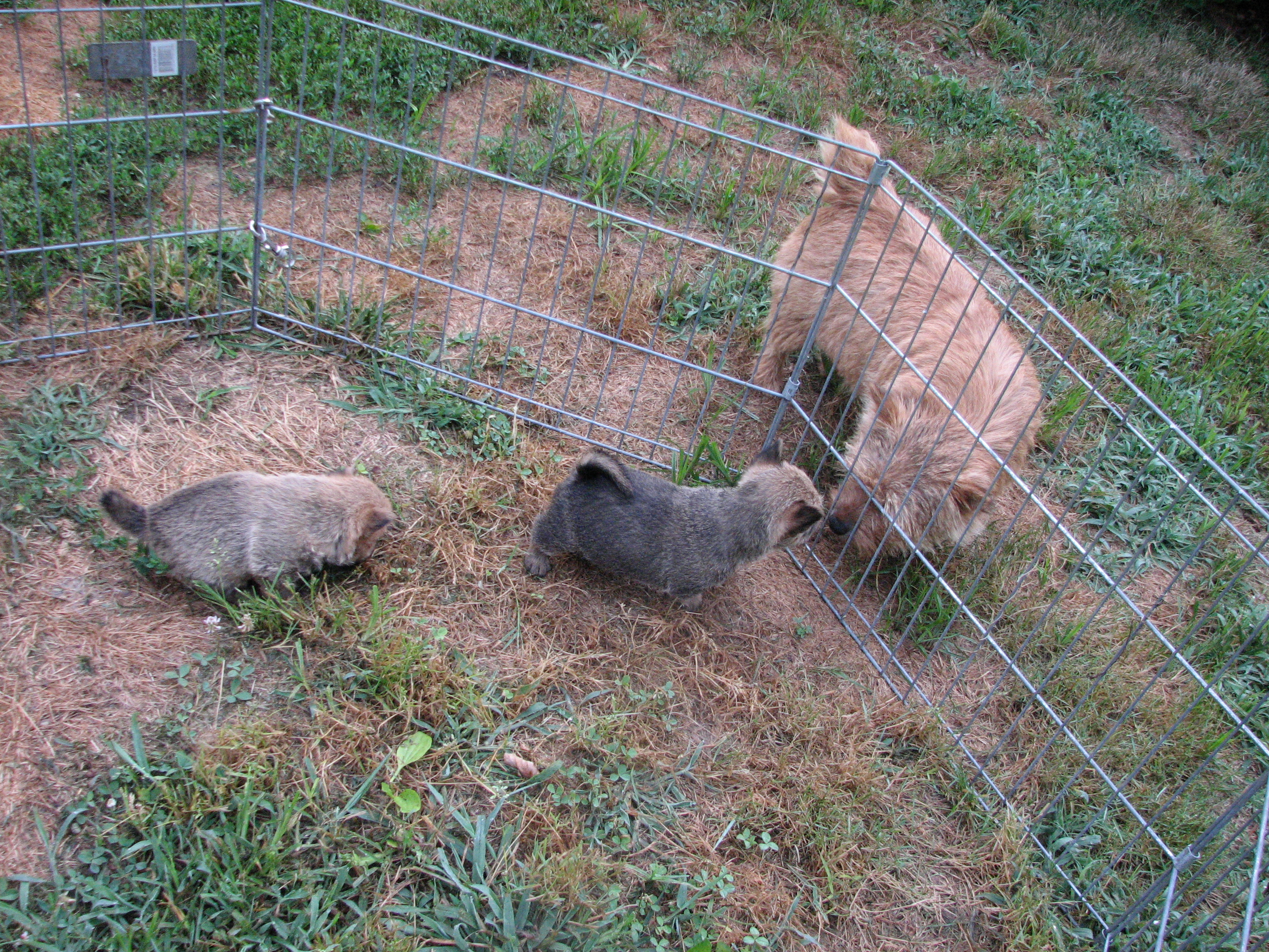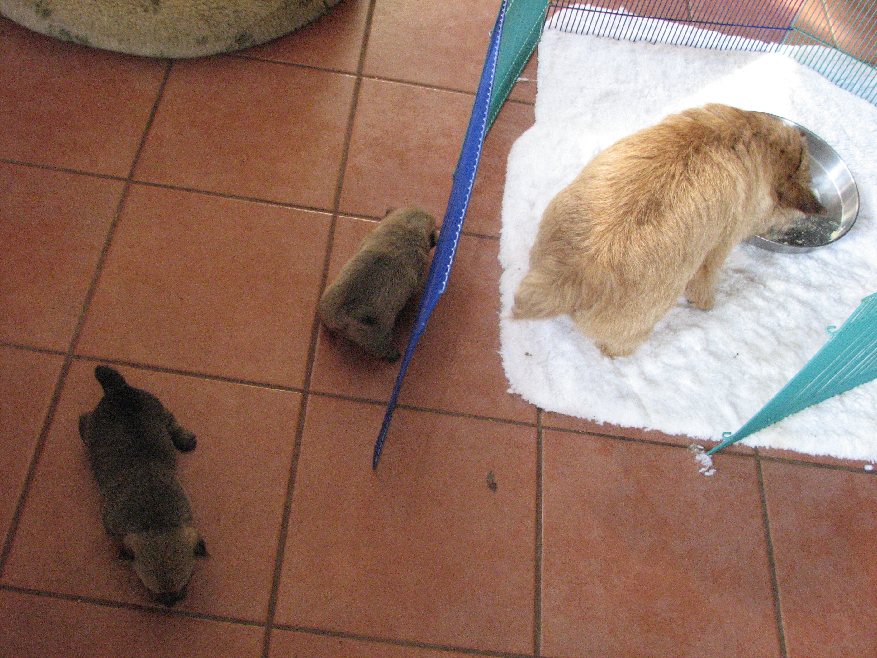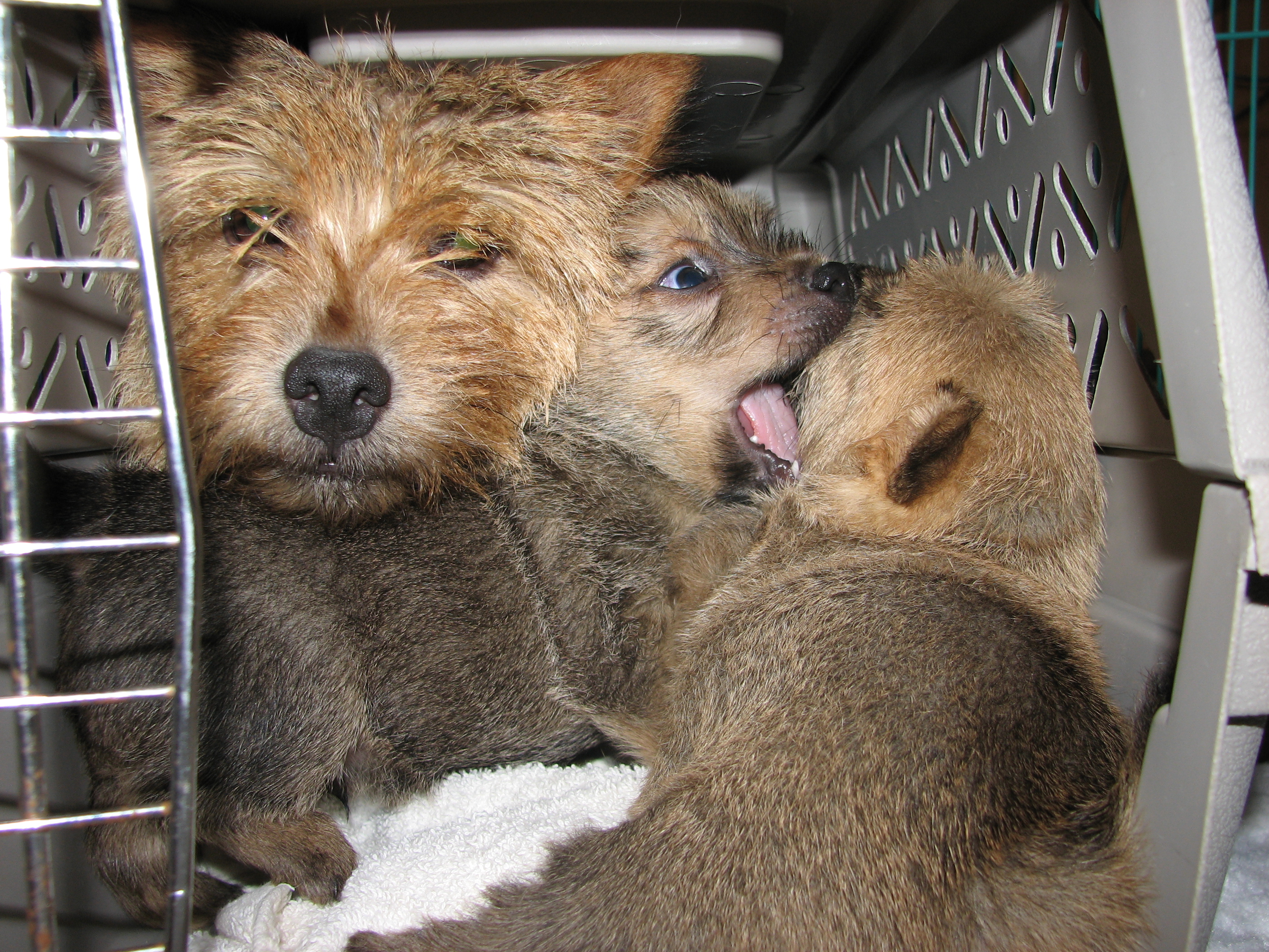 - Puppies investigating Mandy's crate.