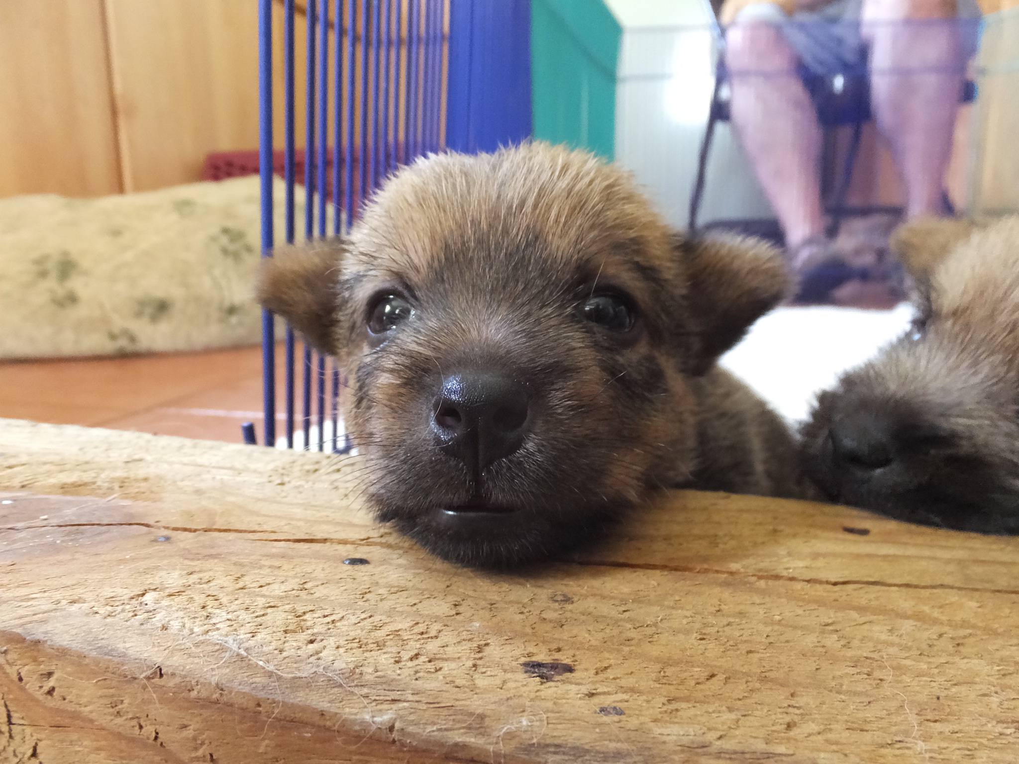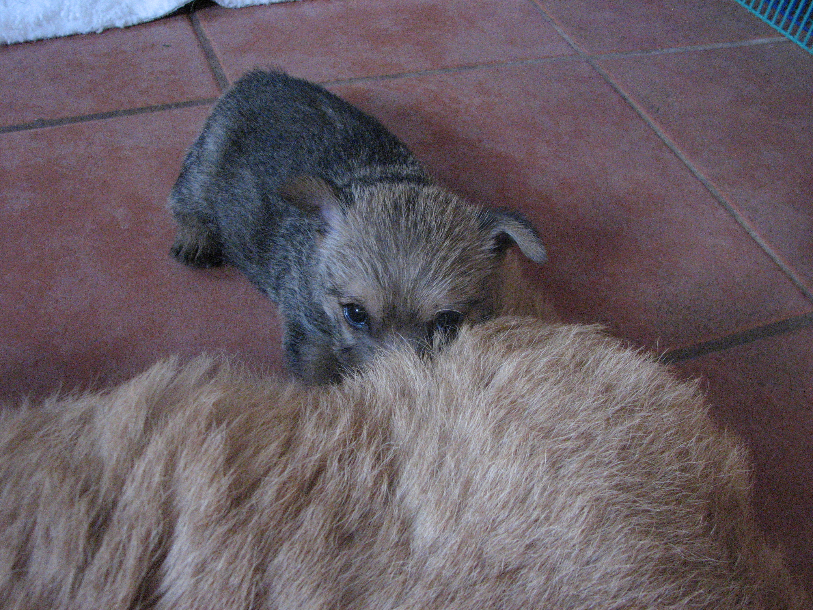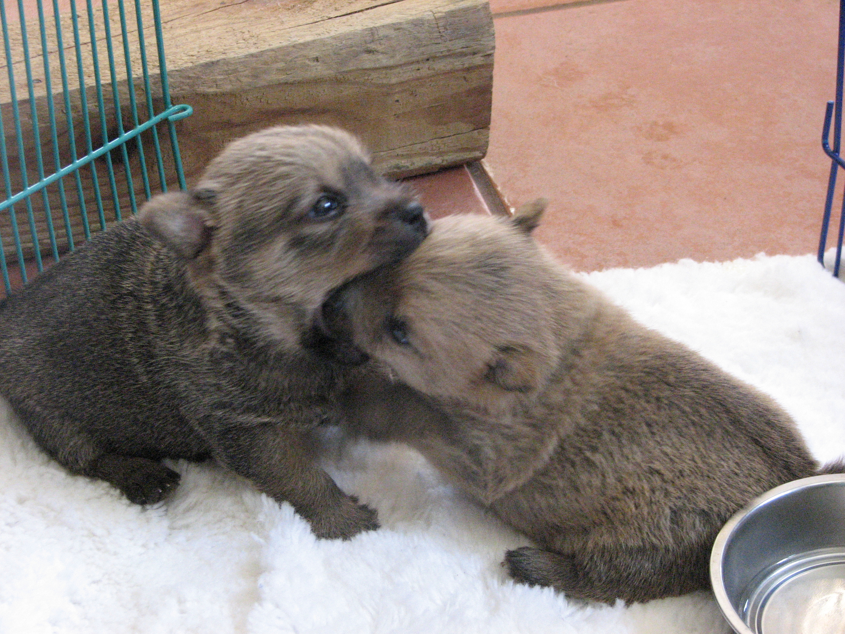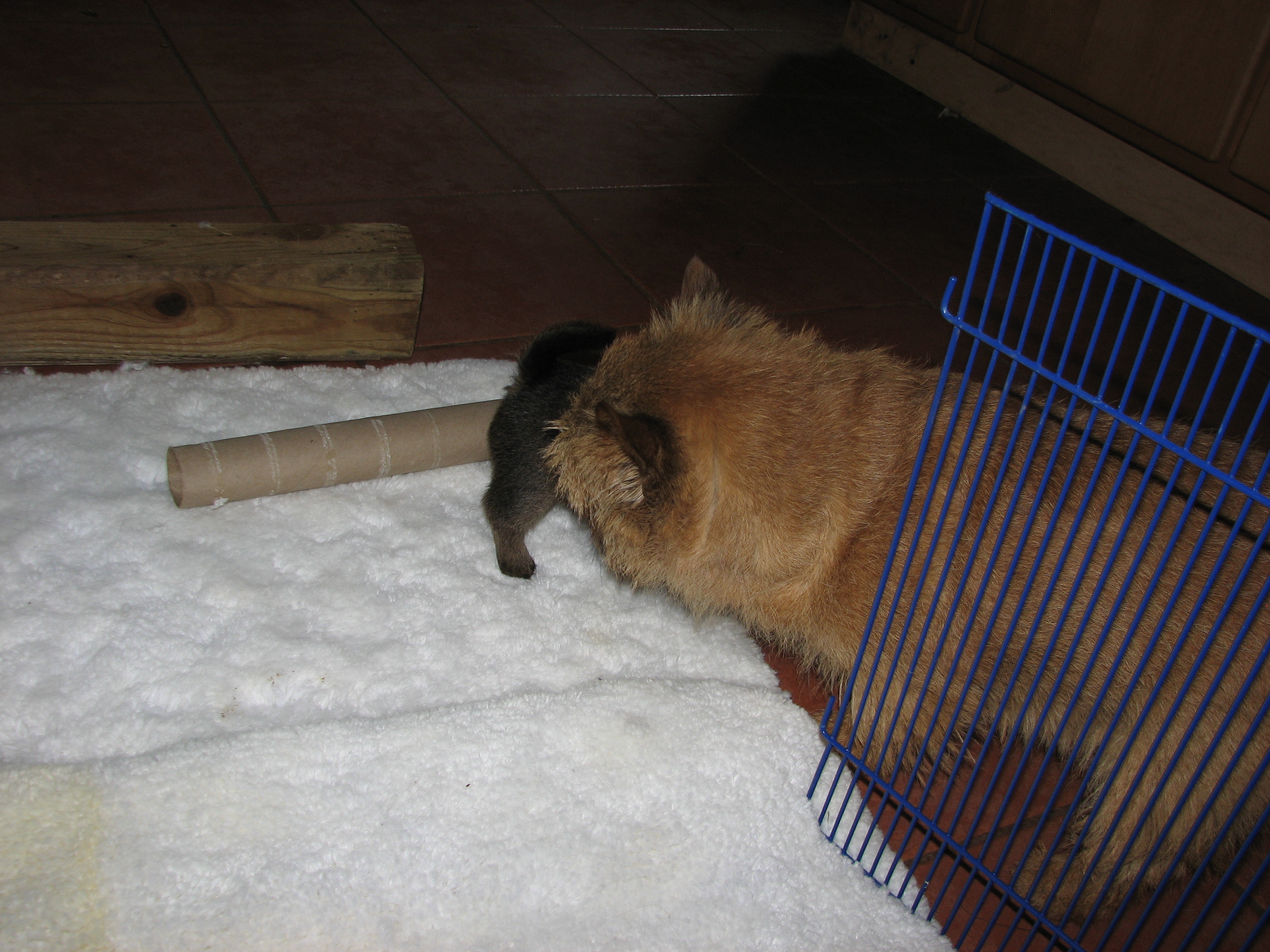 - Puppies investigating Mandy's crate.