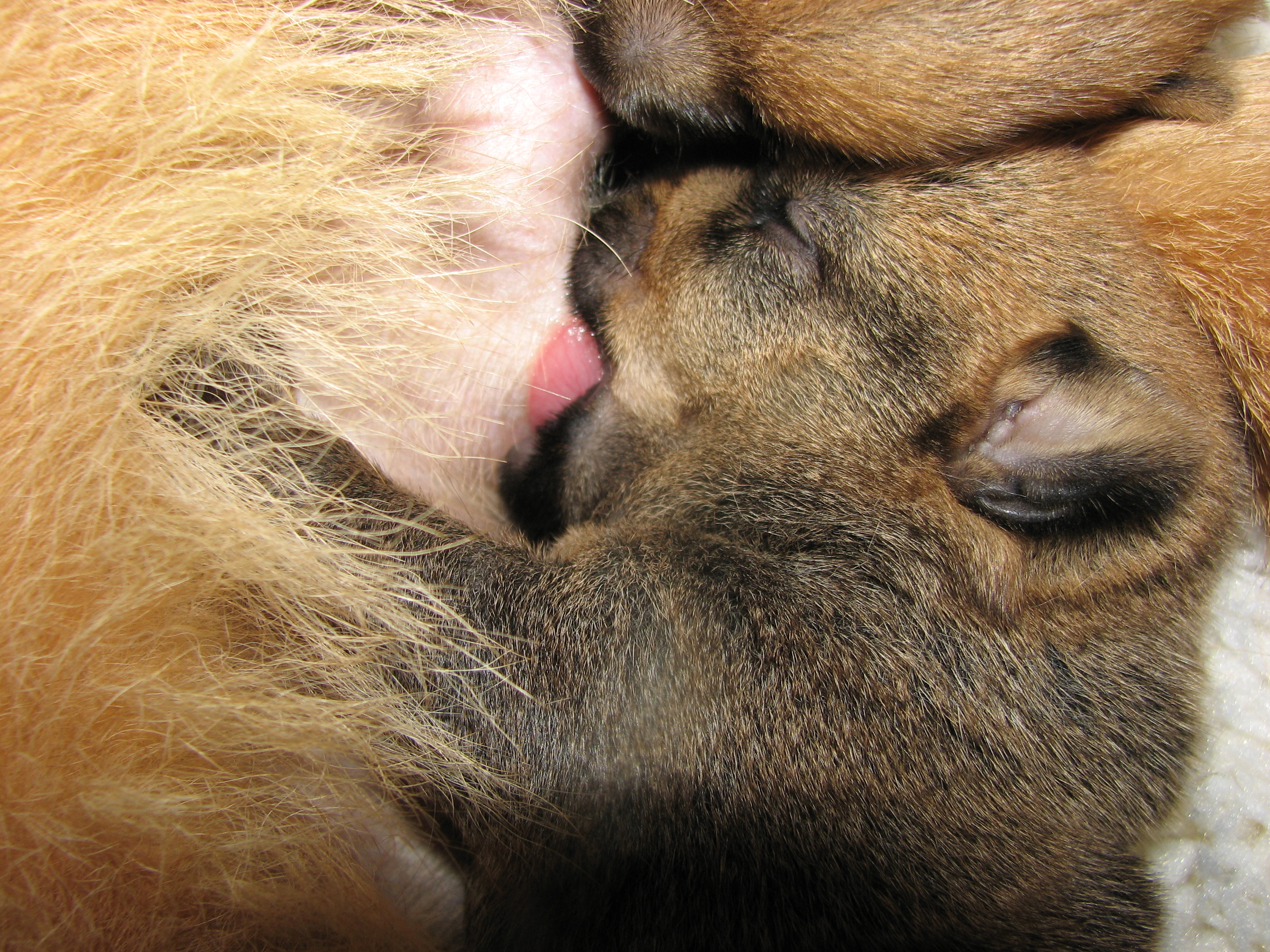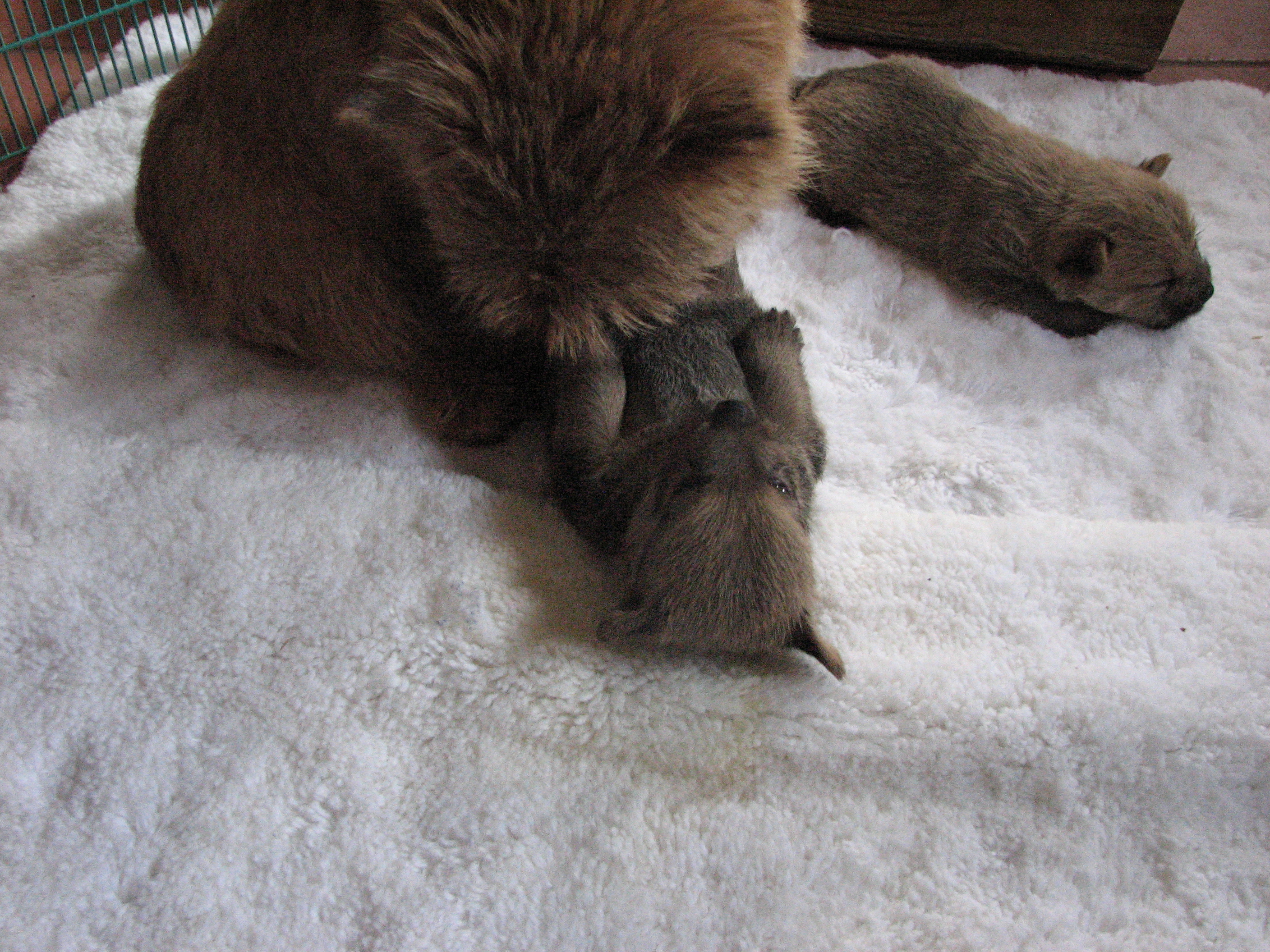 - Puppies pulling on mommy's fur.