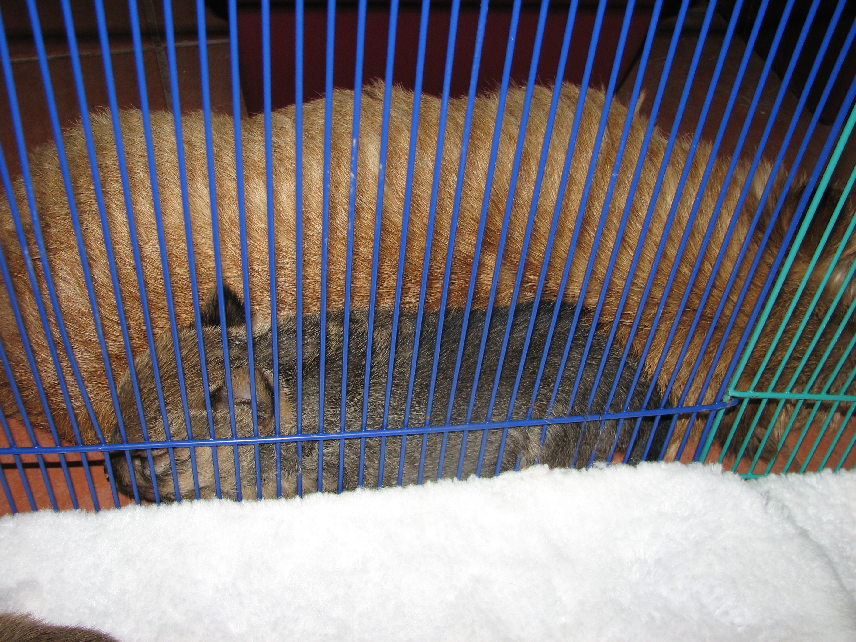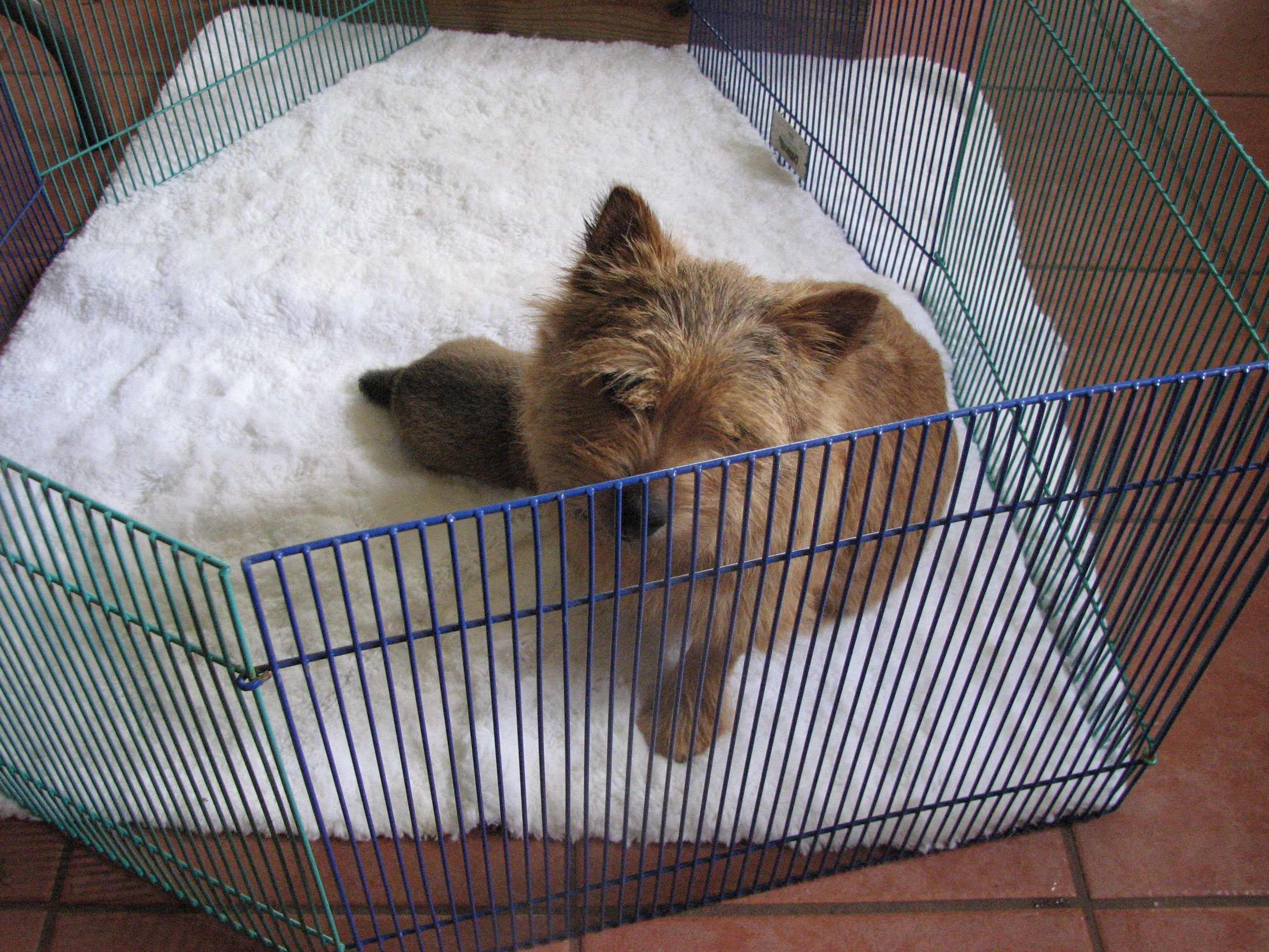 - Titus sleeping while squeezed between an x-pen
