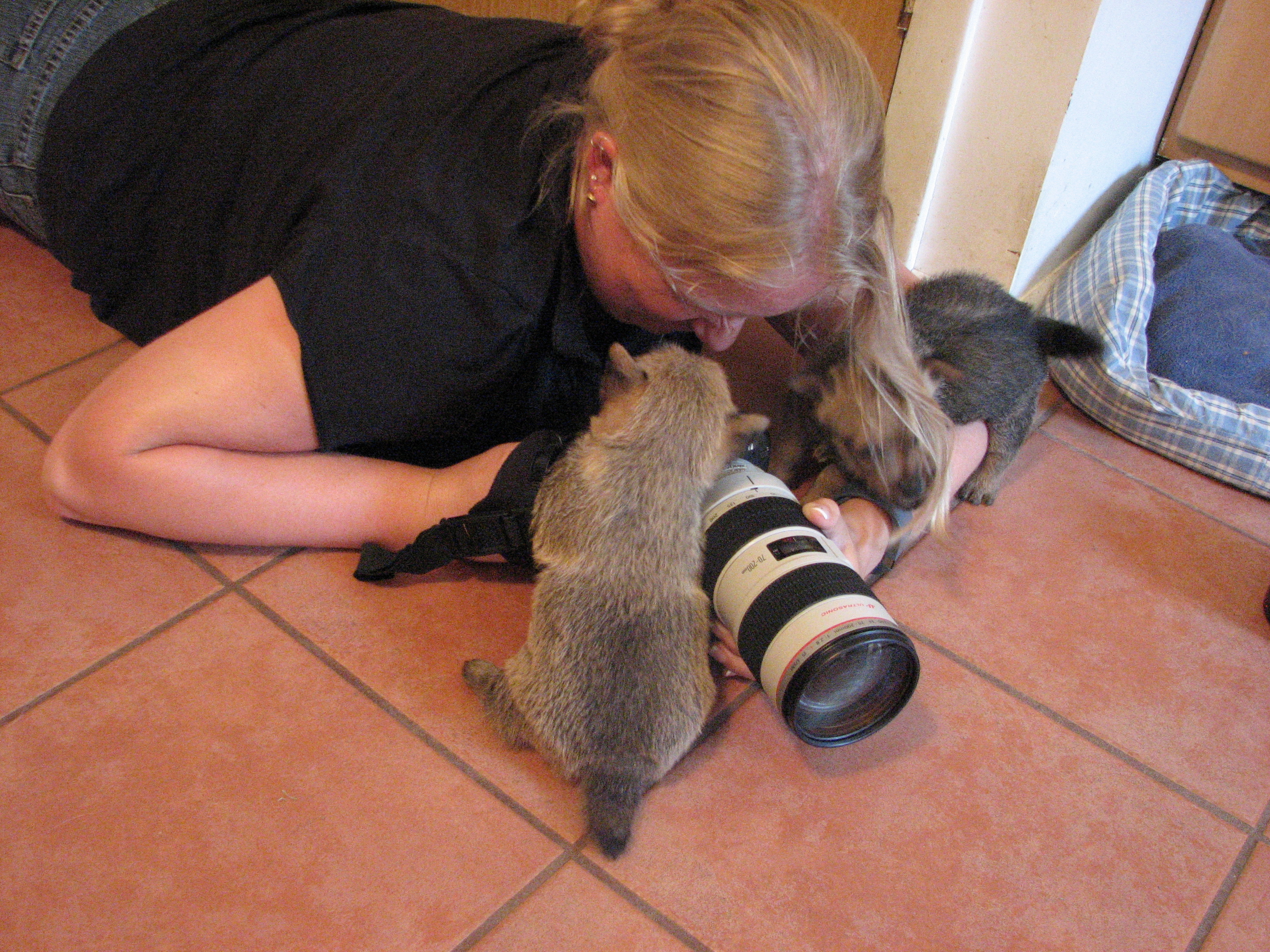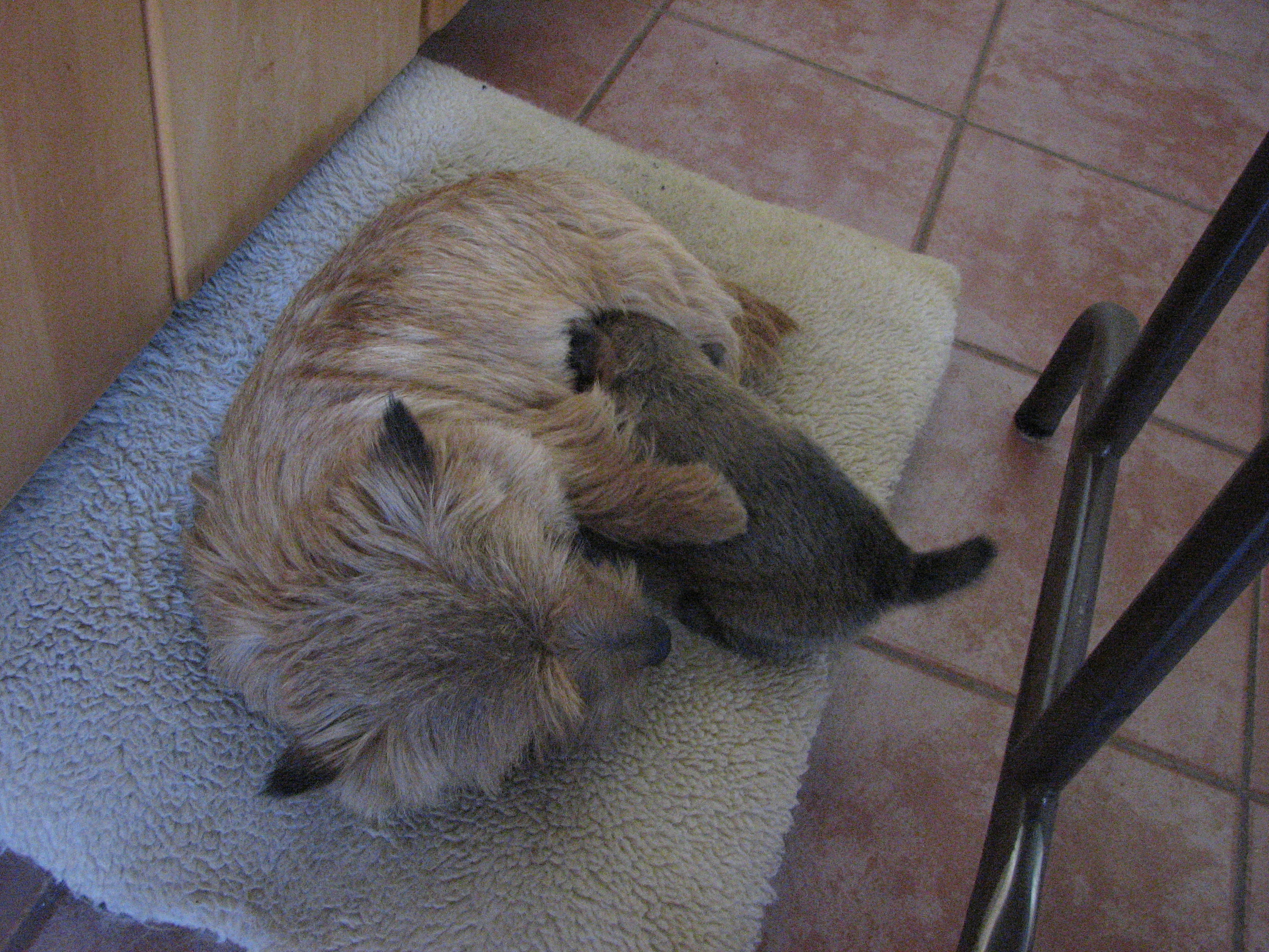 Tami biting mommy's tail.
