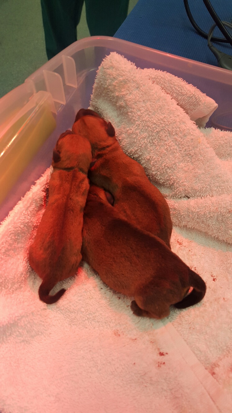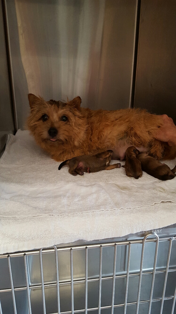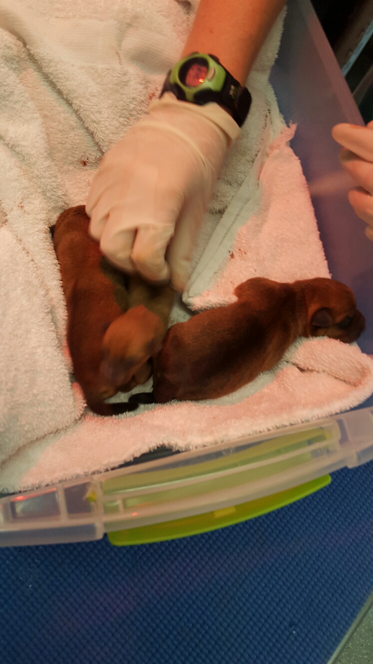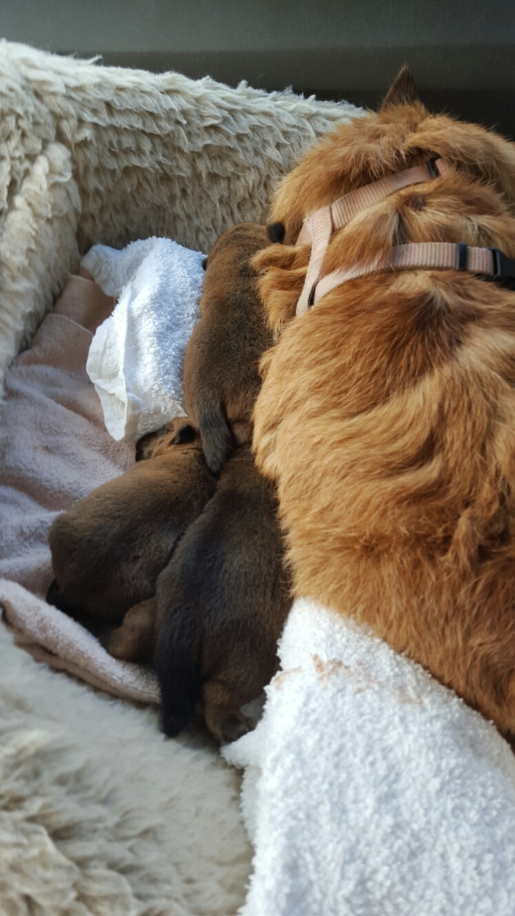 Before we left NC State, the puppies were put on Paige to nurse. Paige was still pretty groggy at this point.