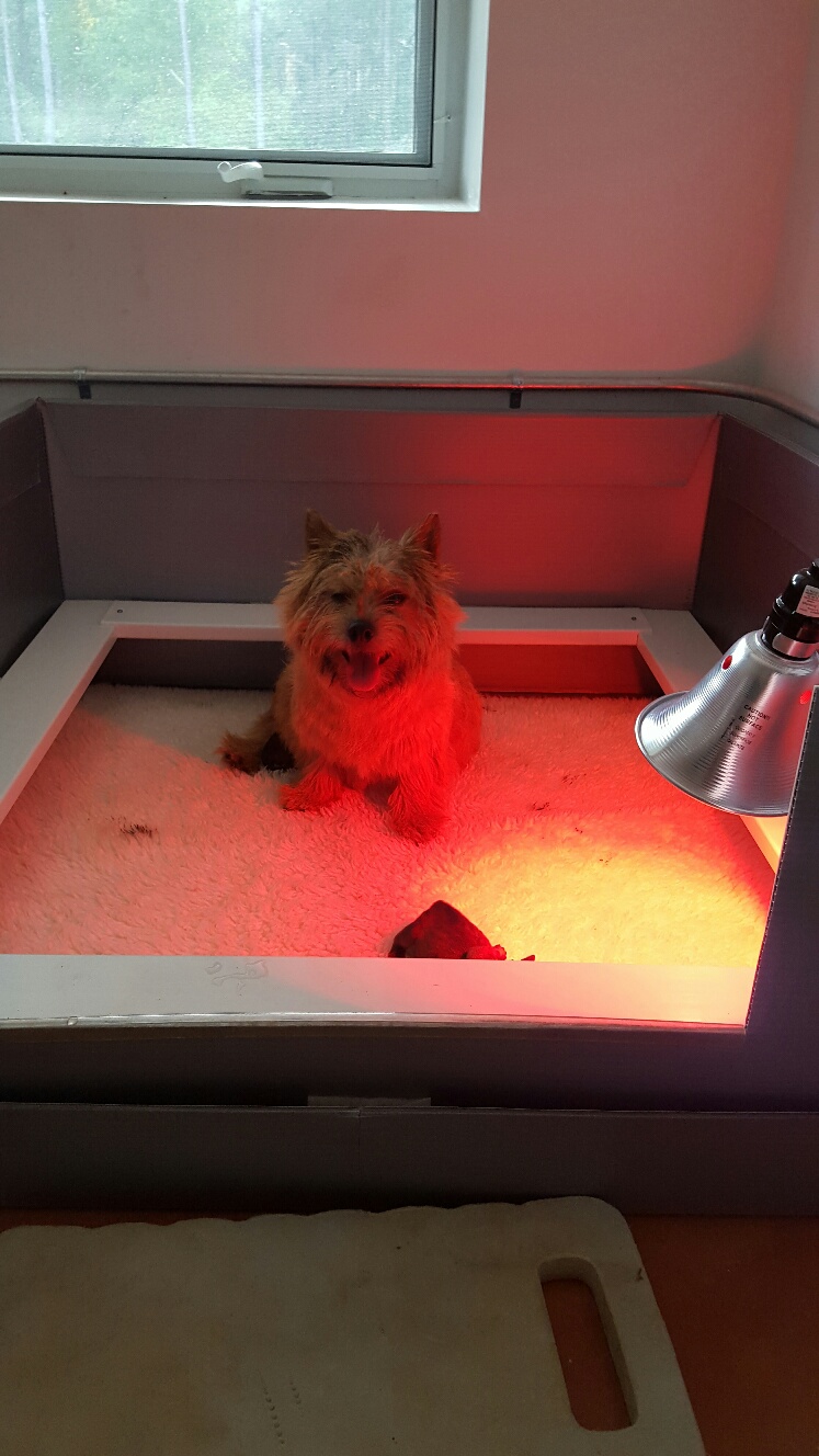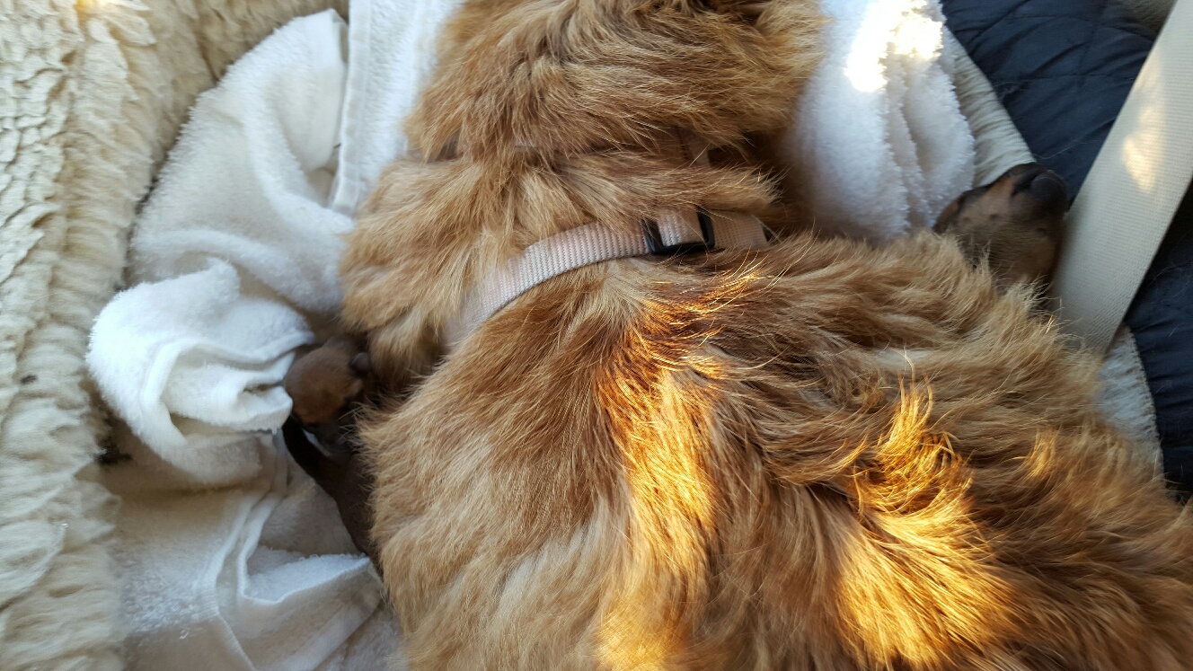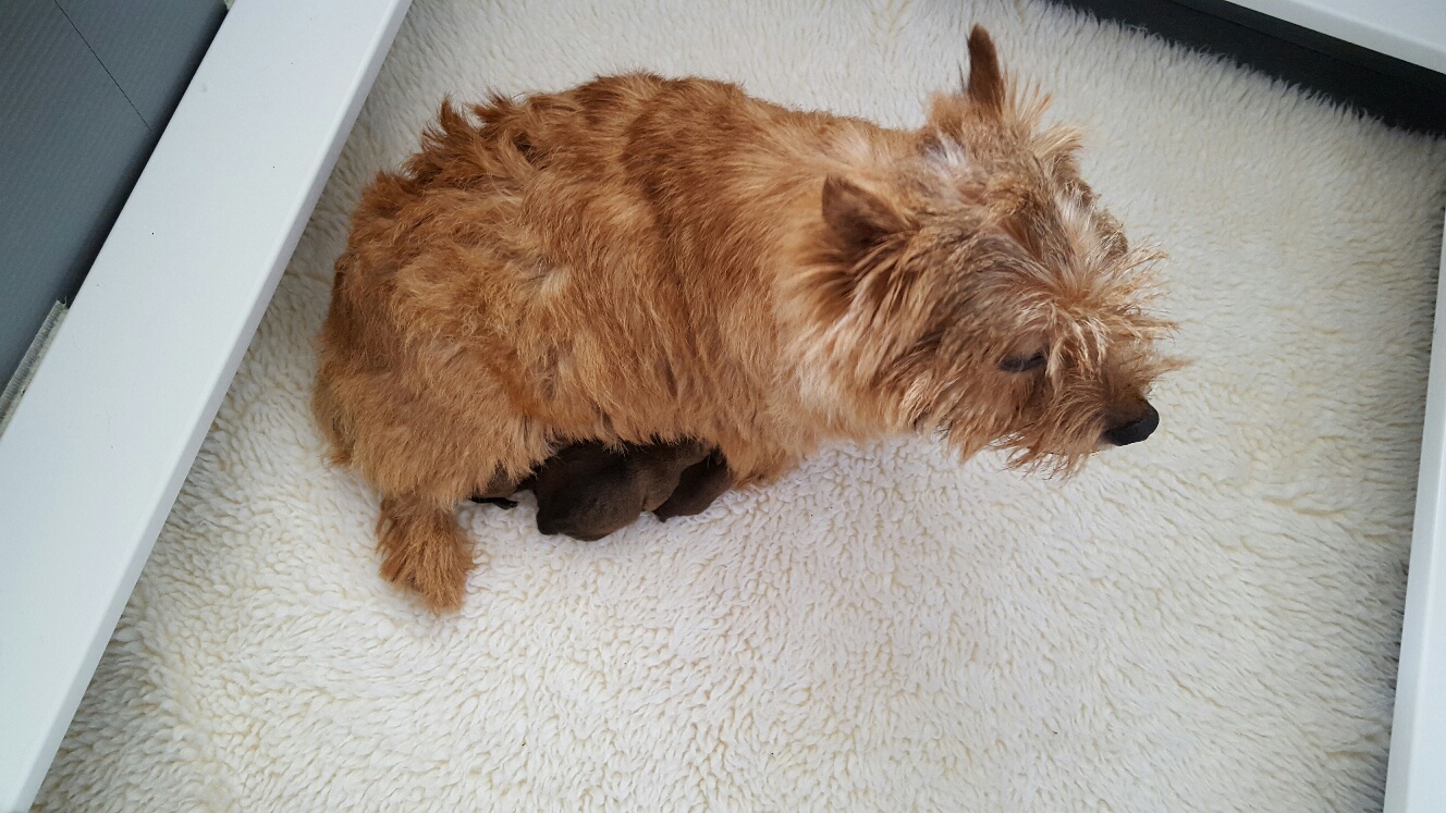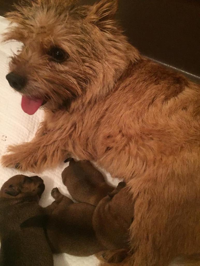 Before we left NC State, the puppies were put on Paige to nurse. Paige was still pretty groggy at this point.