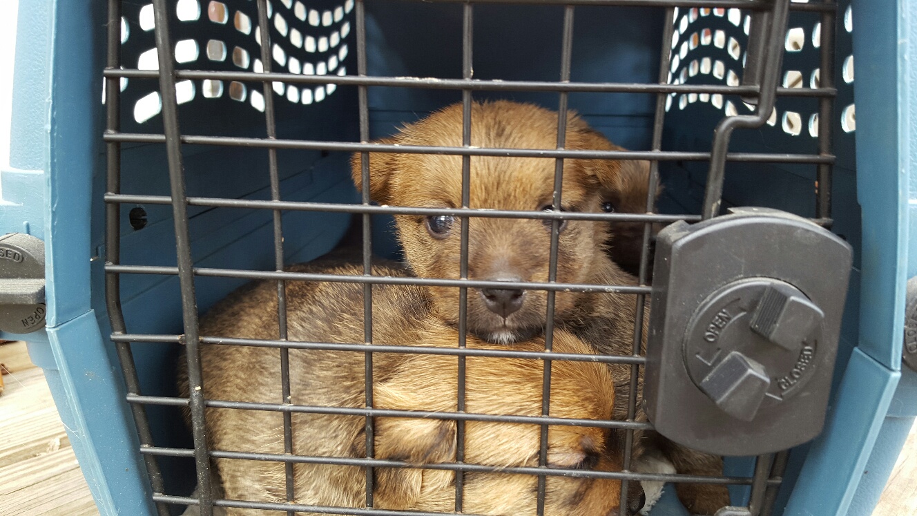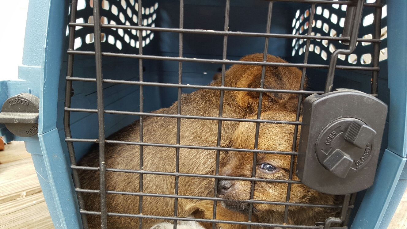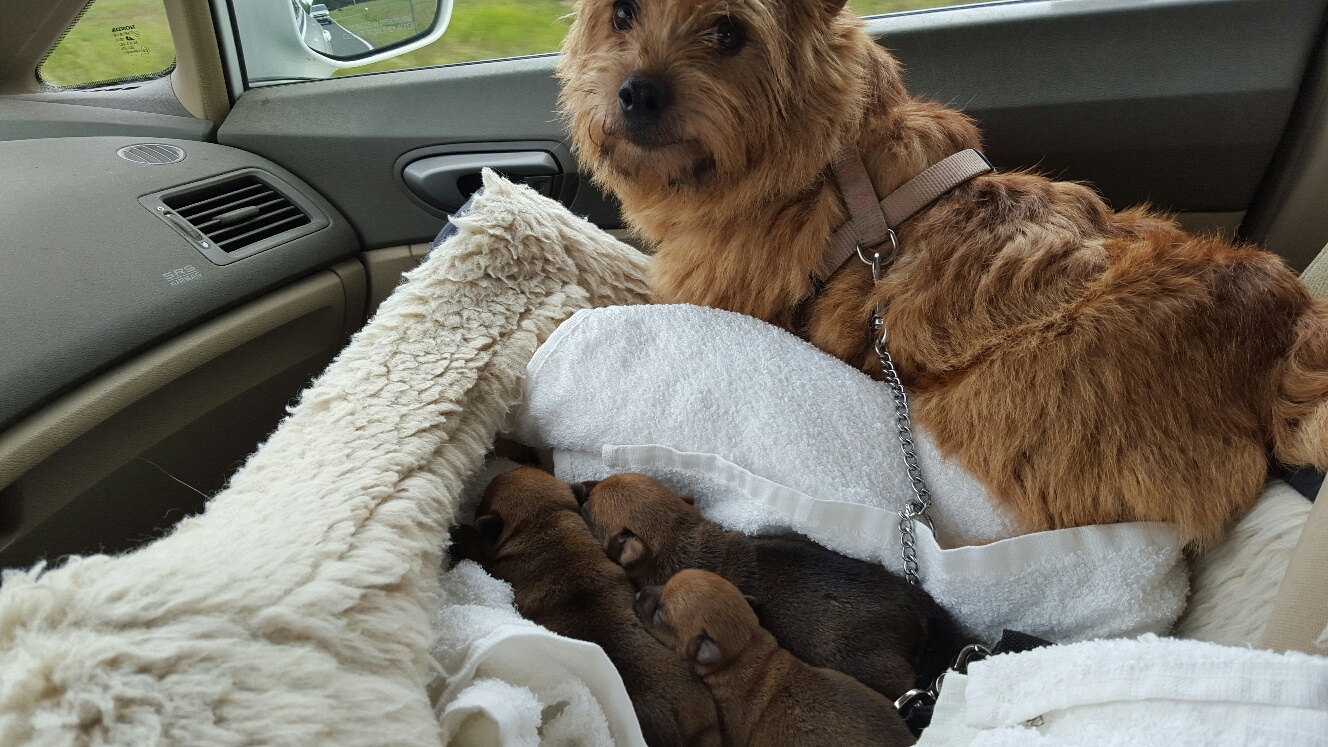 Today the puppies had their first long car ride ... from North Carolina to Maryland. The reason for the trip was so that some of my dogs (which included Paige and her puppies) could stay with a friend in Maryland, while I (and some of my other dogs) could travel to the Montgomery Terrier Agility Cluster in Pennsylvania. The puppies were good travellers in their crate.