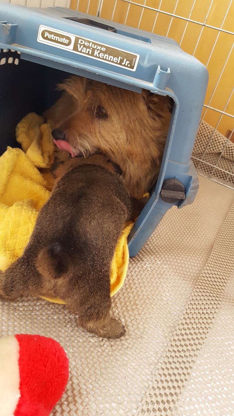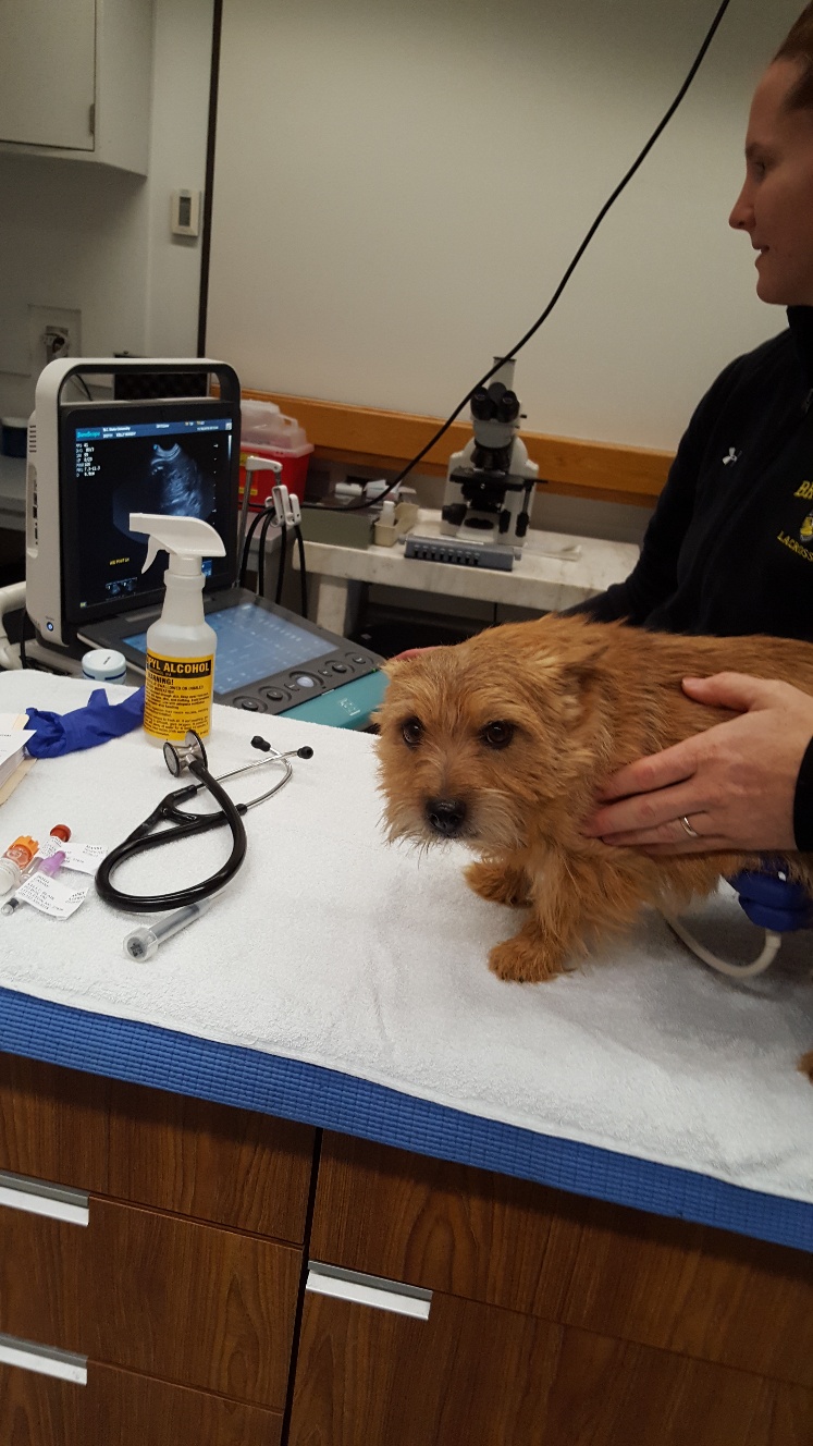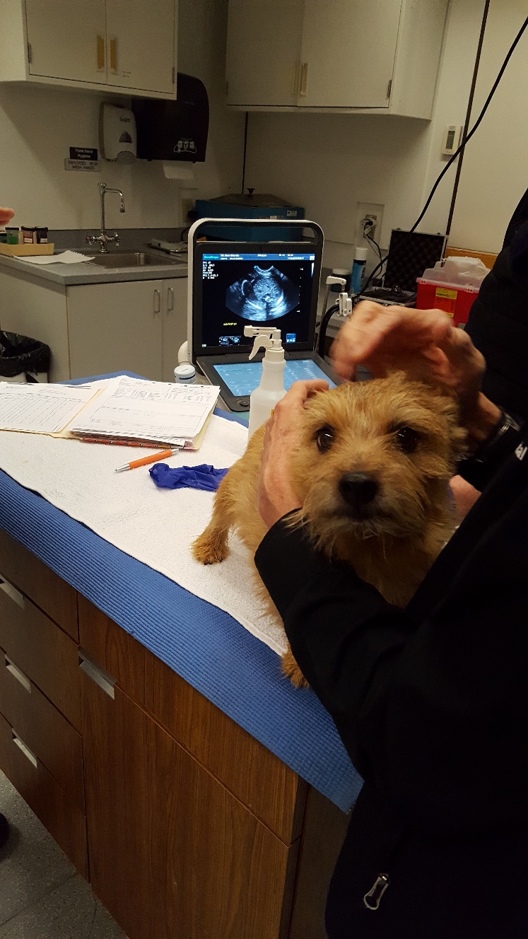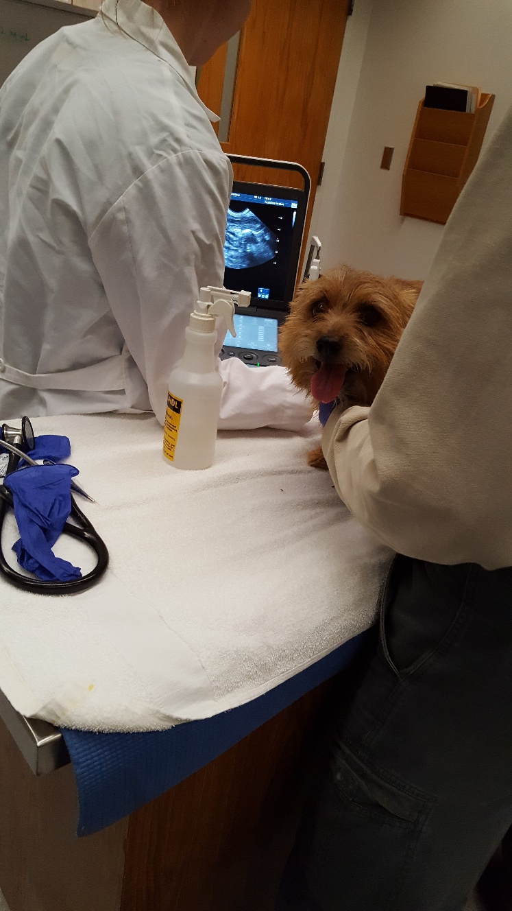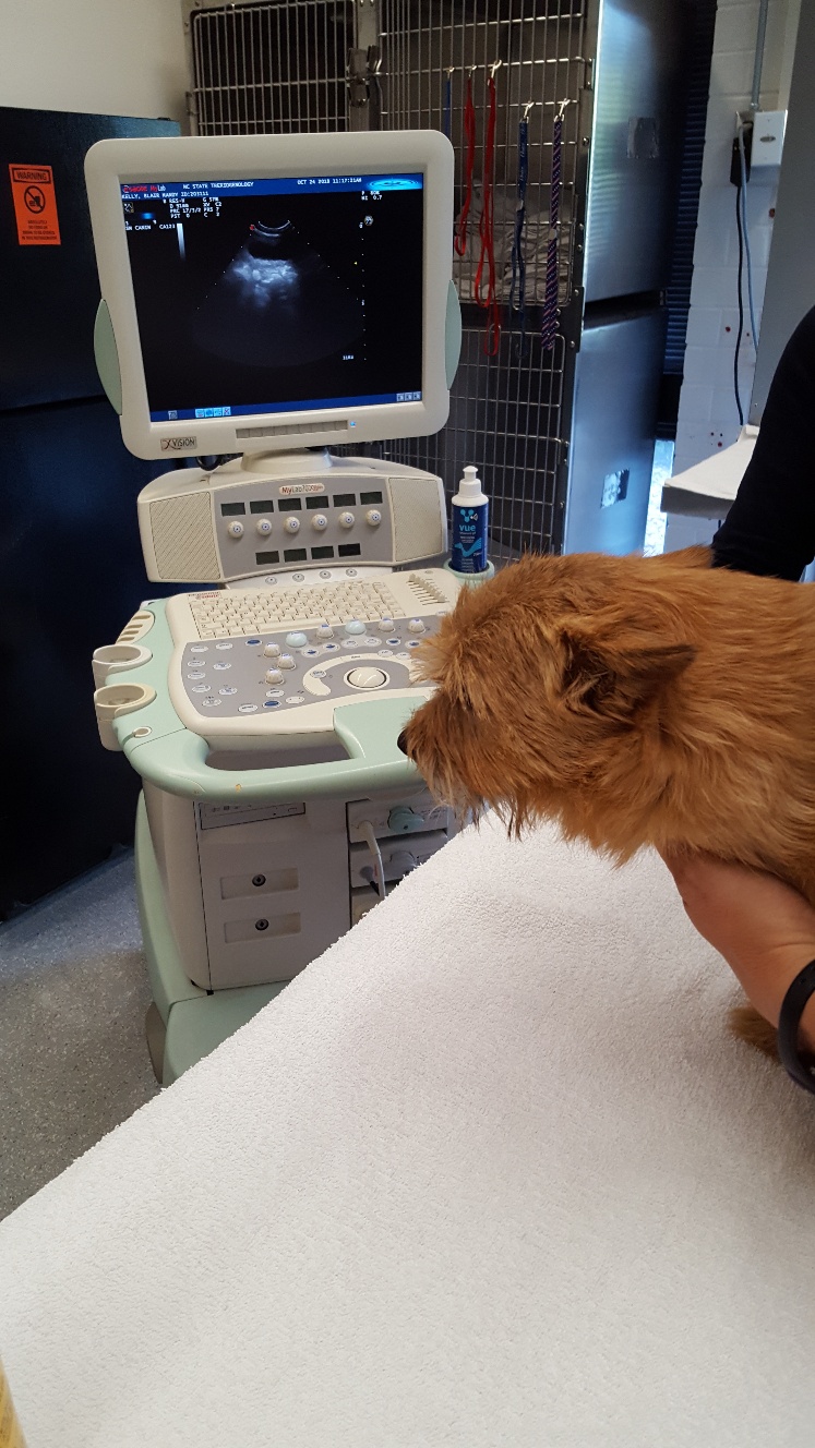 At NC State, the repro vets carefully checked Mandy's incision and nipples. Everything looked fine. Next, was an ultrasound. The ultrsound showed that Mandy had some fluid in her uterus, and that the uterus had not shrunk normally. Mandy was given a shot of oxytocin for her uterus. Next, Mandy had a blood draw to check her blood chemistry. Then we had to wait for the blood results. While waiting, the puppy got checked out. Another picture of the puppy. While waiting, Mandy continued to keep the puppy clean.