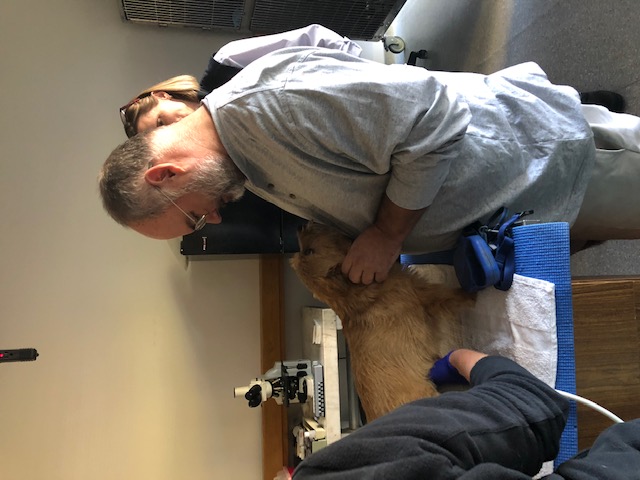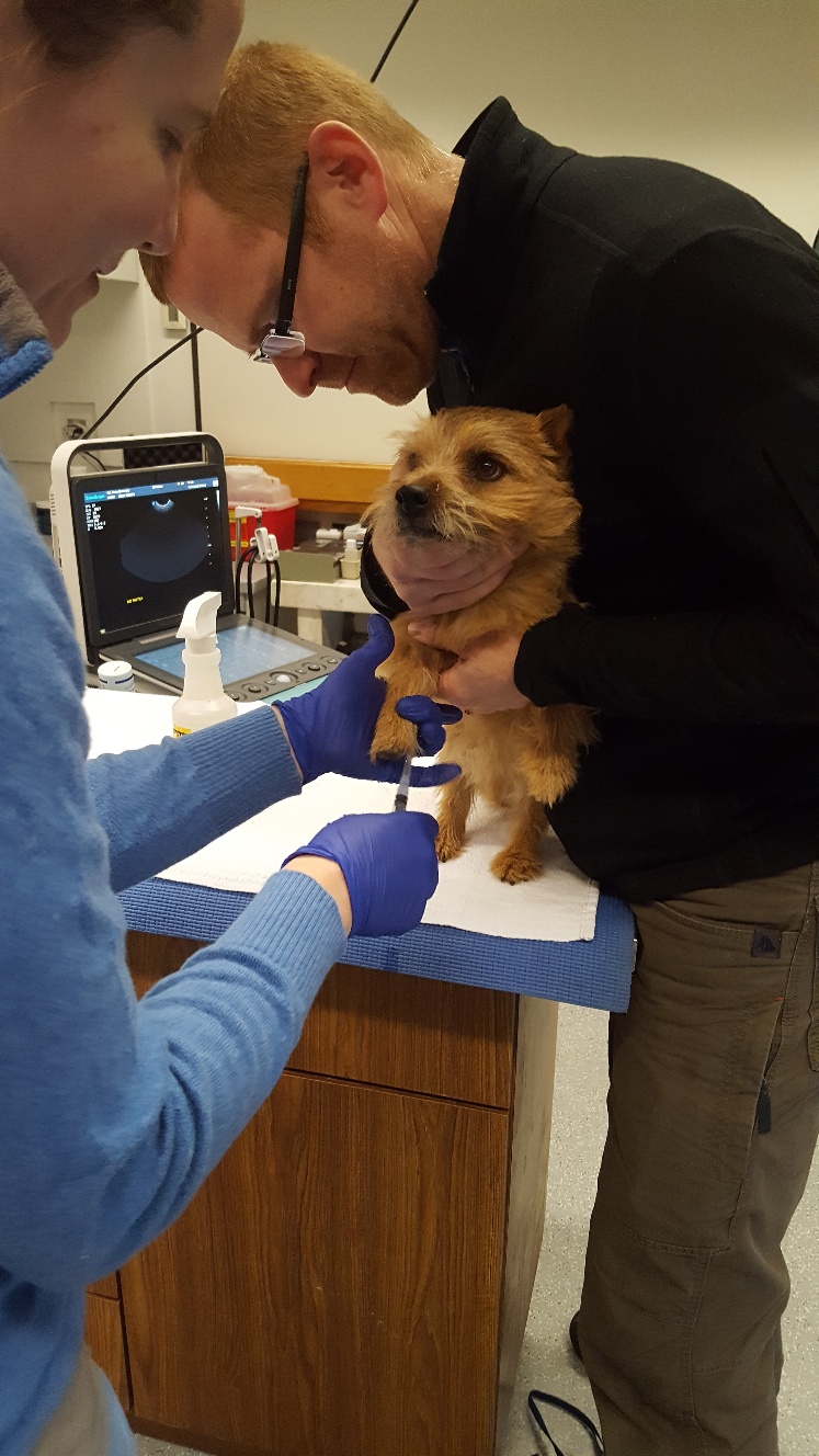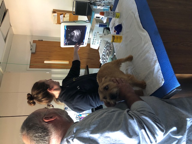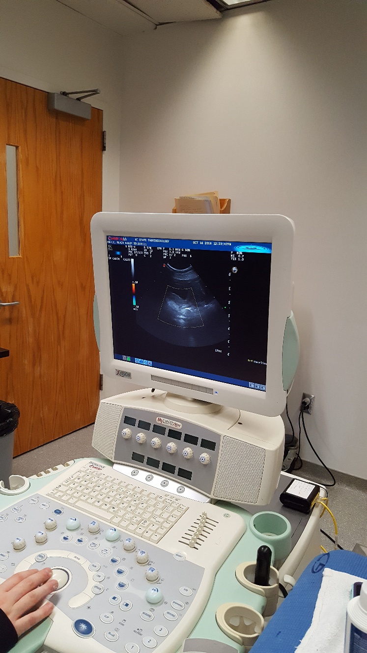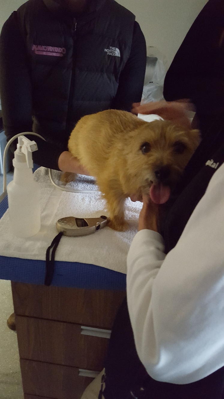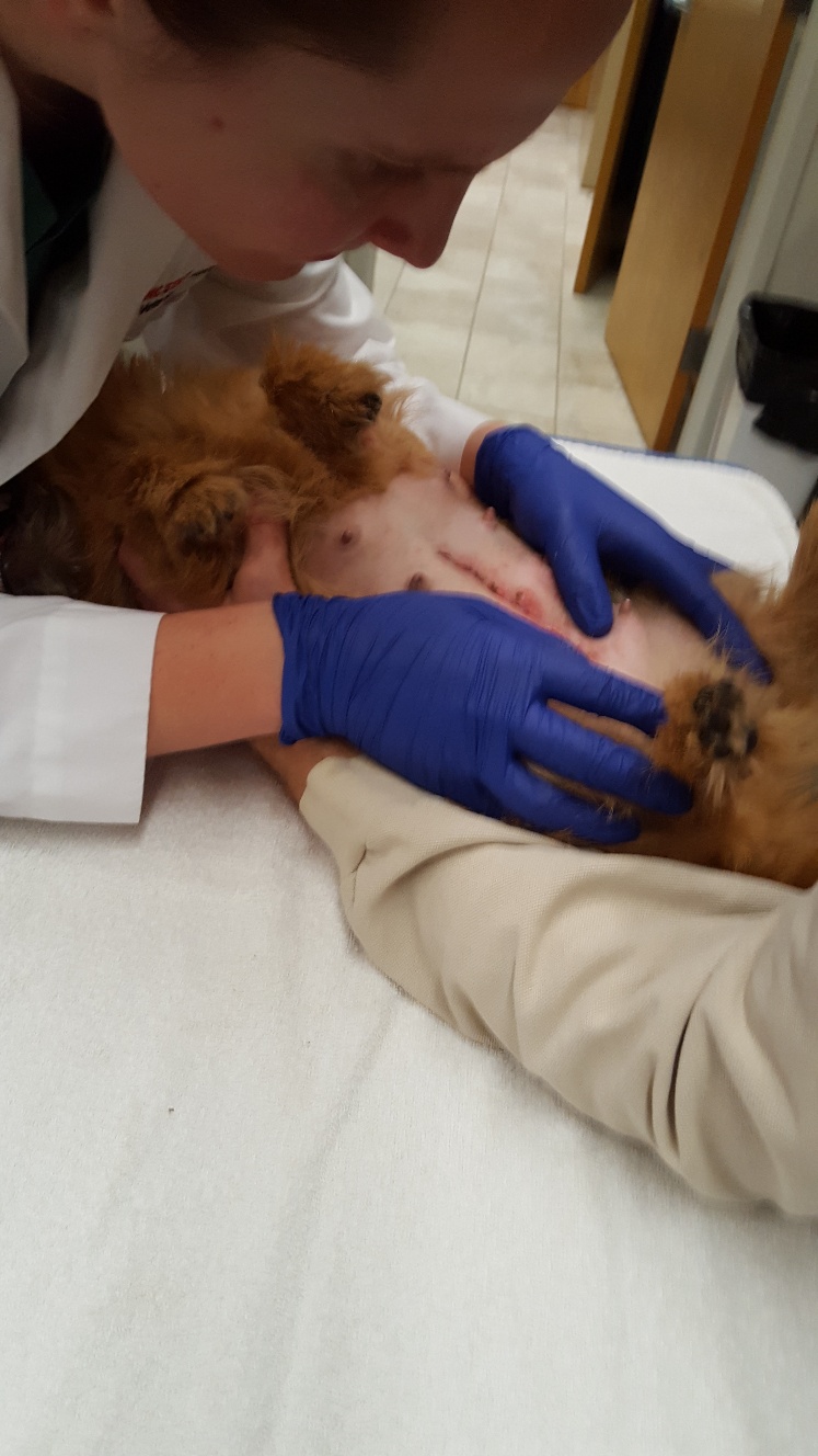 At NC State, the repro vets carefully checked Mandy's incision and nipples. Everything looked fine. Next, was an ultrasound. The ultrsound showed that Mandy had some fluid in her uterus, and that the uterus had not shrunk normally. Mandy was given a shot of oxytocin for her uterus. Next, Mandy had a blood draw to check her blood chemistry. Then we had to wait for the blood results. While waiting, the puppy got checked out. Another picture of the puppy. While waiting, Mandy continued to keep the puppy clean.