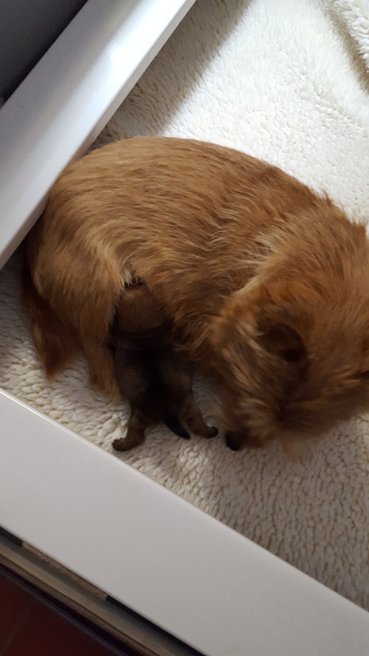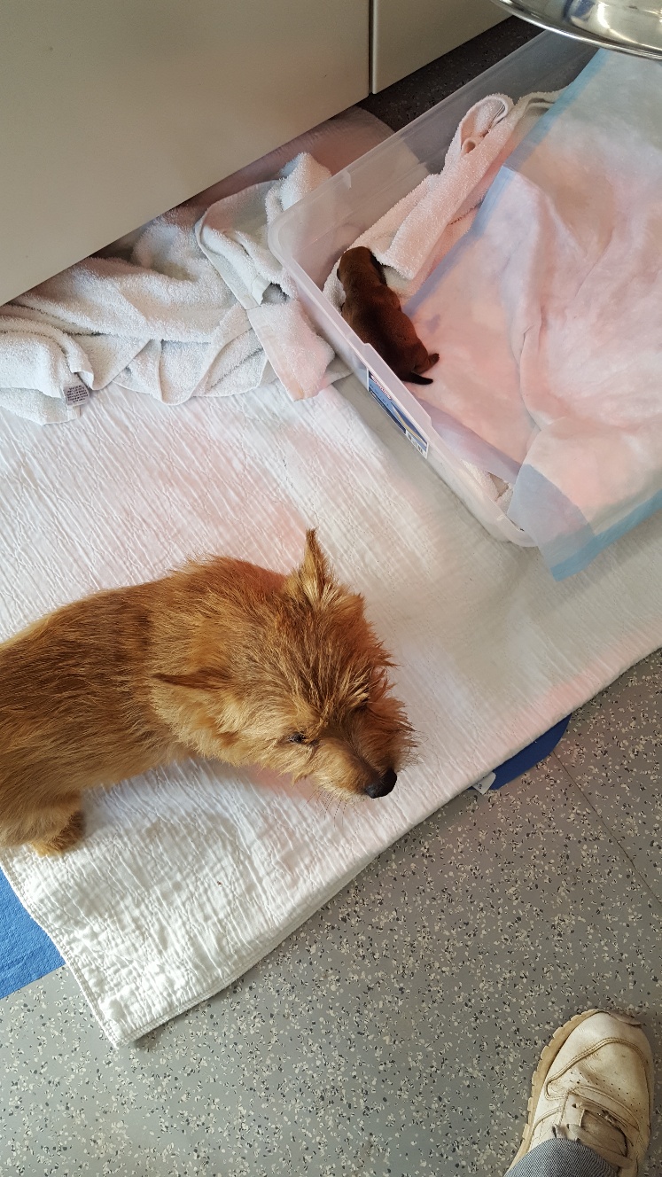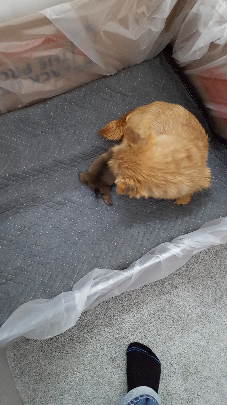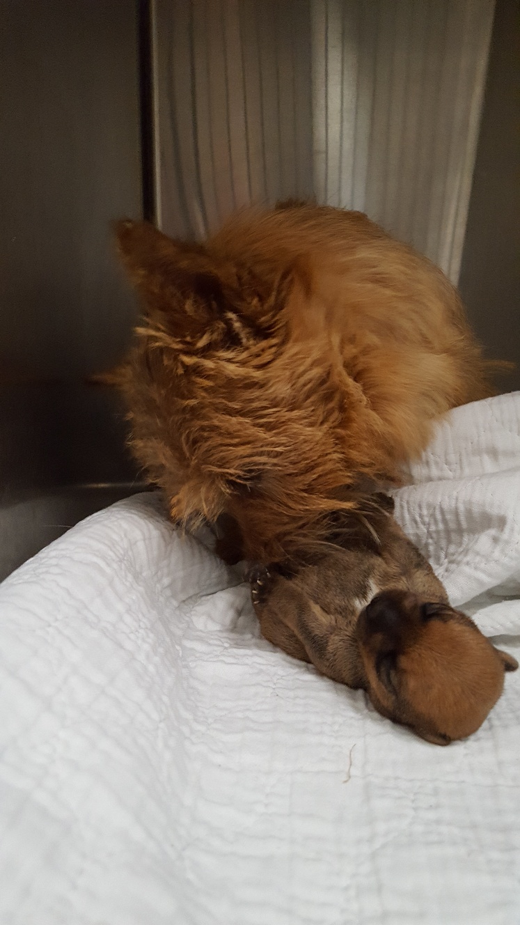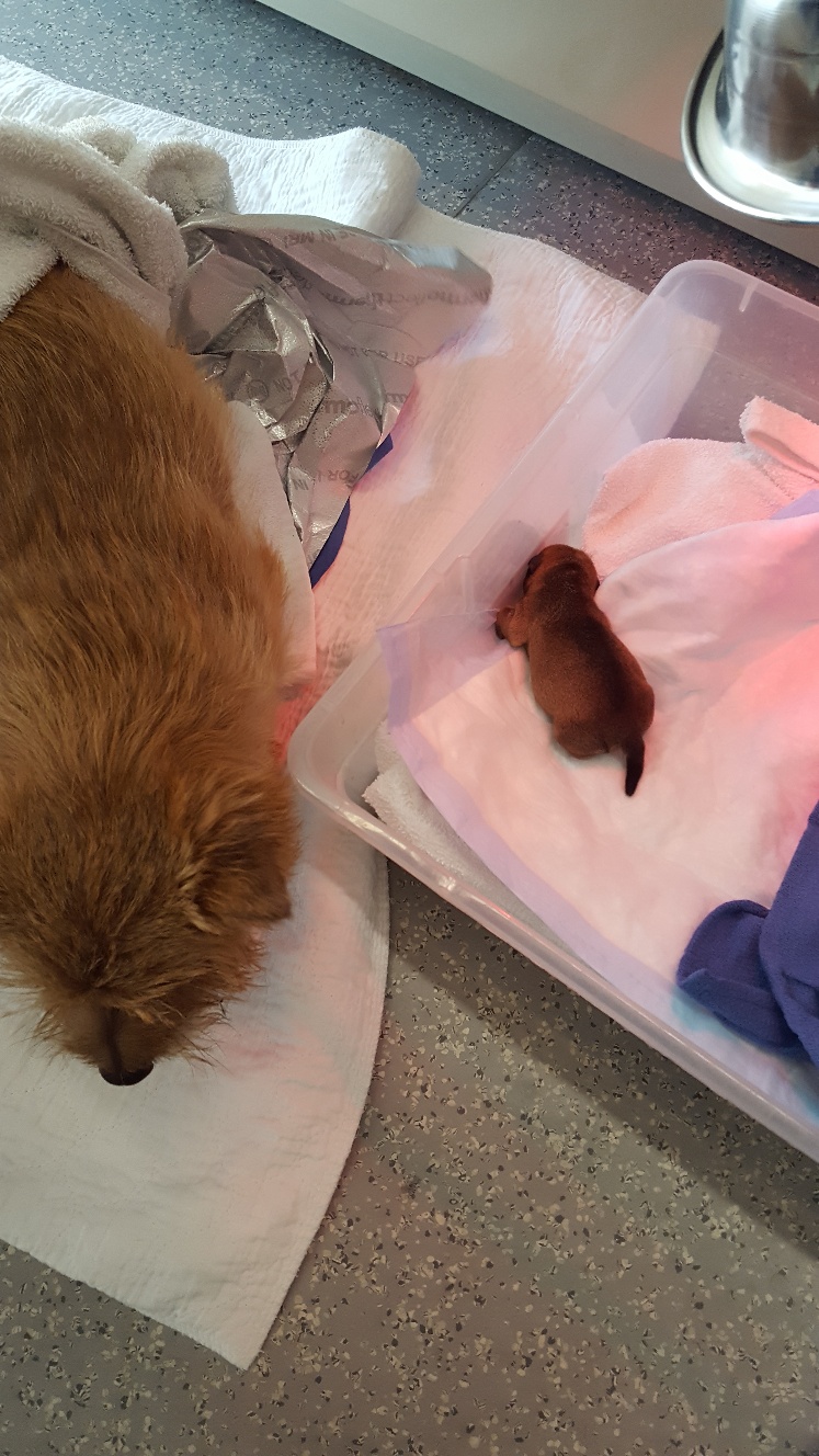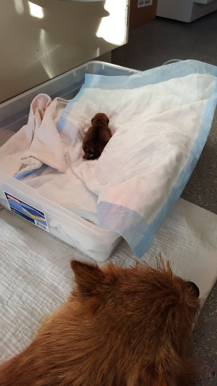 Around 11 am I got a phone call informing me that Mandy would be having her c-section starting at 1:30 pm, and asking that I be in the waiting room at that time in case they needed to consult with me. Around 1:50 pm, one of the vets came out and told me that the puppy was a girl, that both Mandy and puppy were doing find, and that they were just closing Mandy up.