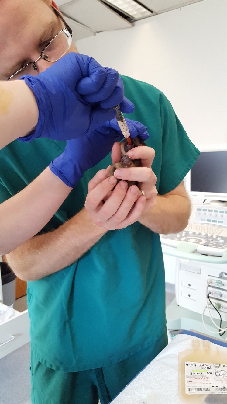 A while later I got my first look at the puppy. Besides trying to get the puppy to nurse to get that important "first milk" (colostrum) that has lots of maternal antibodies, the vets tube fed the puppy some plasma (which also has antibodies) from a donor dog. For approximately twelve hours, a puppy's gut will allow large antibody molecules to pass into the puppy's blood stream. After that, the gut closes and antibodies can not get through. This is why it is important for a puppy to nurse soon after birth.