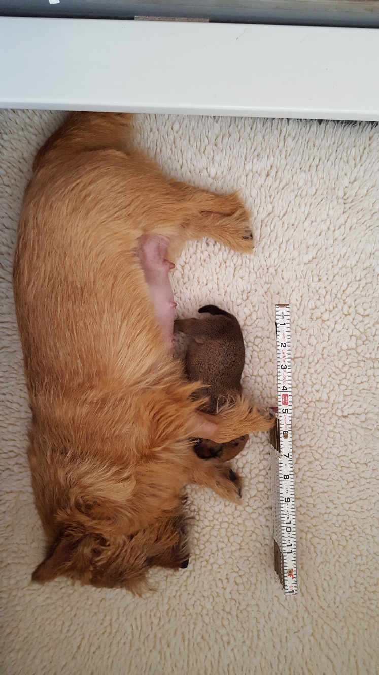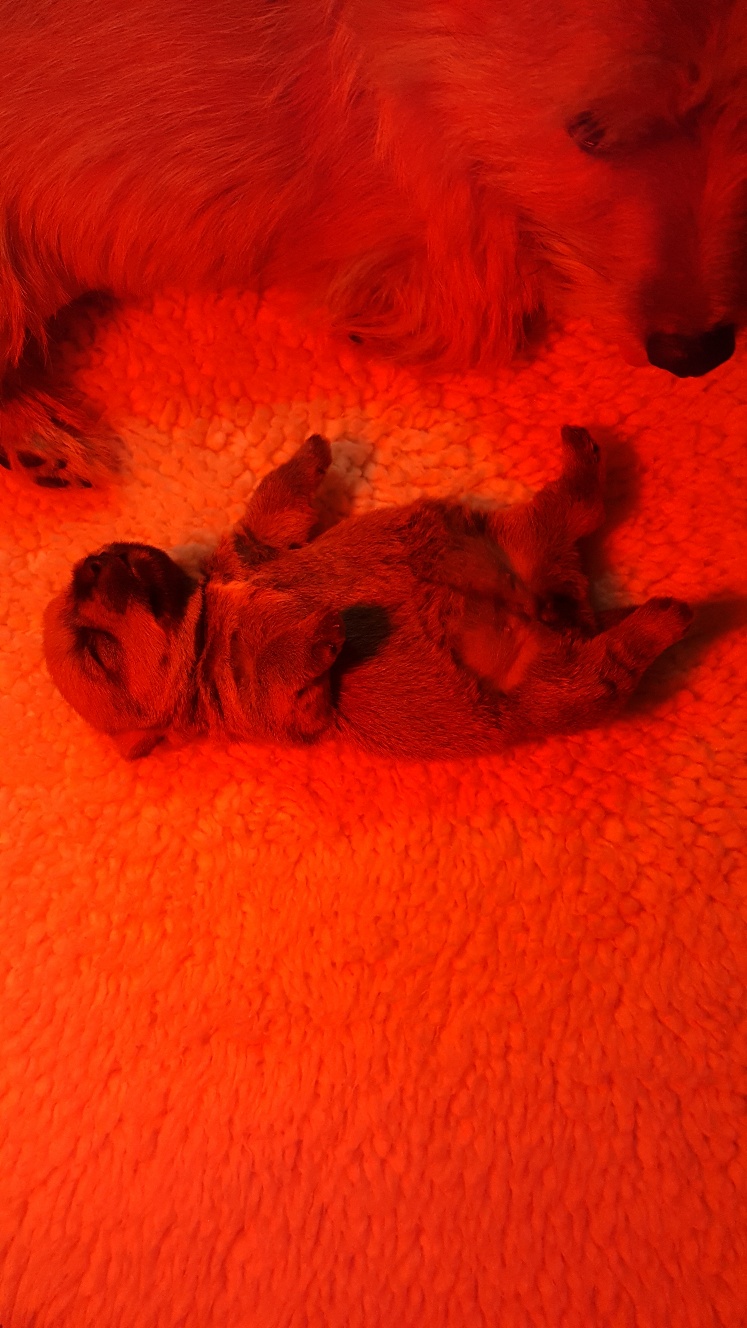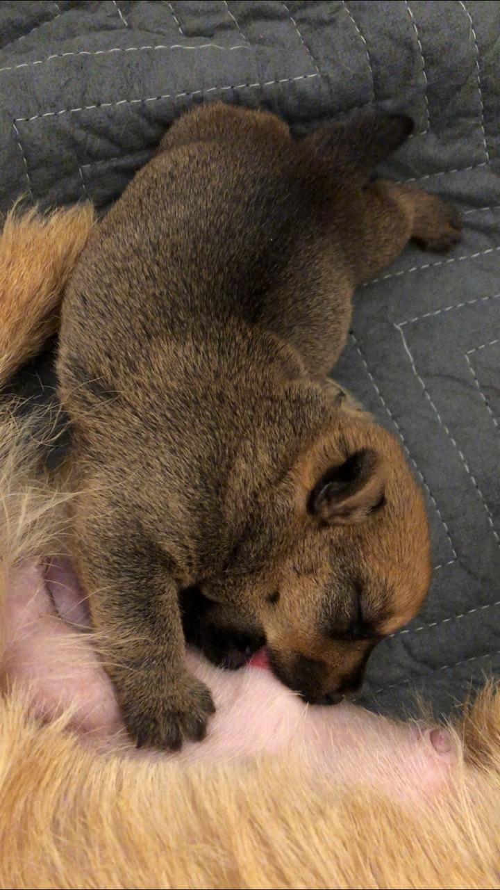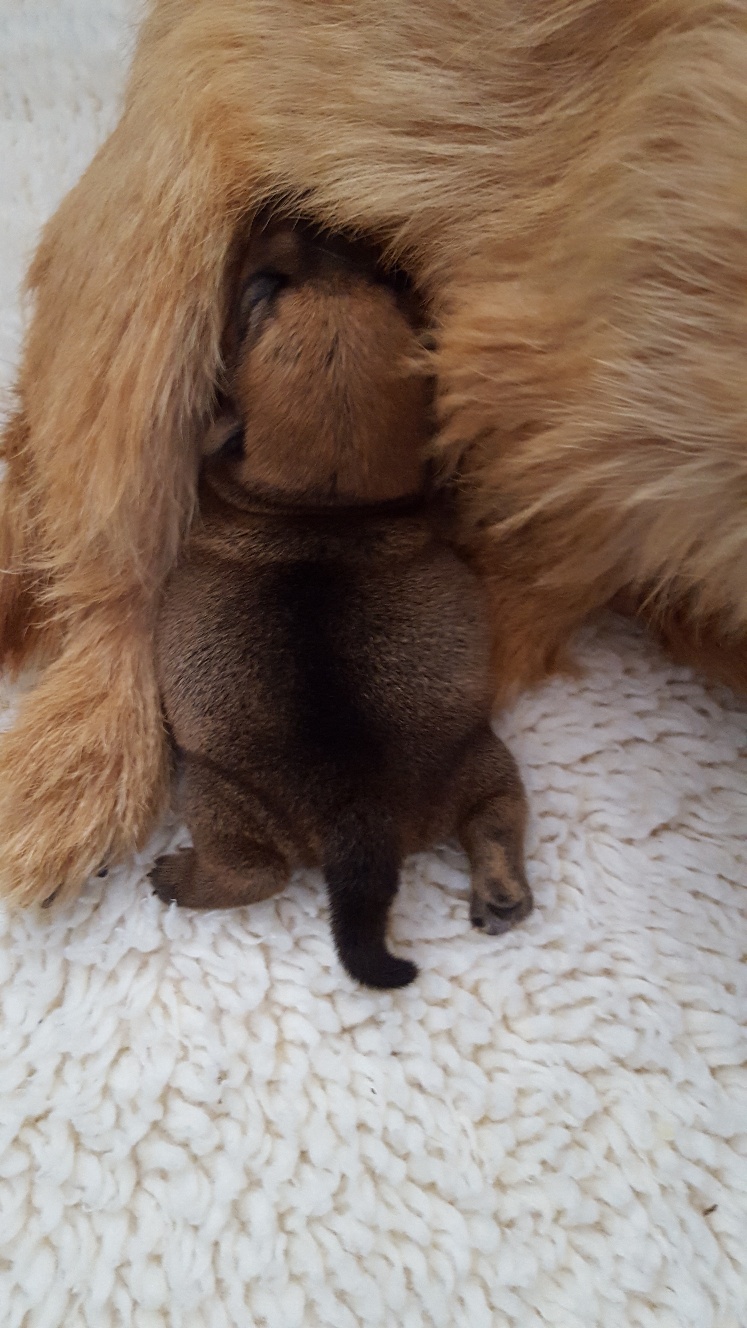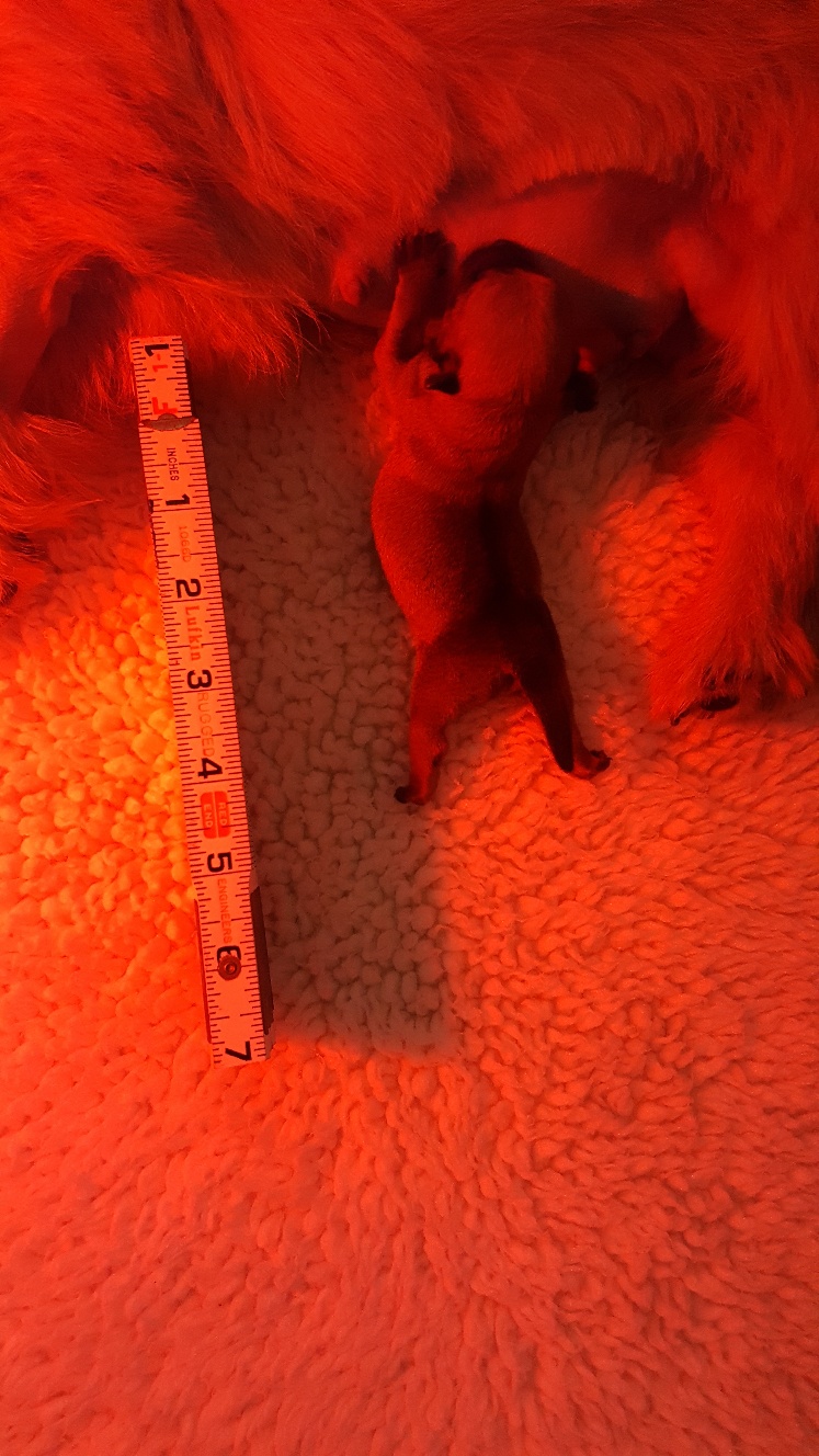 Here is a picture of the puppy while she is nursing that shows her size. The red coloring in the picture is from my heat lamp that is over the whelping box.