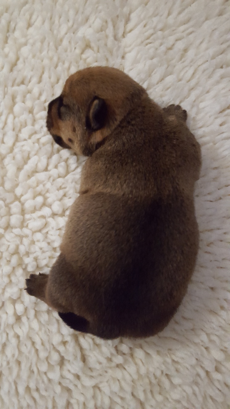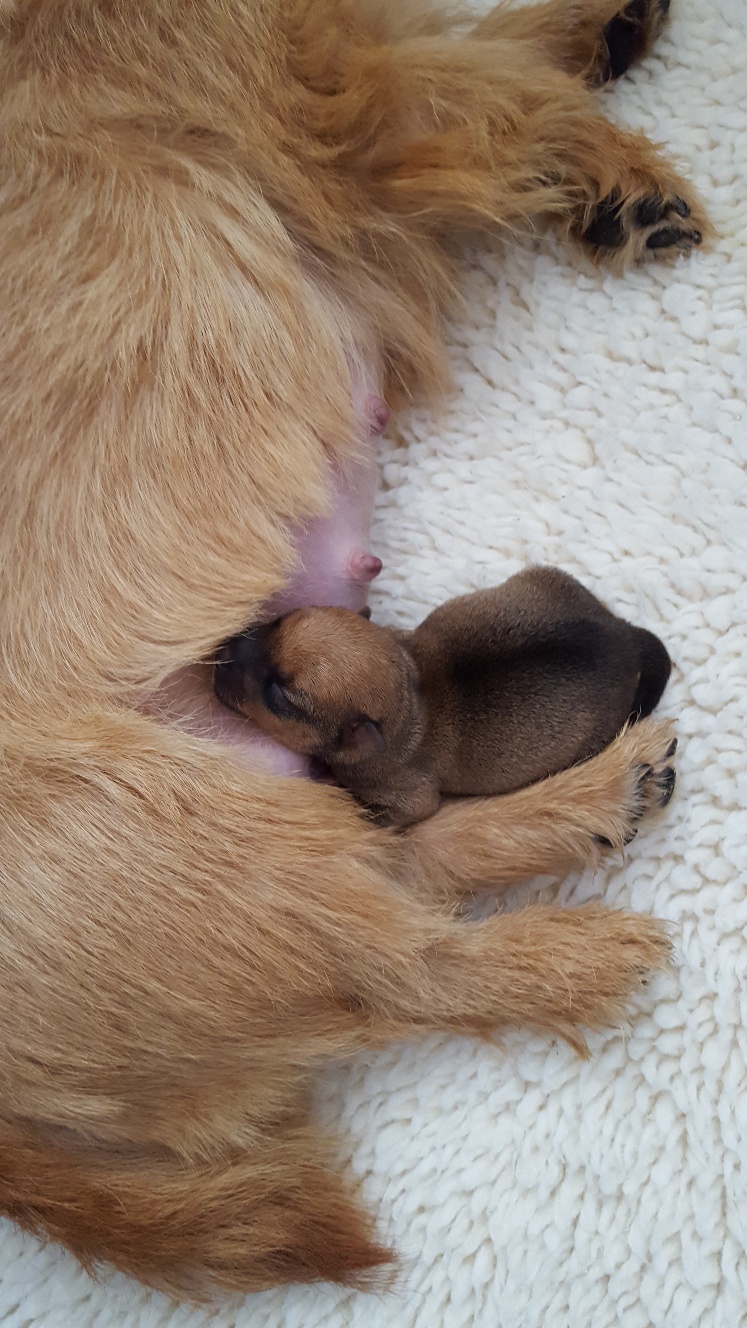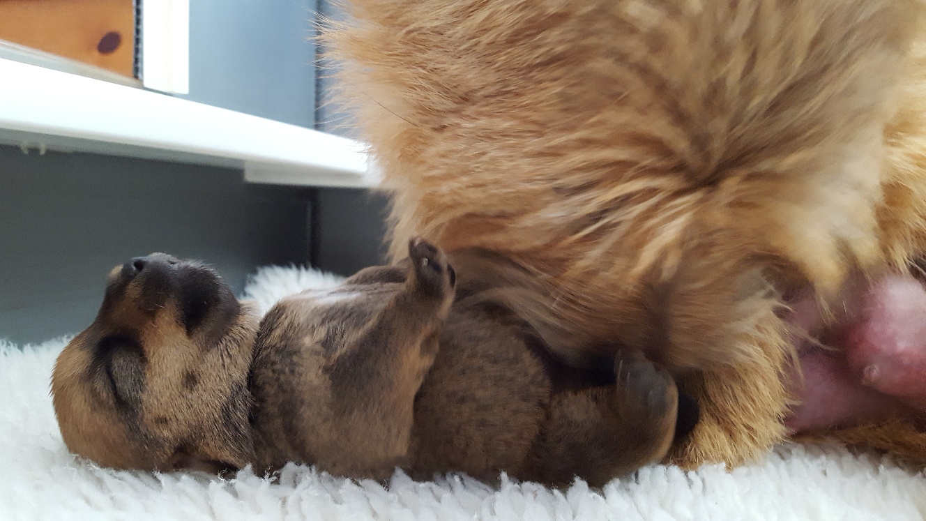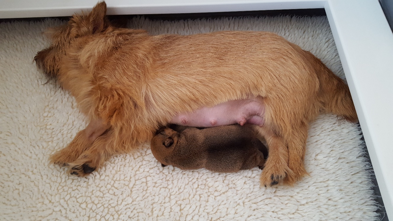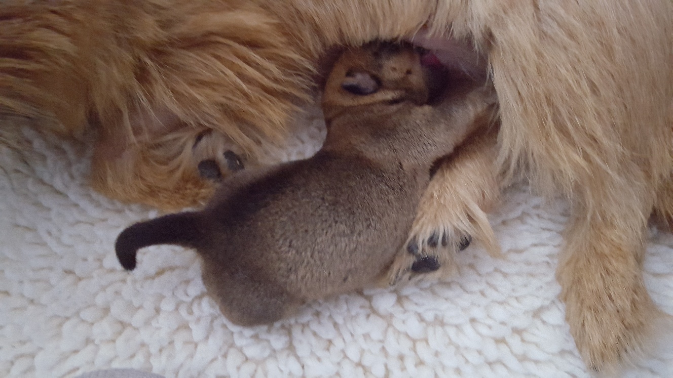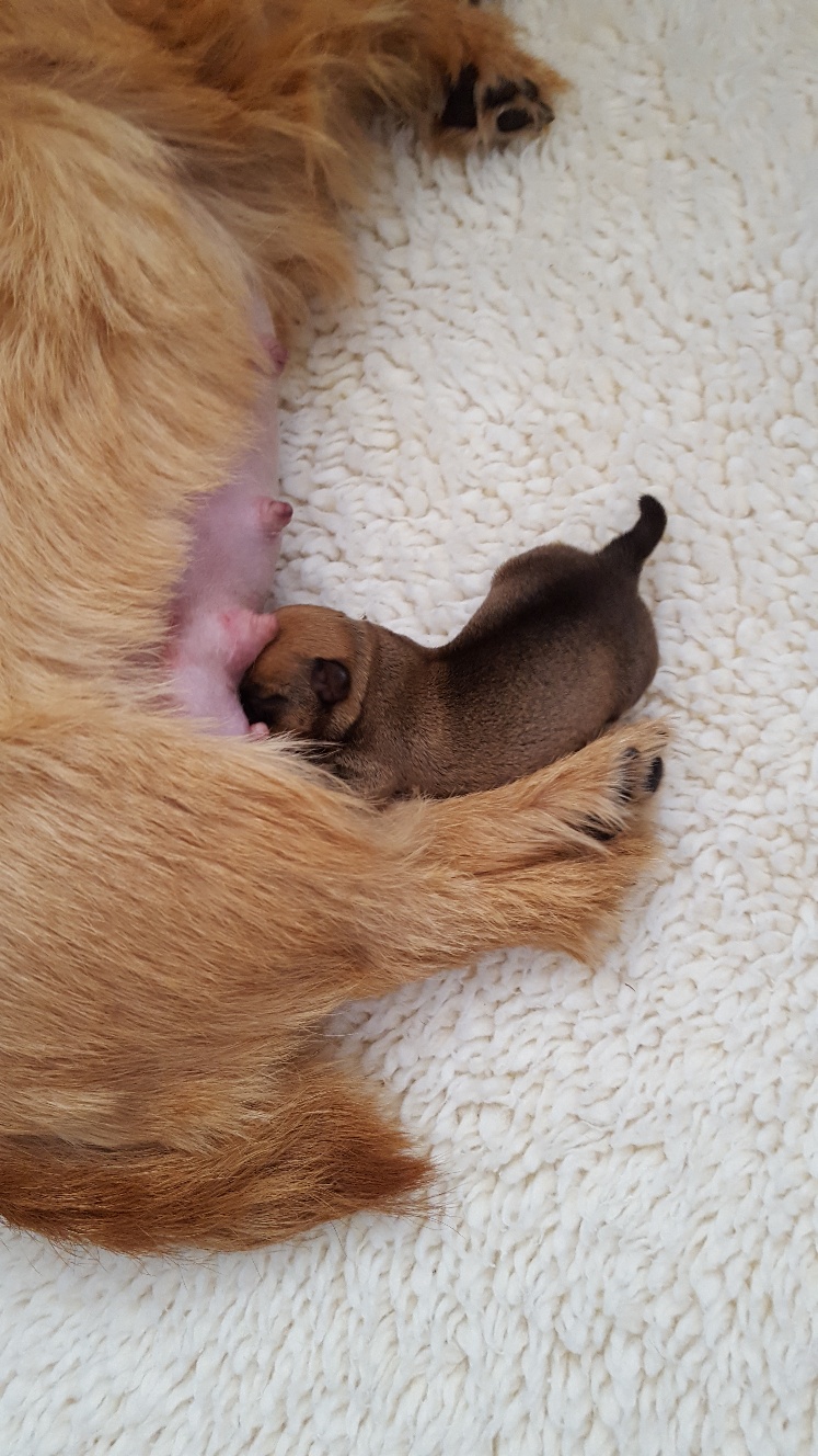 Here is a picture of the puppy while she is nursing that shows her size. The red coloring in the picture is from my heat lamp that is over the whelping box.