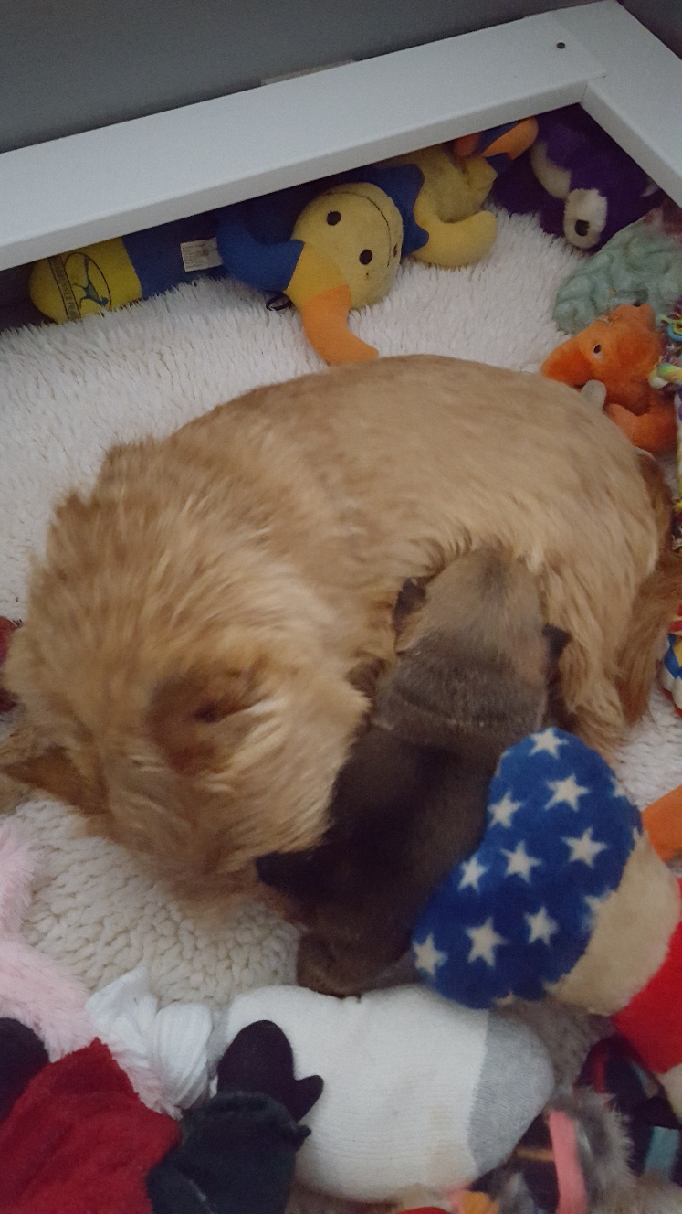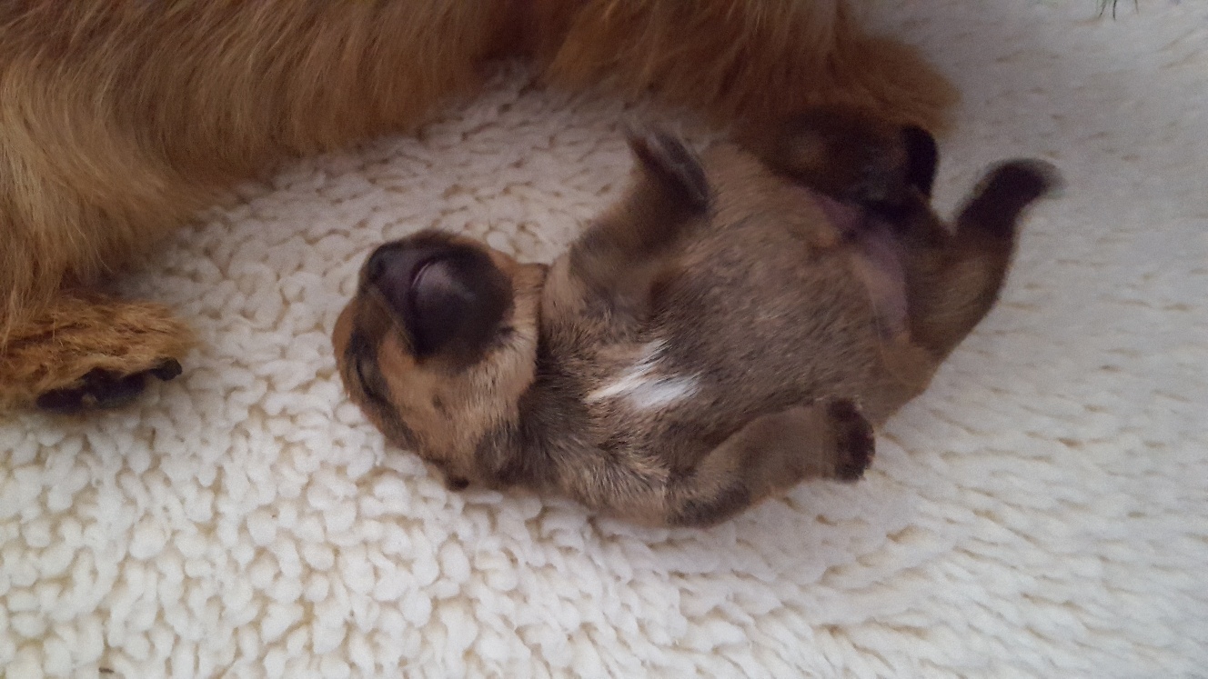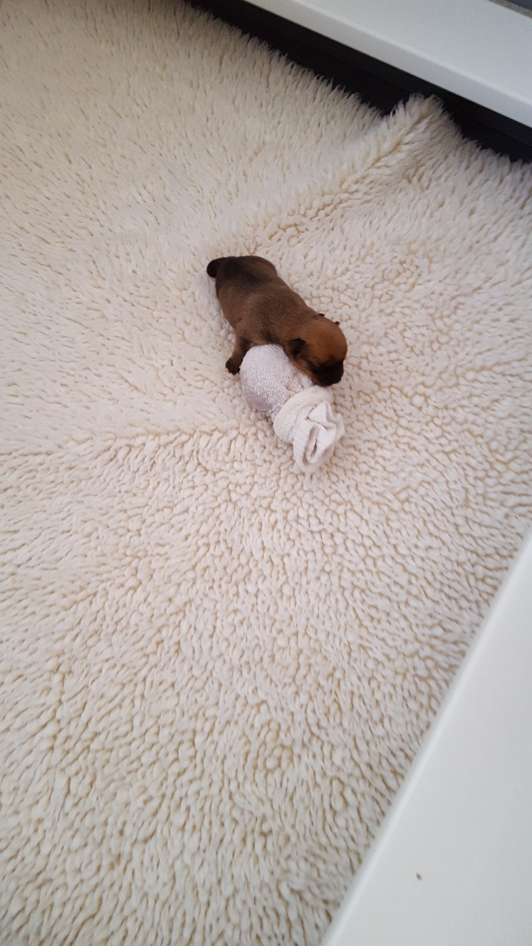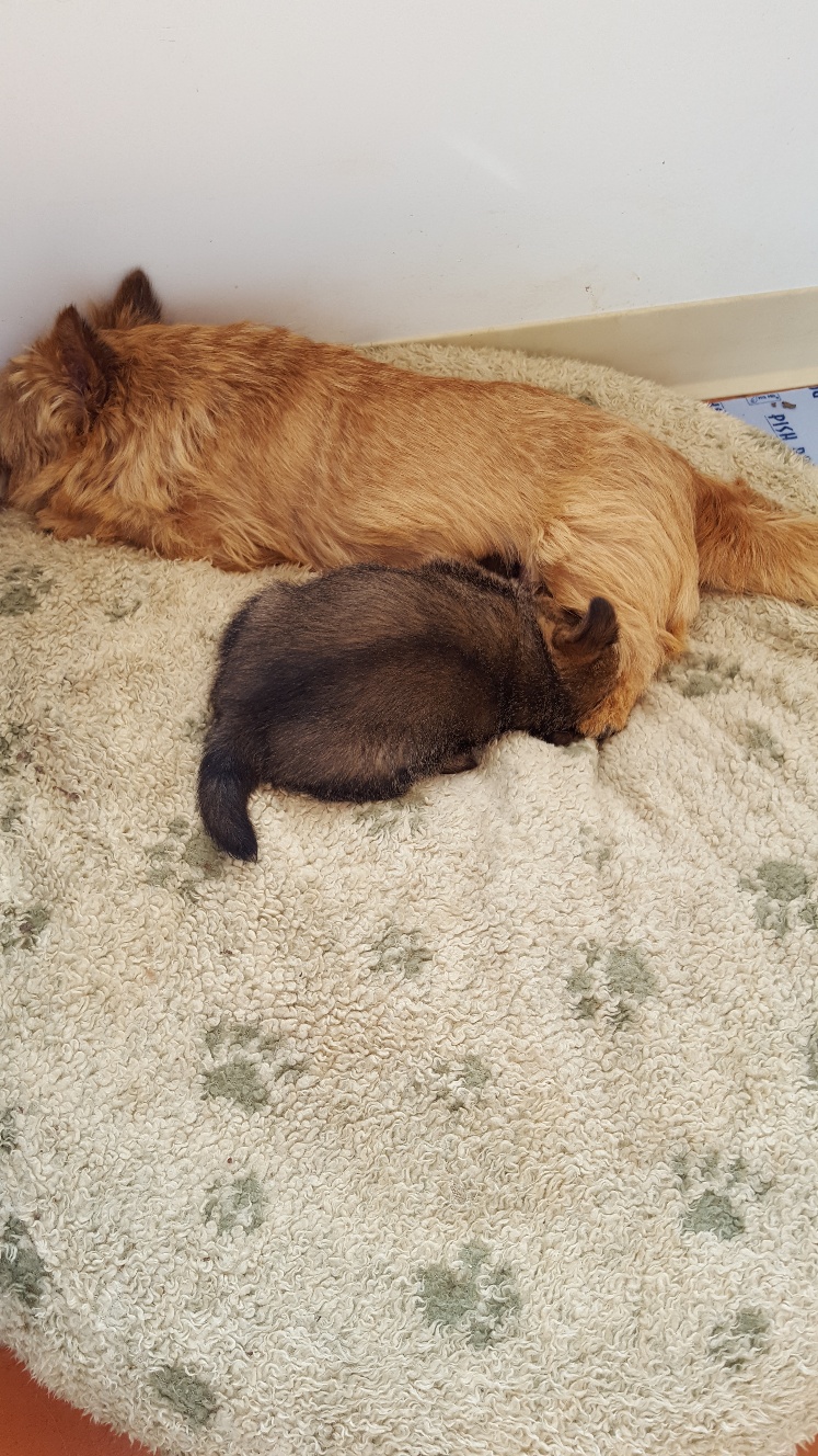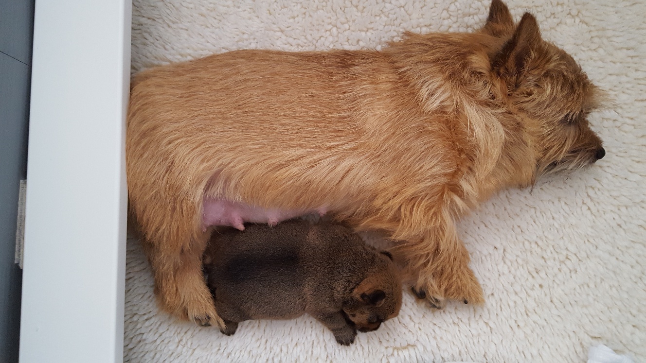 Here is a picture of the puppy while she is nursing that shows her size. The red coloring in the picture is from my heat lamp that is over the whelping box.