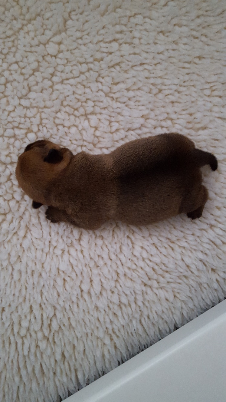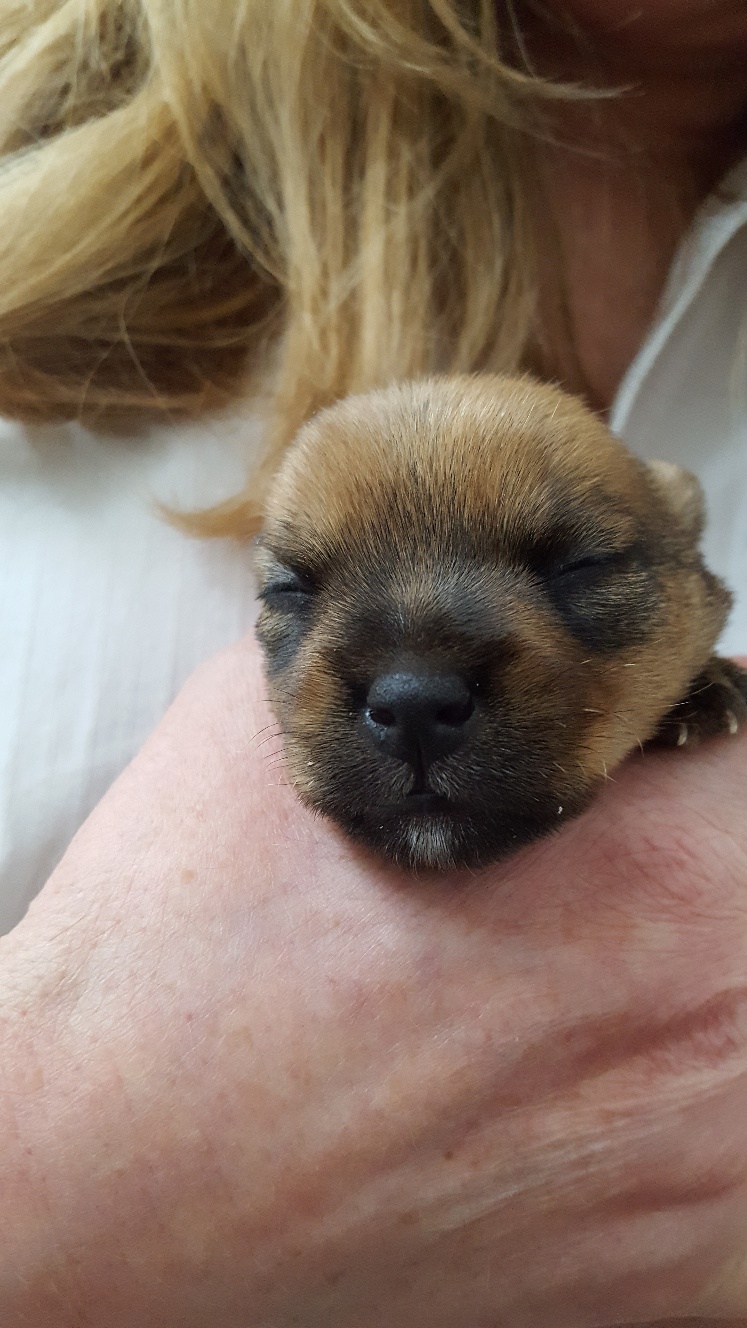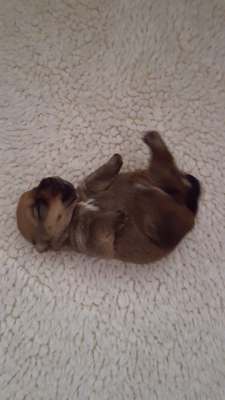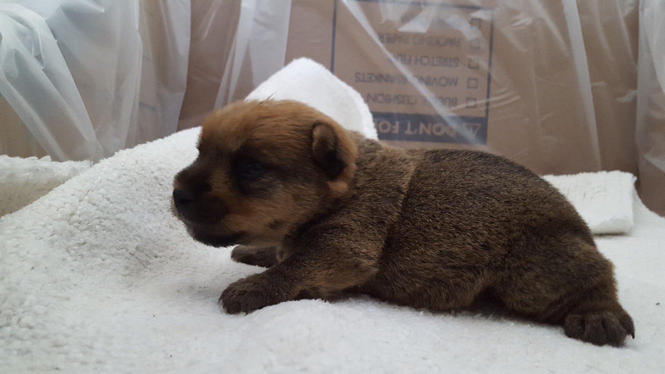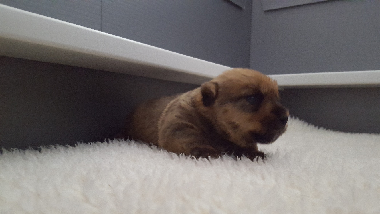 Here is a picture of the puppy while she is nursing that shows her size. The red coloring in the picture is from my heat lamp that is over the whelping box.