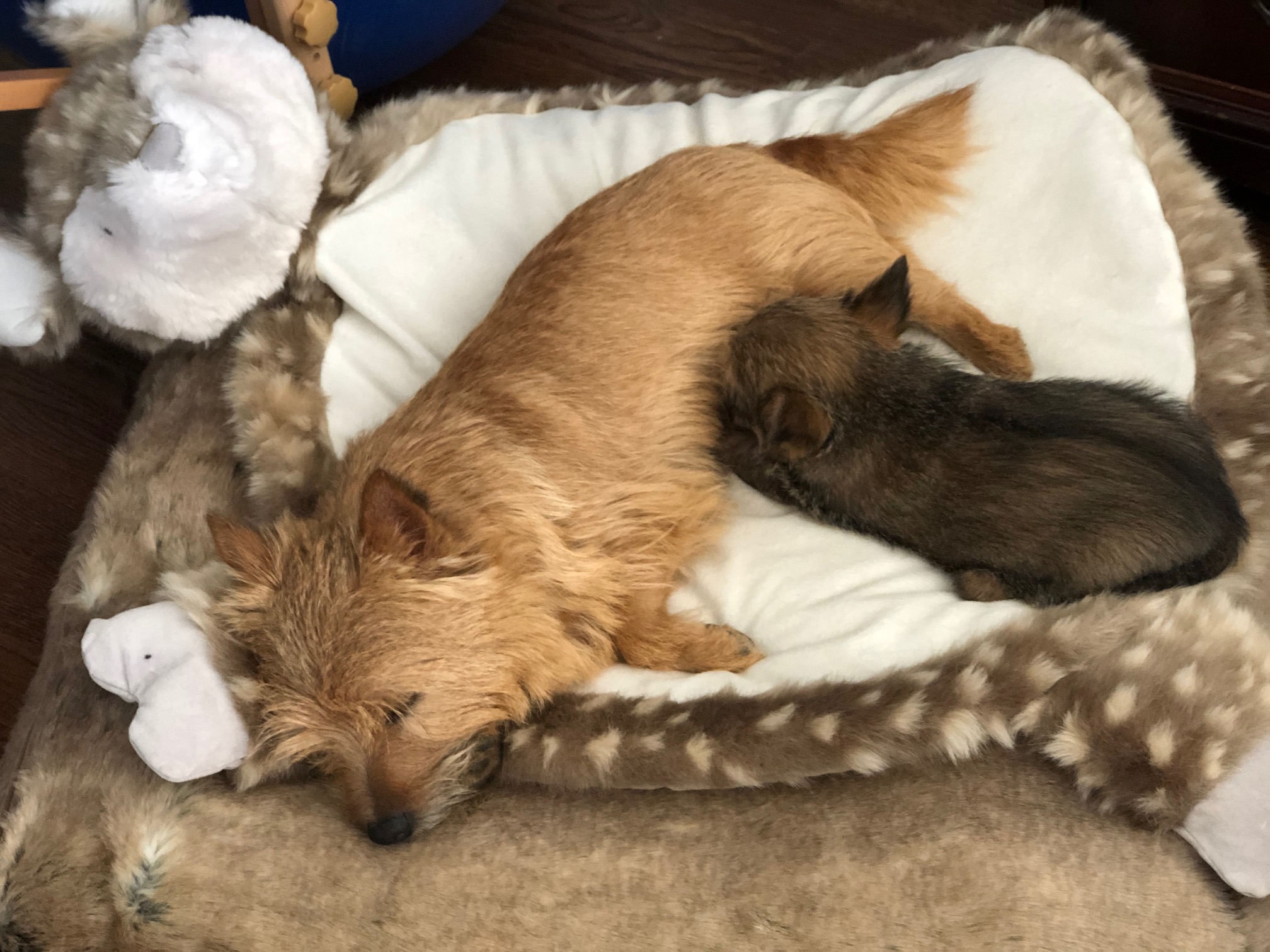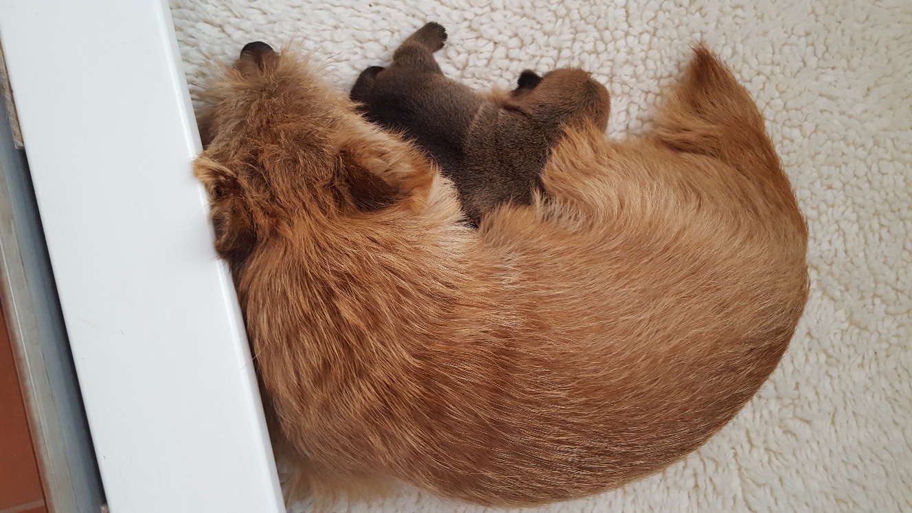 After a fearsome battle with an alien invader of the whelping box, a tired puppy rests on the defeated body of her foe.