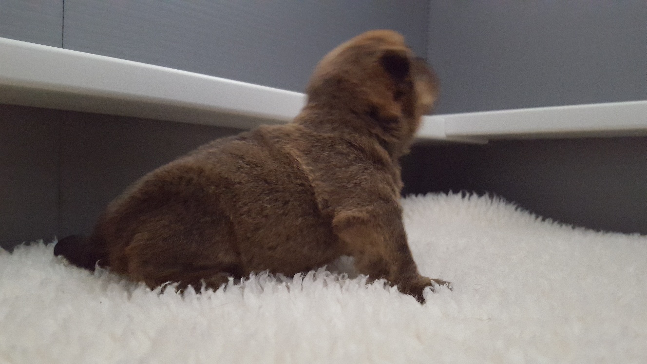 With Sir's hind legs hobbled, she is able to look out of the whelping box, stand on her own, and even walk for a few steps before she plunks down. She clearly knows what to do, but the muscles in her hind legs are not strong enough to carry her belly.