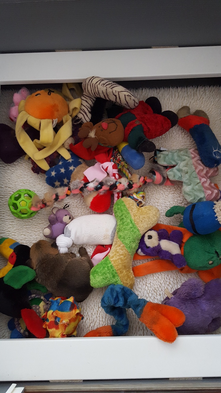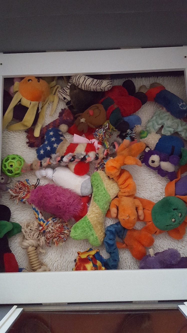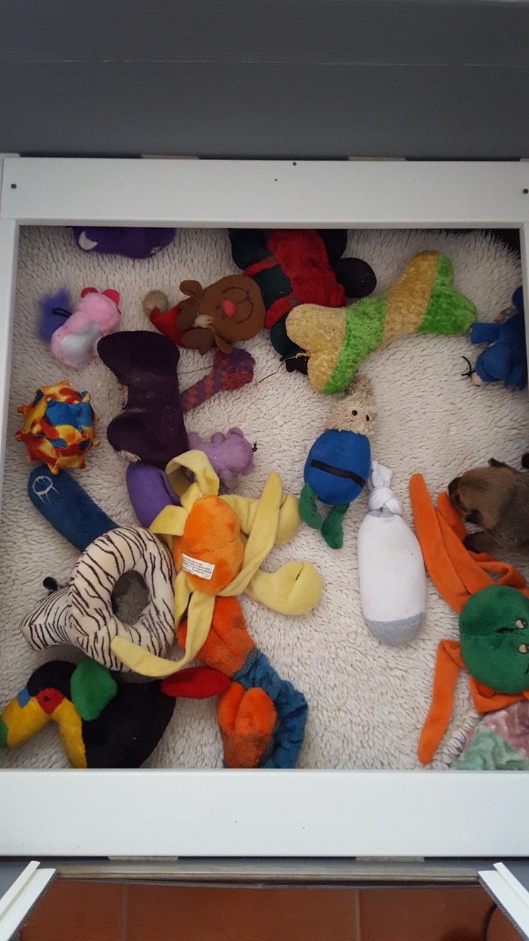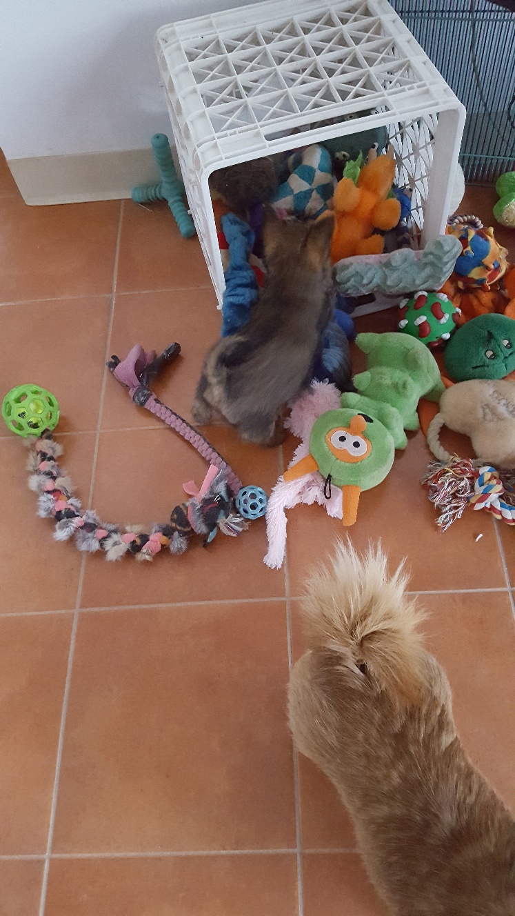 she ran around greeting all her toys, trying to play with each one,