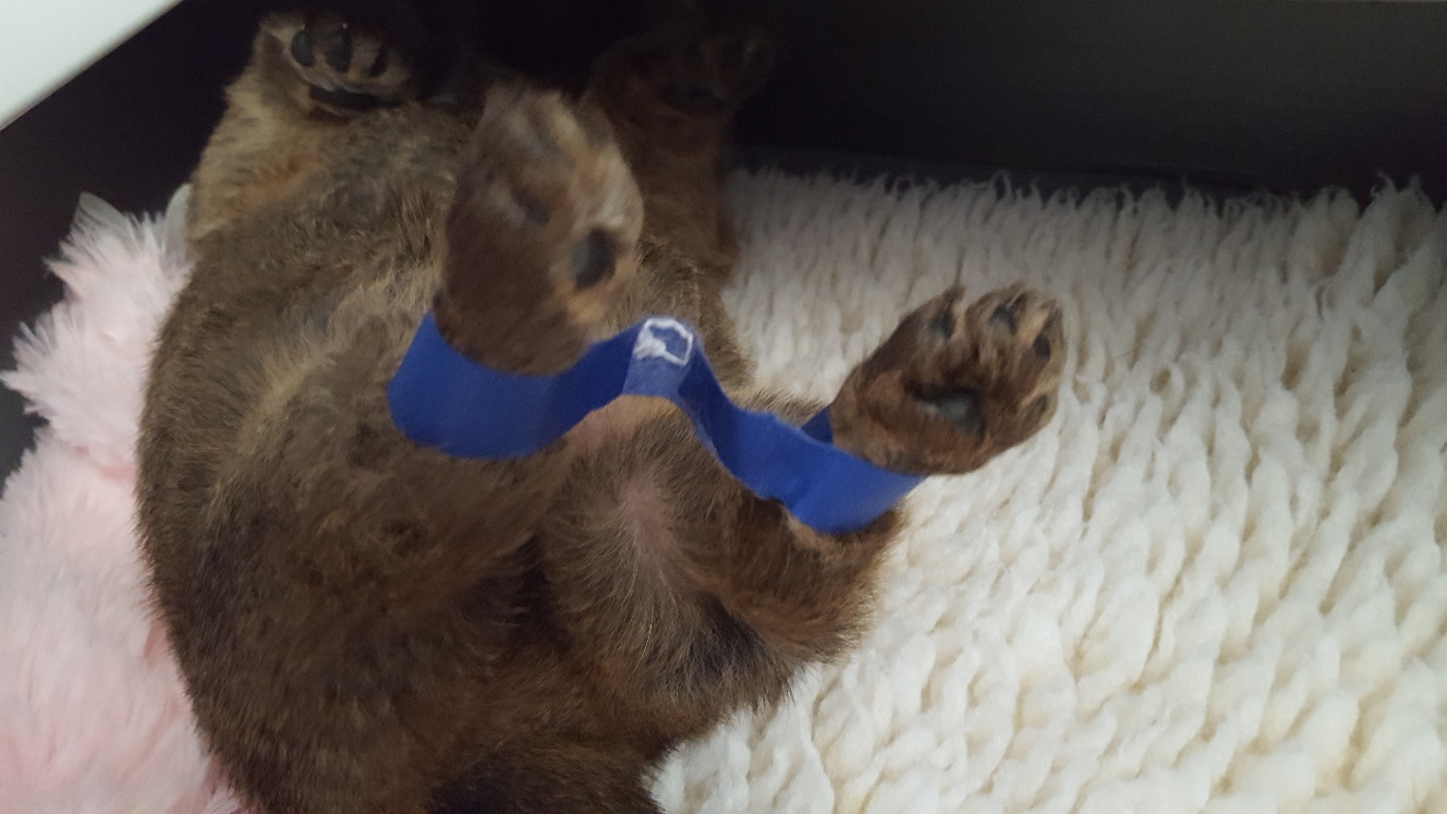 Today I got worried that Siri is still not up and walking. Because of her fat belly, her hind legs are not getting underneath her body. So I used some masking tape and hobbled her rear feet so that she could move them, but that her feet are now underneath her belly.