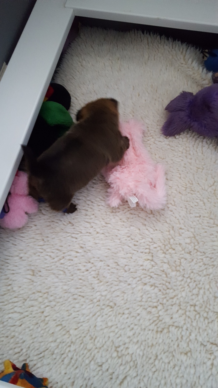 Puppies do not see well at first, but I have started adding toys to the welping box to give the puppy something to focus on.