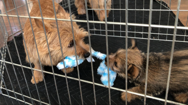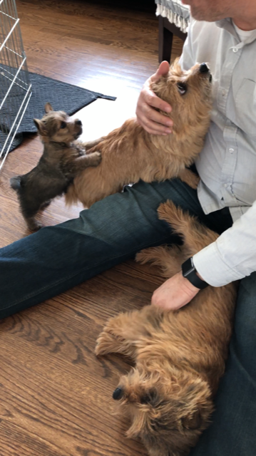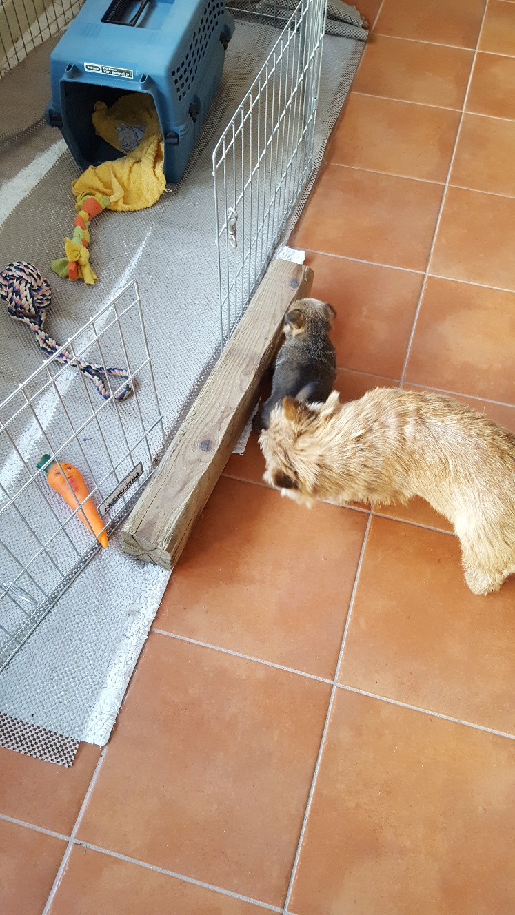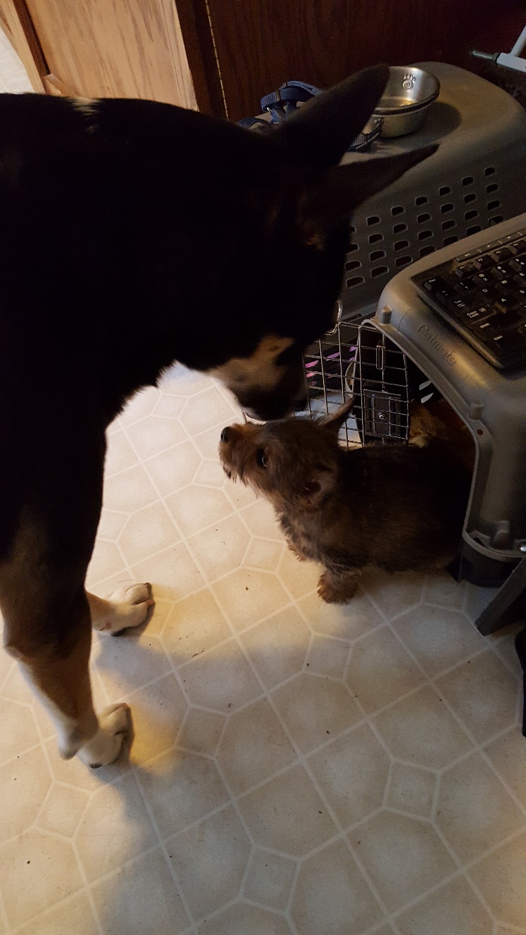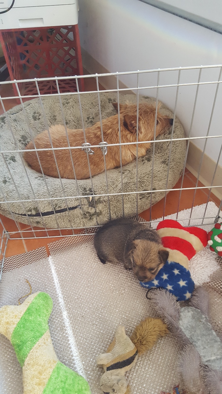 Today I decided to build Siri's play area next to my desk. Some of my other dogs had to inspect and give their approval. Note Mandy inside the crate.