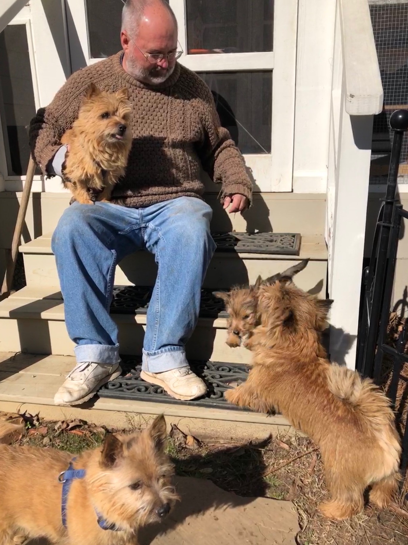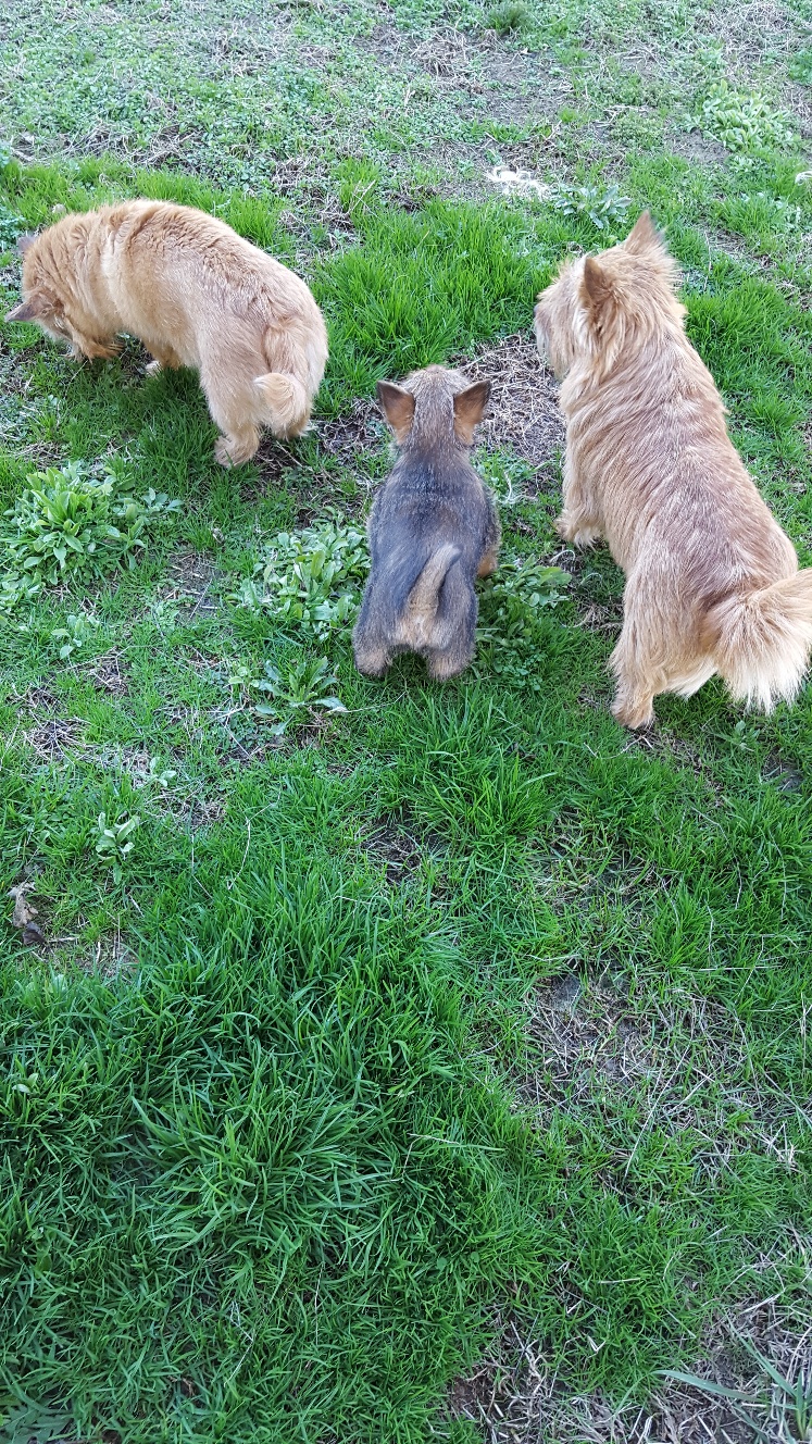myself and my older dogs in short walks outside my fenced yard.