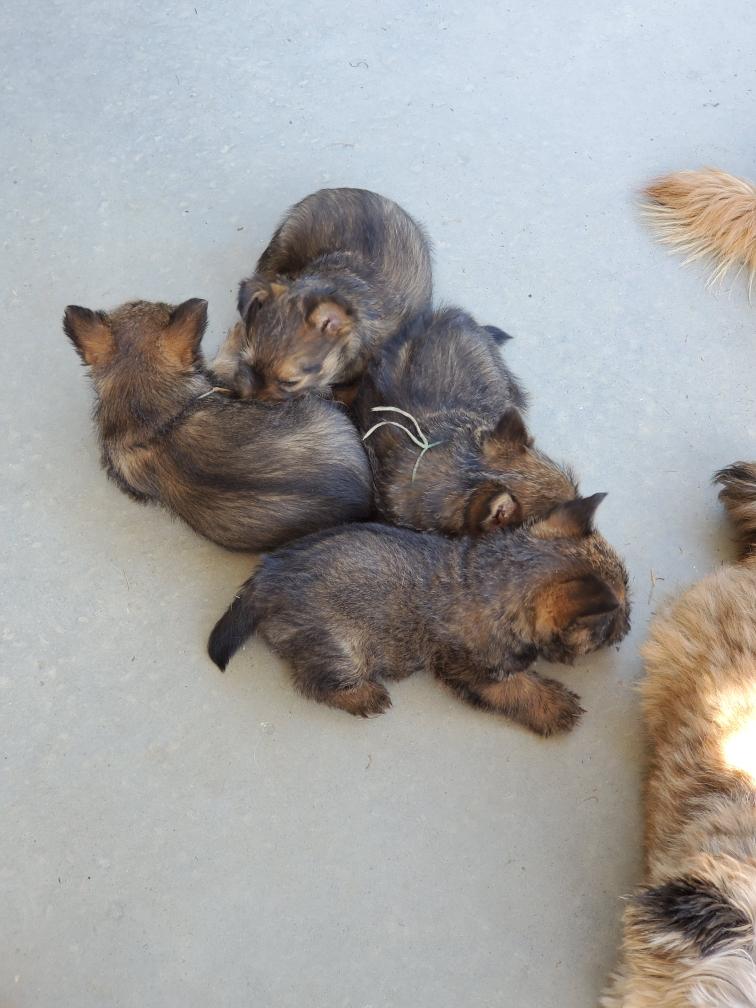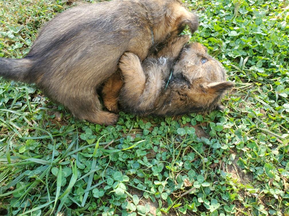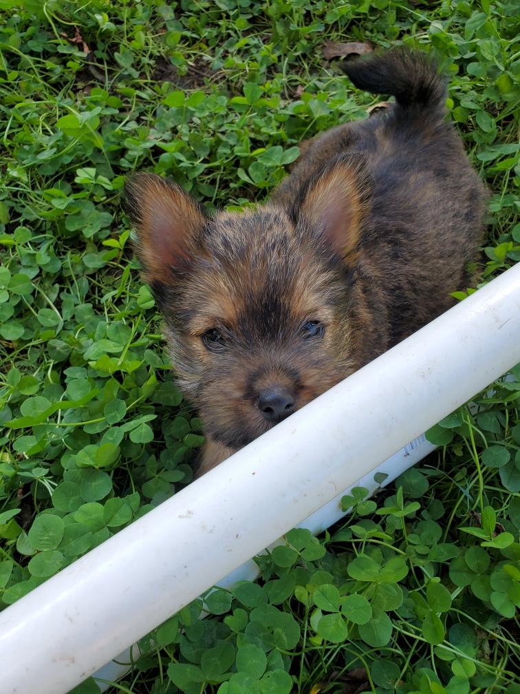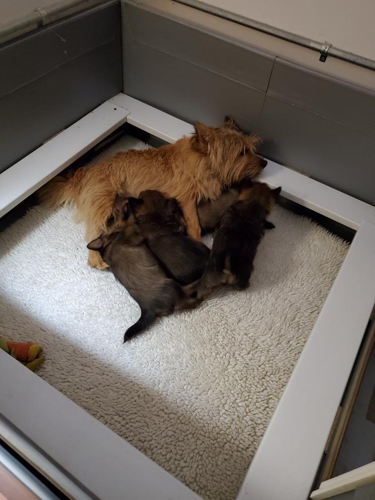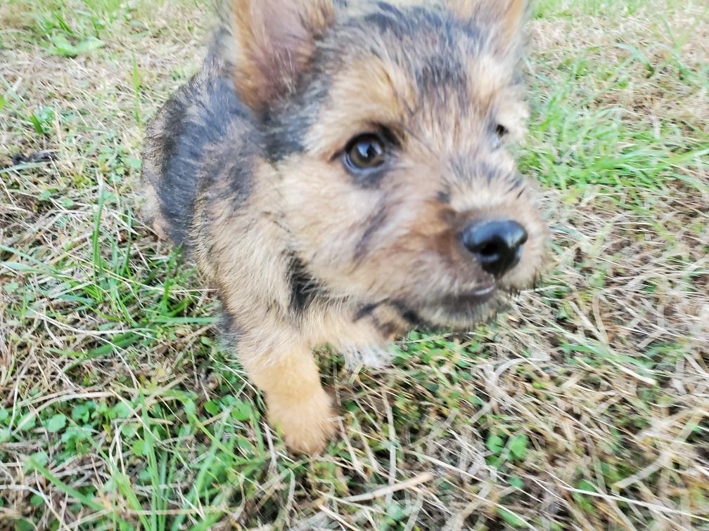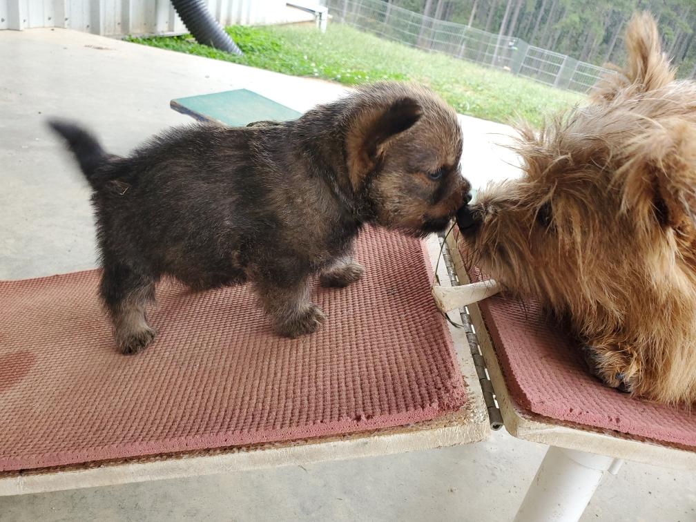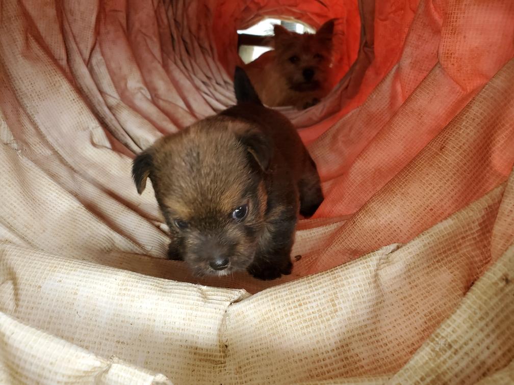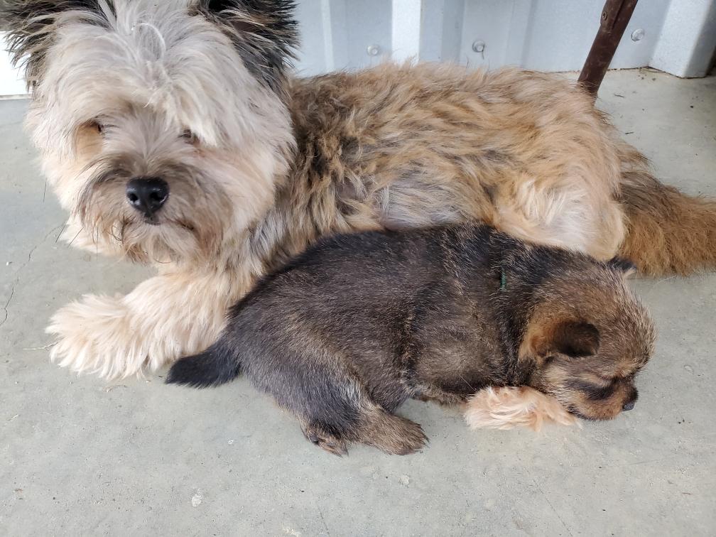 Polly is a "fluffy" Norwich. This means that Polly has two copies of the (recessive) long coat allele that makes a long (and soft) coat. So Polly does not look like a typical Norwich, either in terms of the feel of her coat or its color. In the picture, Polly is shaved down. Gunner does not carry the fluffy allele, so any puppies from a Gunner x Polly breeding will have a normal Norwich coat.