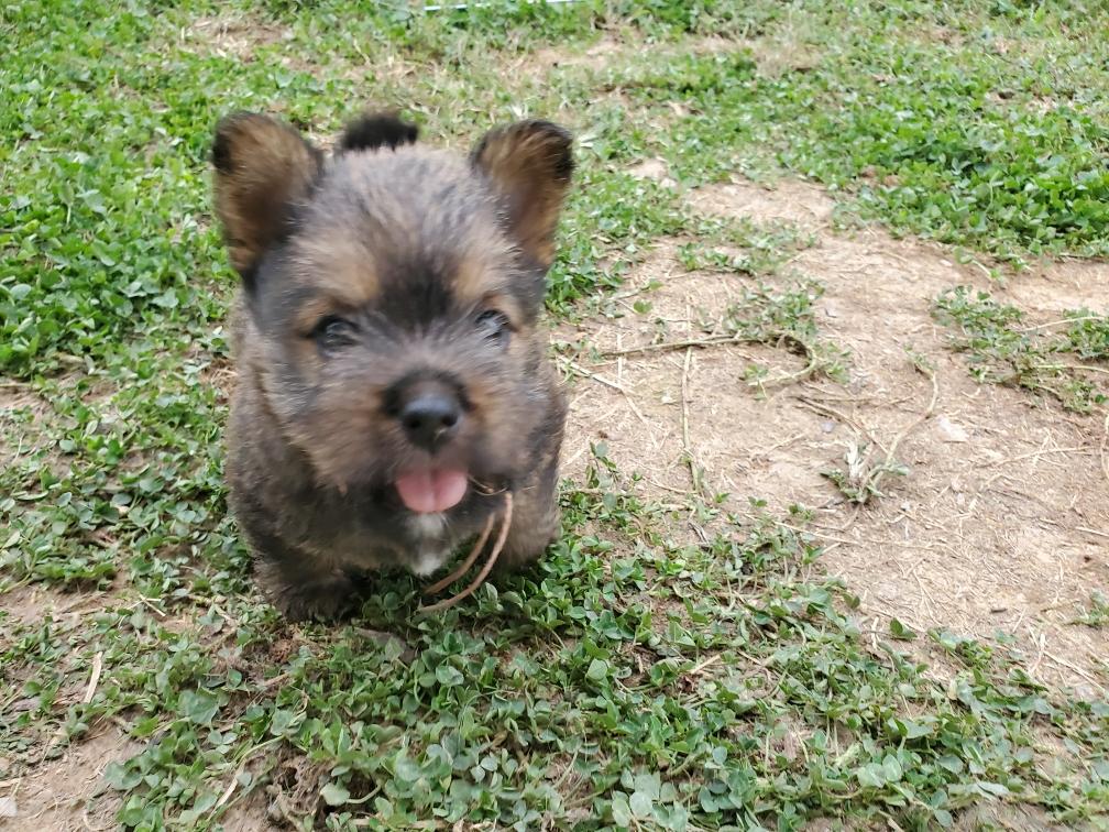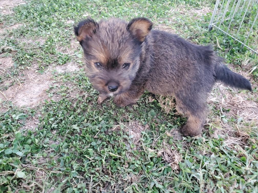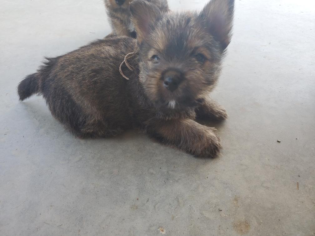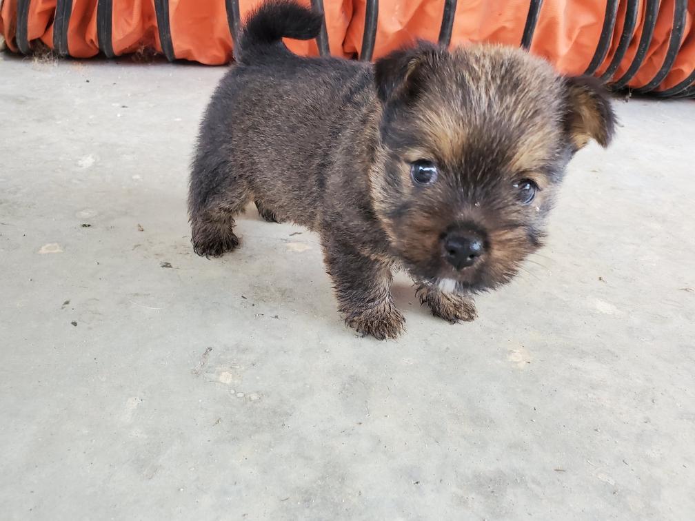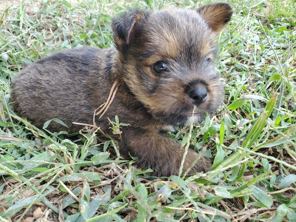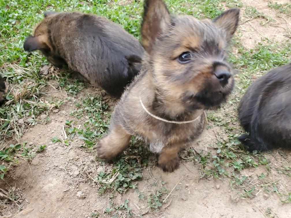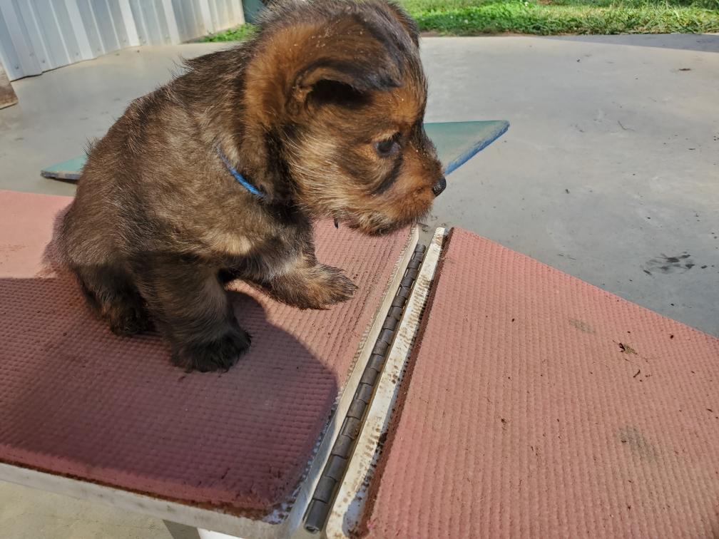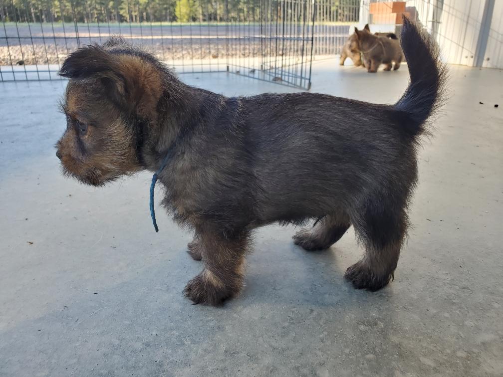 Polly is a "fluffy" Norwich. This means that Polly has two copies of the (recessive) long coat allele that makes a long (and soft) coat. So Polly does not look like a typical Norwich, either in terms of the feel of her coat or its color. In the picture, Polly is shaved down. Gunner does not carry the fluffy allele, so any puppies from a Gunner x Polly breeding will have a normal Norwich coat.