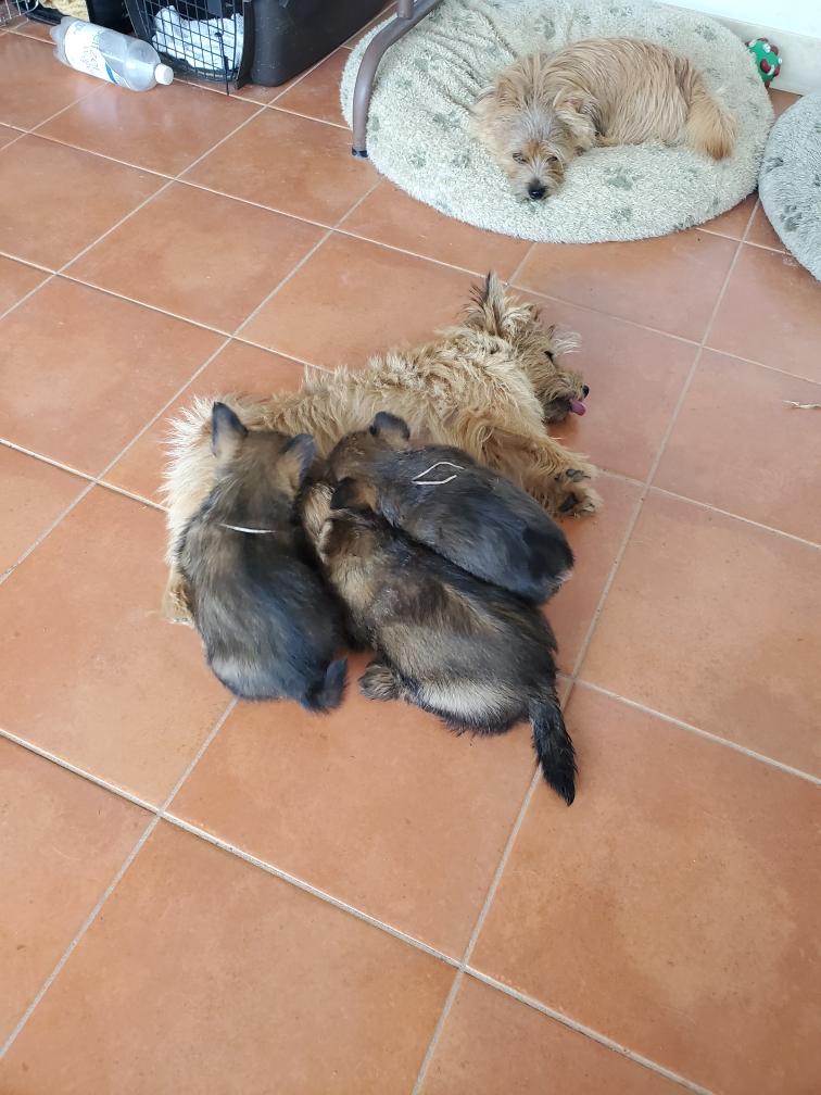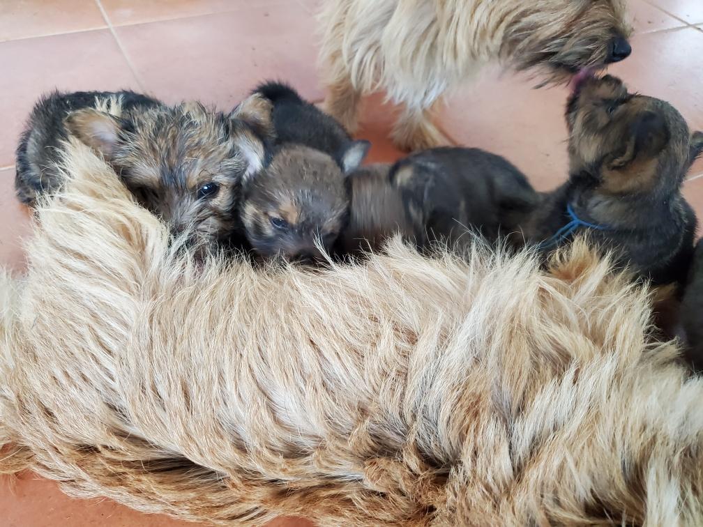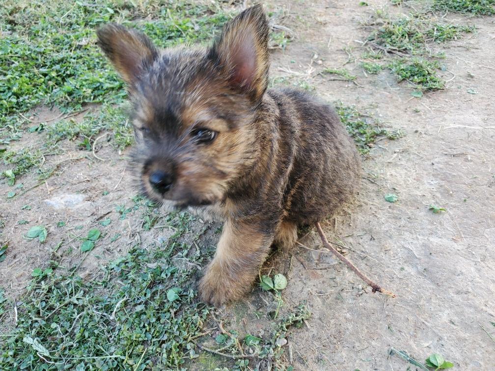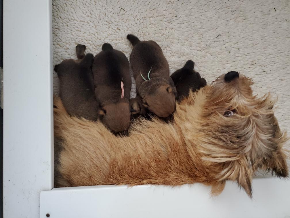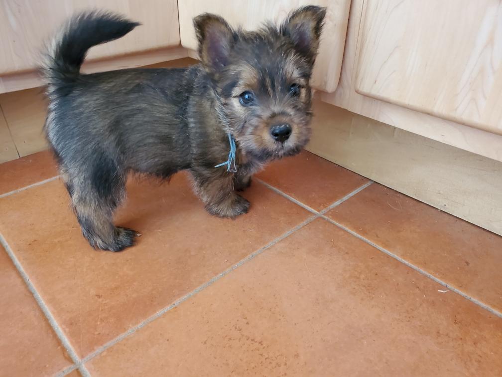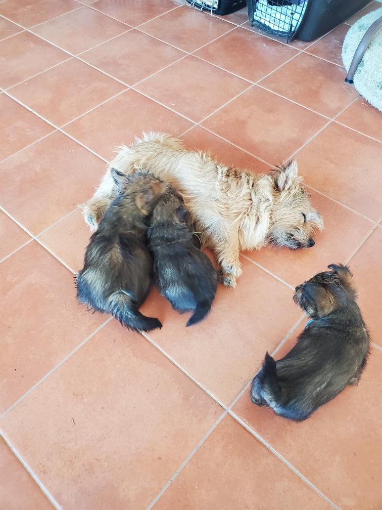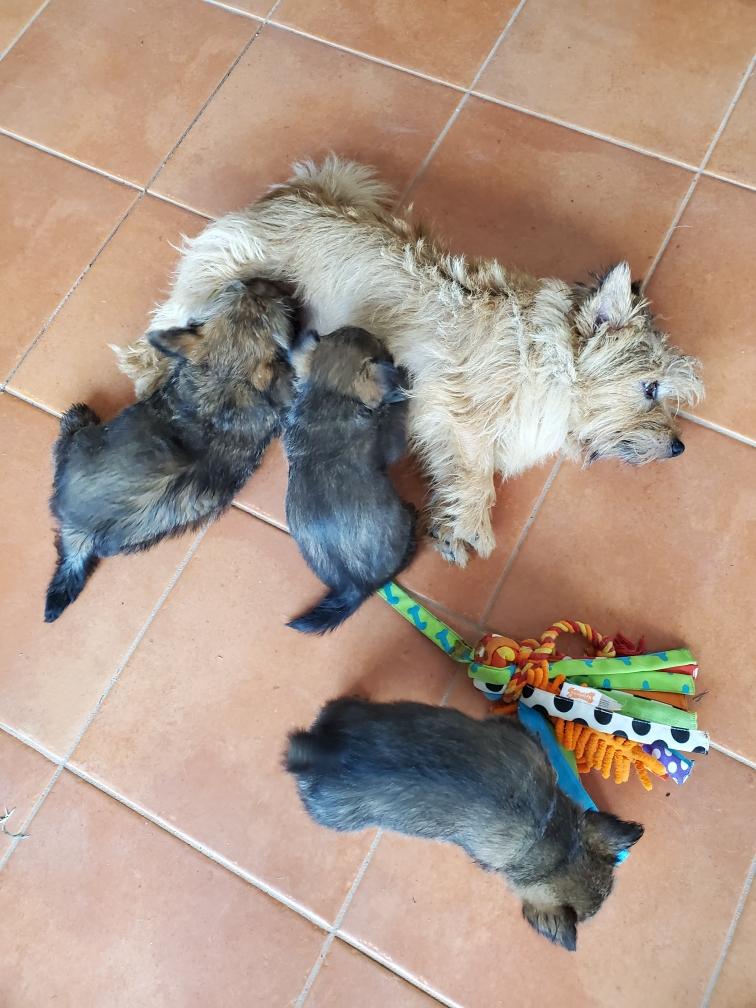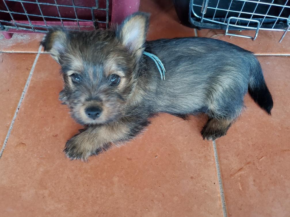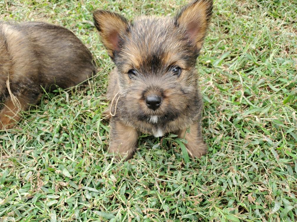 Polly is a "fluffy" Norwich. This means that Polly has two copies of the (recessive) long coat allele that makes a long (and soft) coat. So Polly does not look like a typical Norwich, either in terms of the feel of her coat or its color. In the picture, Polly is shaved down. Gunner does not carry the fluffy allele, so any puppies from a Gunner x Polly breeding will have a normal Norwich coat.