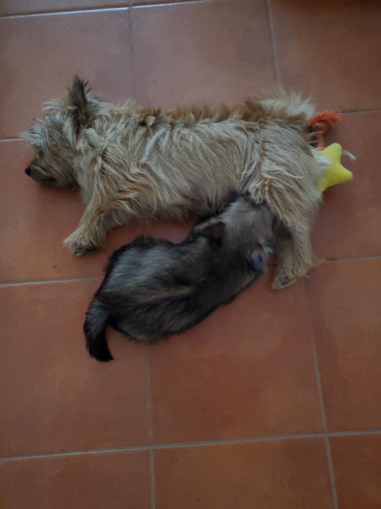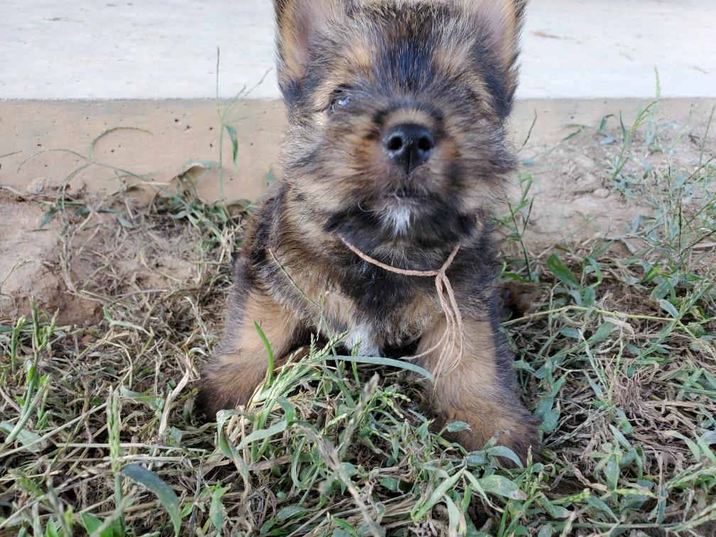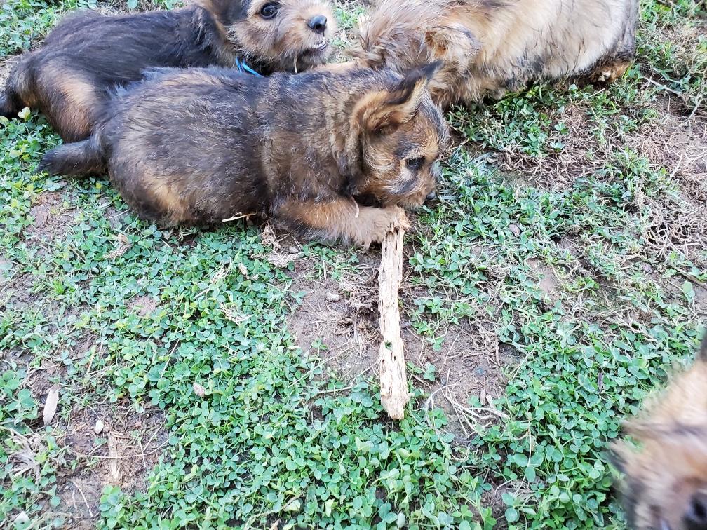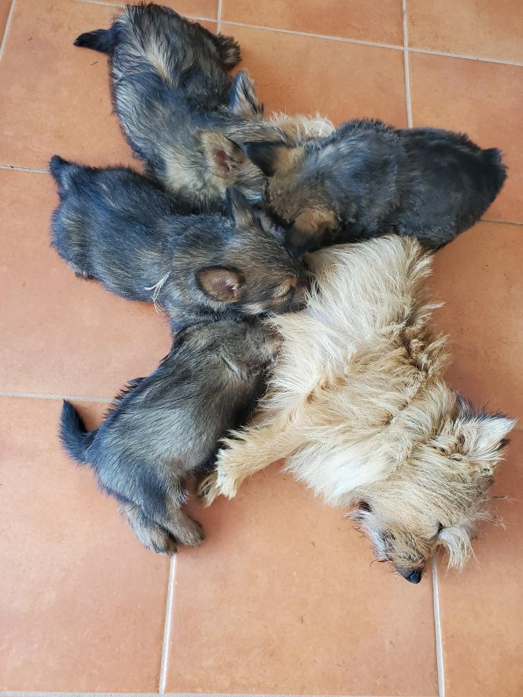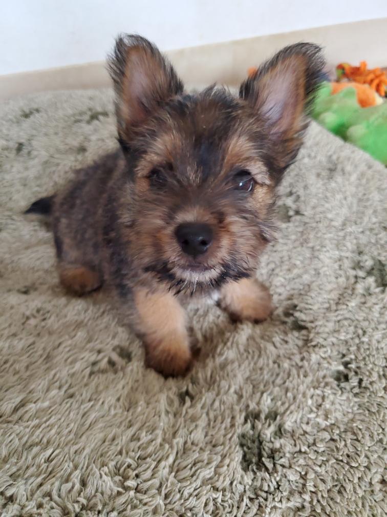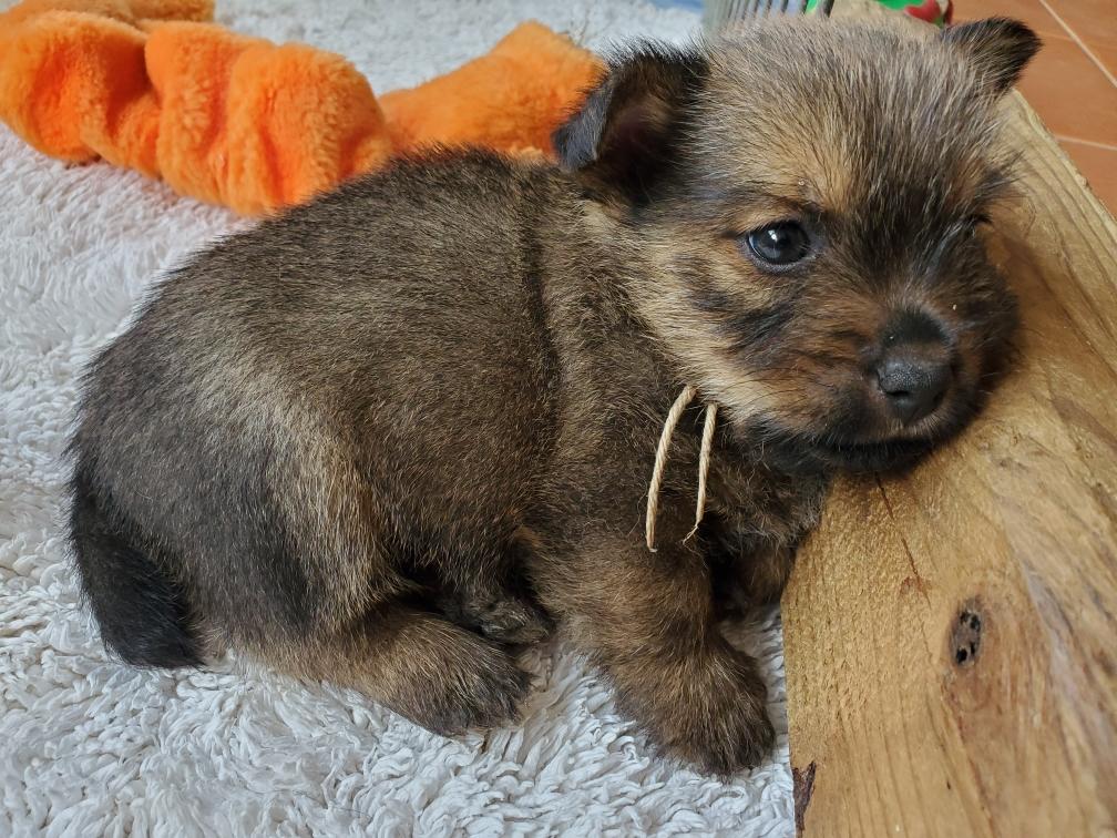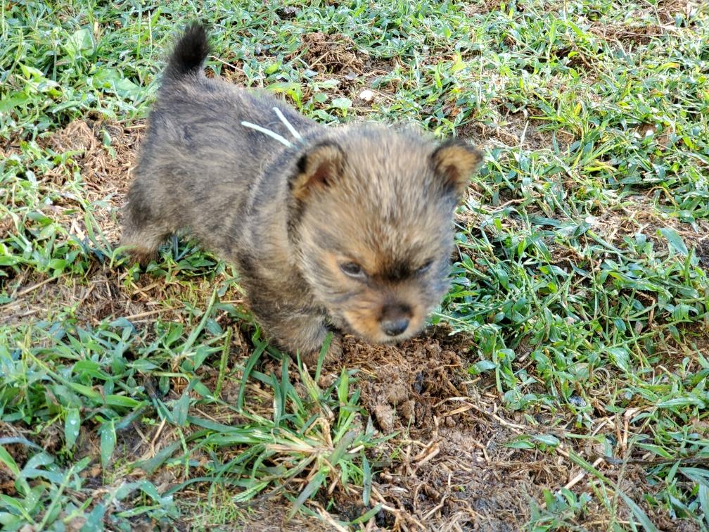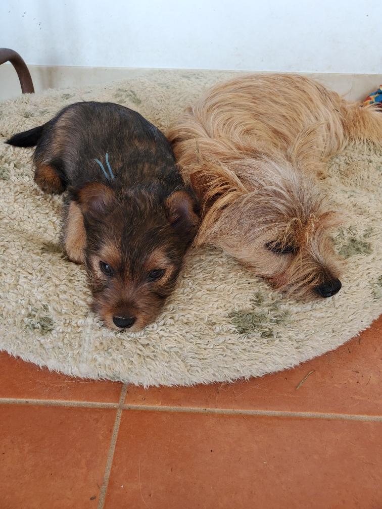 Polly is a "fluffy" Norwich. This means that Polly has two copies of the (recessive) long coat allele that makes a long (and soft) coat. So Polly does not look like a typical Norwich, either in terms of the feel of her coat or its color. In the picture, Polly is shaved down. Gunner does not carry the fluffy allele, so any puppies from a Gunner x Polly breeding will have a normal Norwich coat.