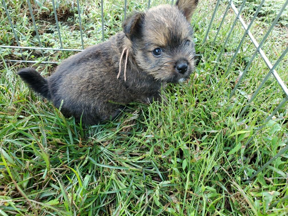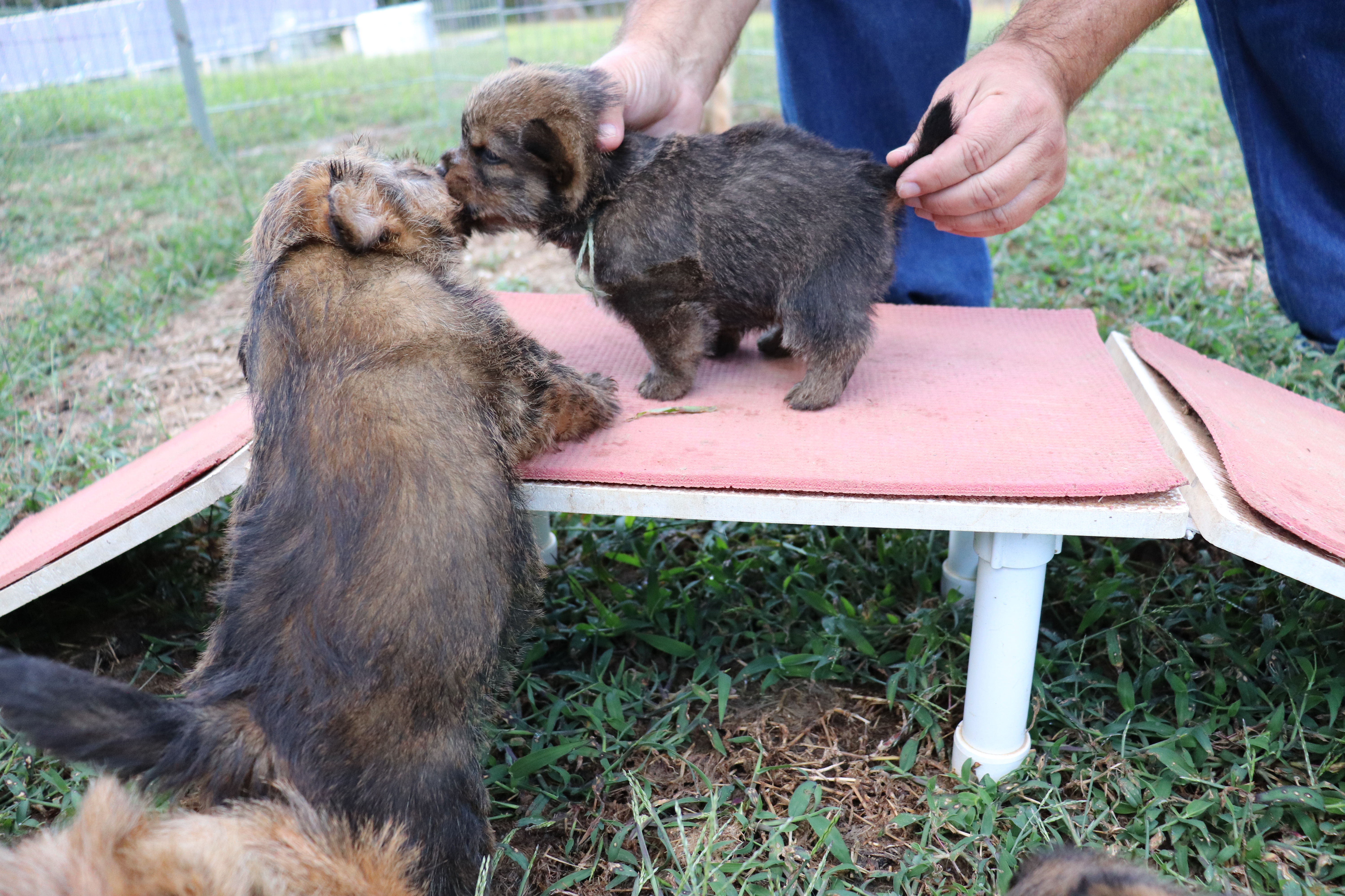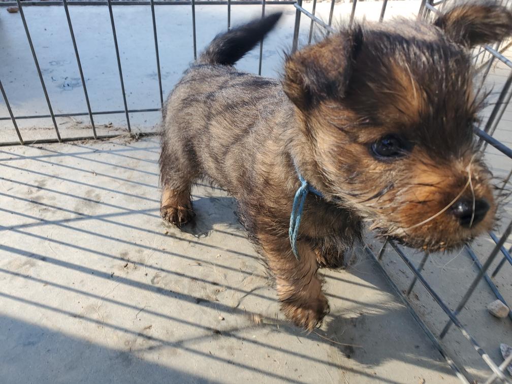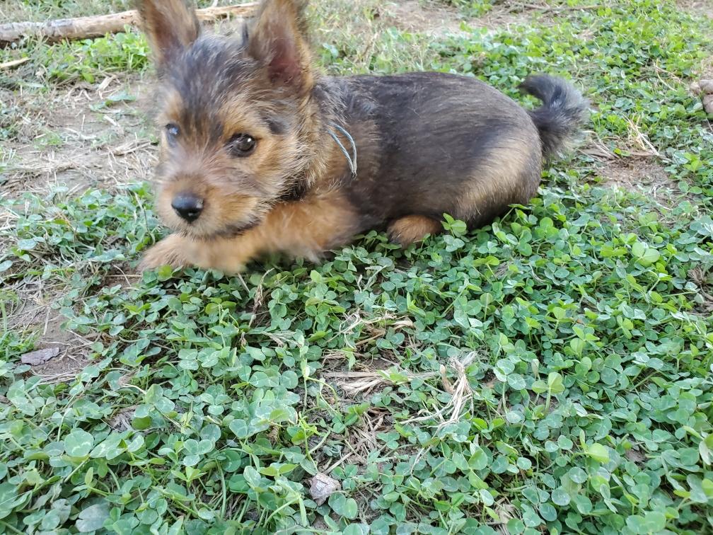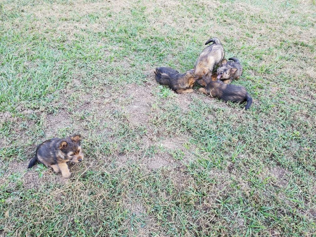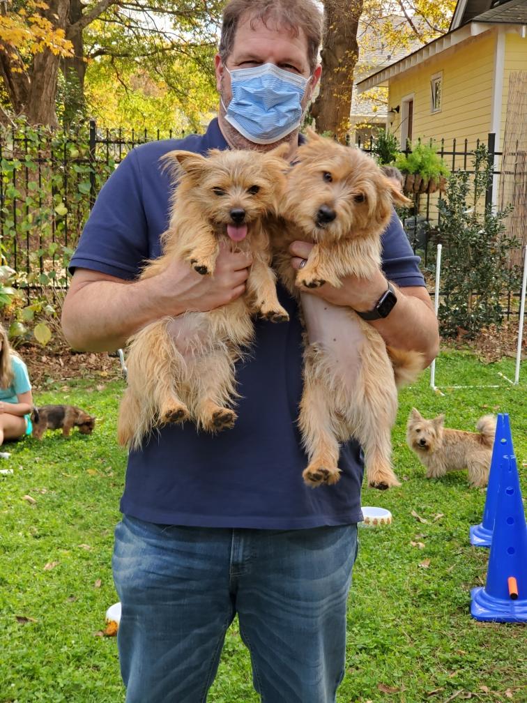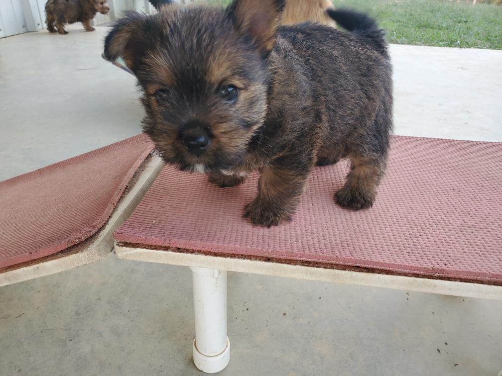 Polly is a "fluffy" Norwich. This means that Polly has two copies of the (recessive) long coat allele that makes a long (and soft) coat. So Polly does not look like a typical Norwich, either in terms of the feel of her coat or its color. In the picture, Polly is shaved down. Gunner does not carry the fluffy allele, so any puppies from a Gunner x Polly breeding will have a normal Norwich coat.