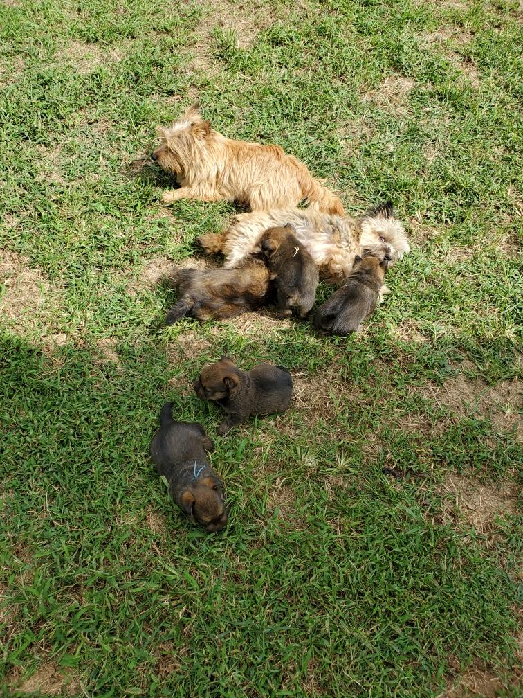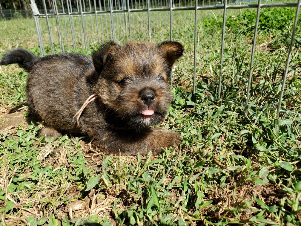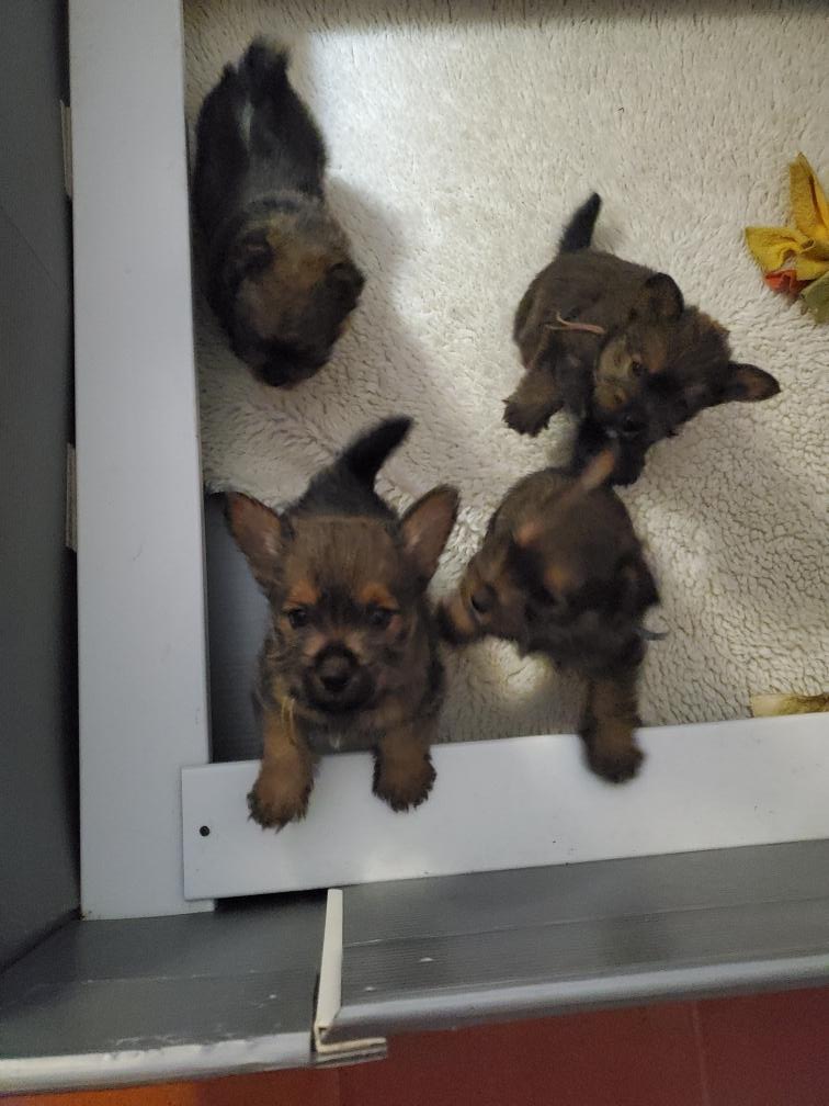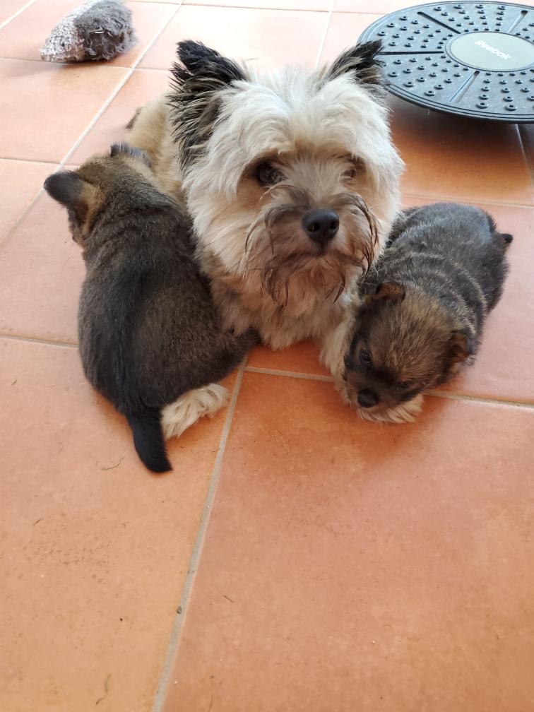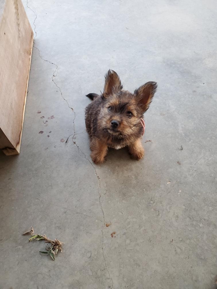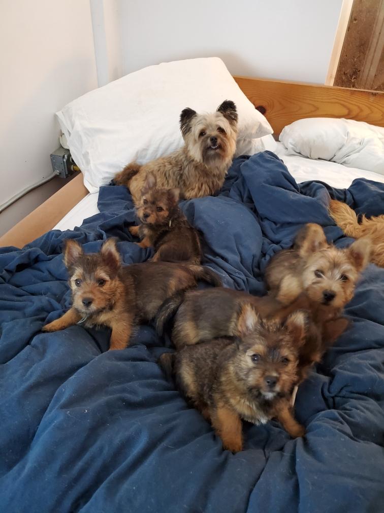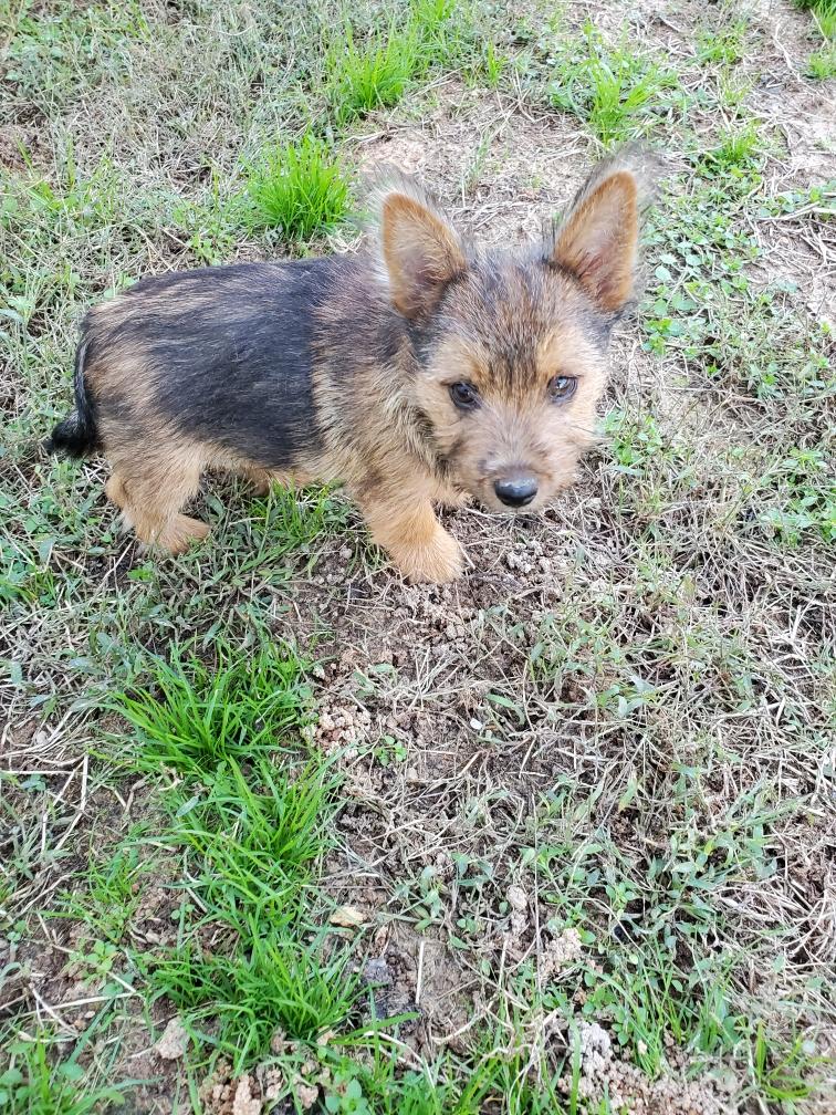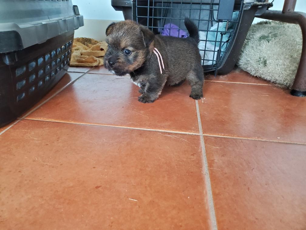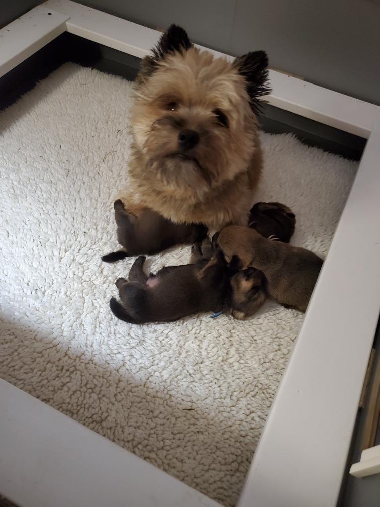 Polly is a "fluffy" Norwich. This means that Polly has two copies of the (recessive) long coat allele that makes a long (and soft) coat. So Polly does not look like a typical Norwich, either in terms of the feel of her coat or its color. In the picture, Polly is shaved down. Gunner does not carry the fluffy allele, so any puppies from a Gunner x Polly breeding will have a normal Norwich coat.