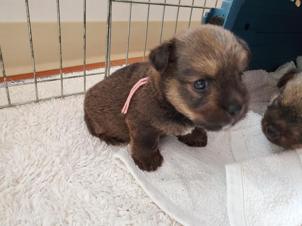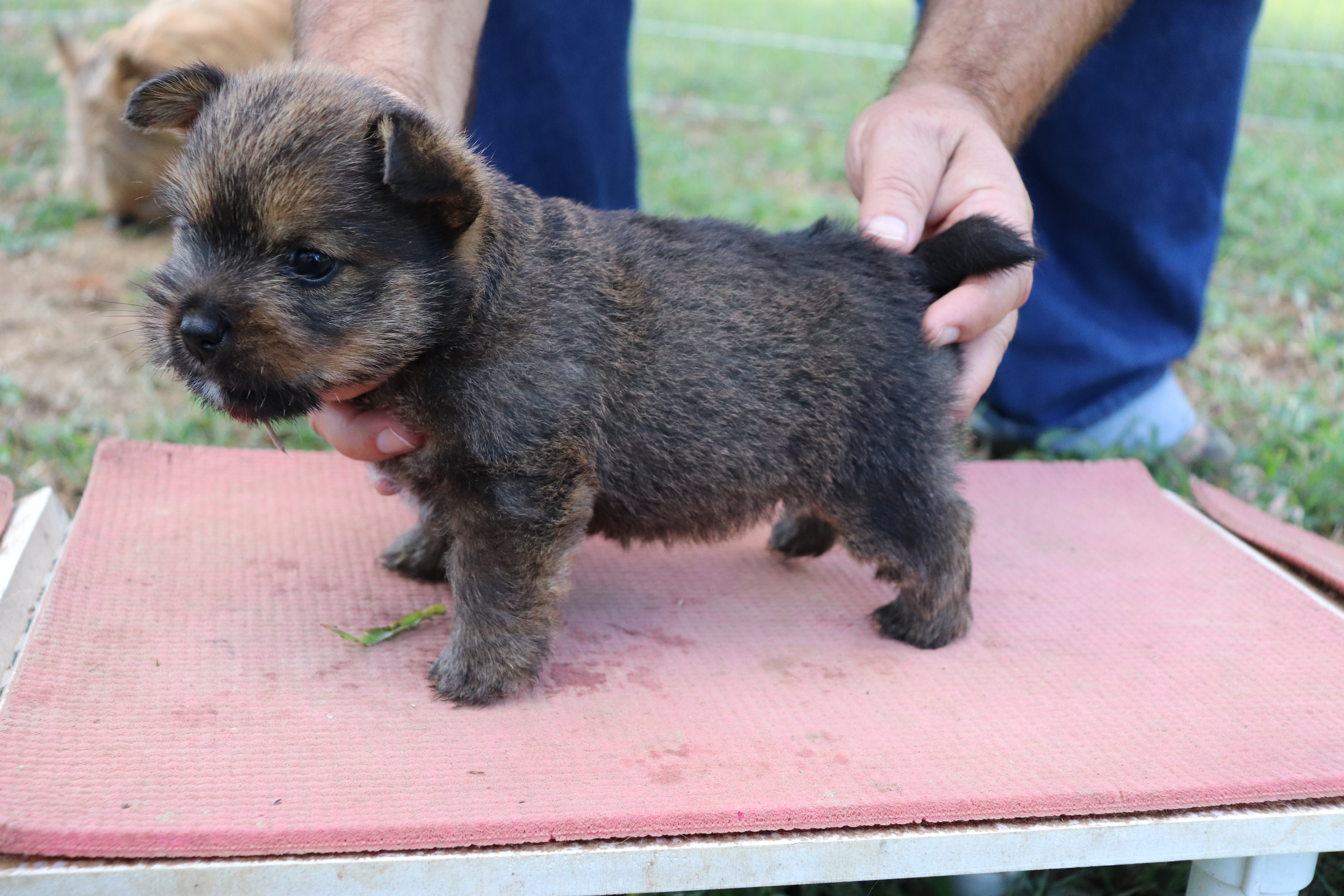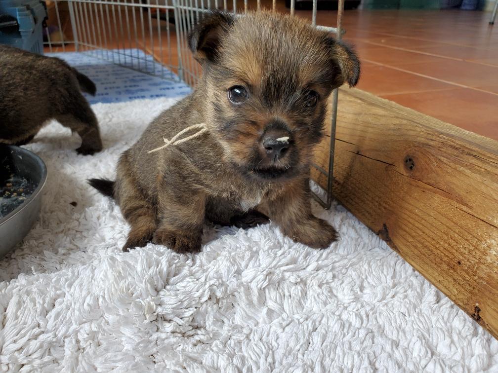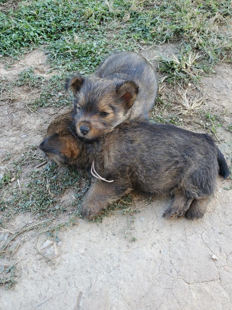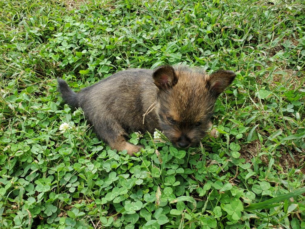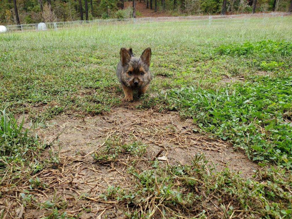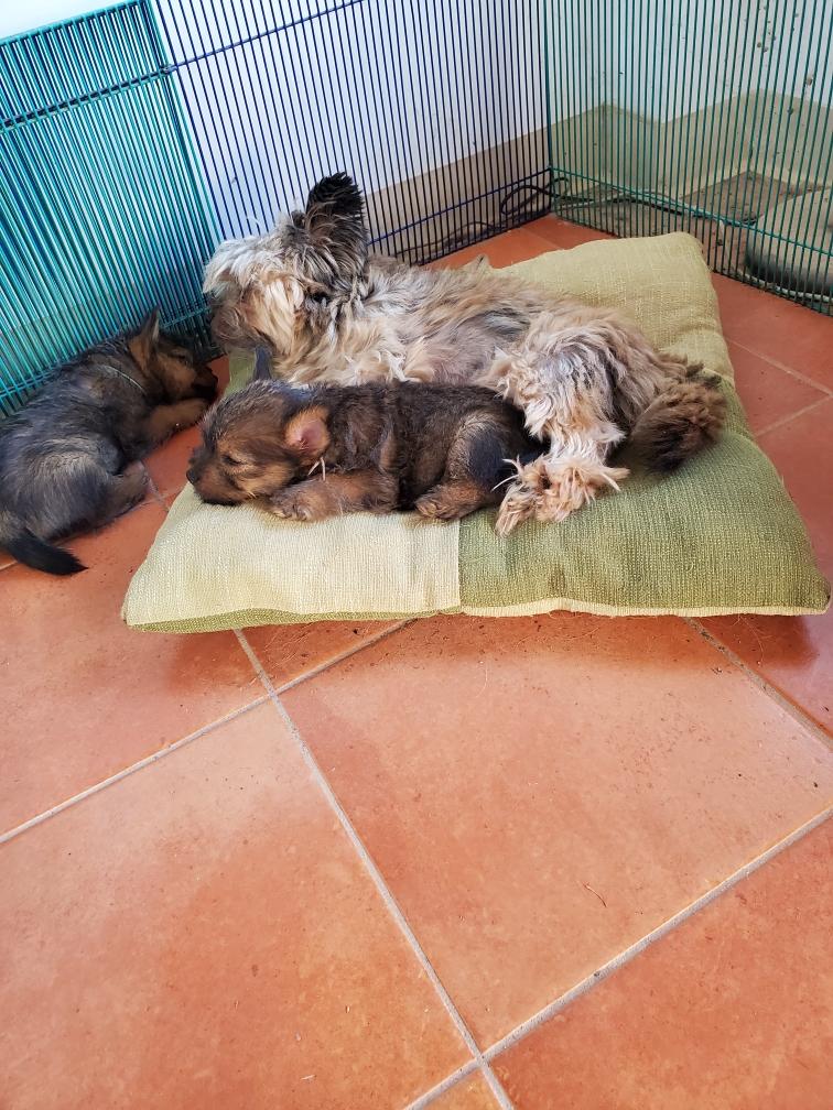 Polly is a "fluffy" Norwich. This means that Polly has two copies of the (recessive) long coat allele that makes a long (and soft) coat. So Polly does not look like a typical Norwich, either in terms of the feel of her coat or its color. In the picture, Polly is shaved down. Gunner does not carry the fluffy allele, so any puppies from a Gunner x Polly breeding will have a normal Norwich coat.