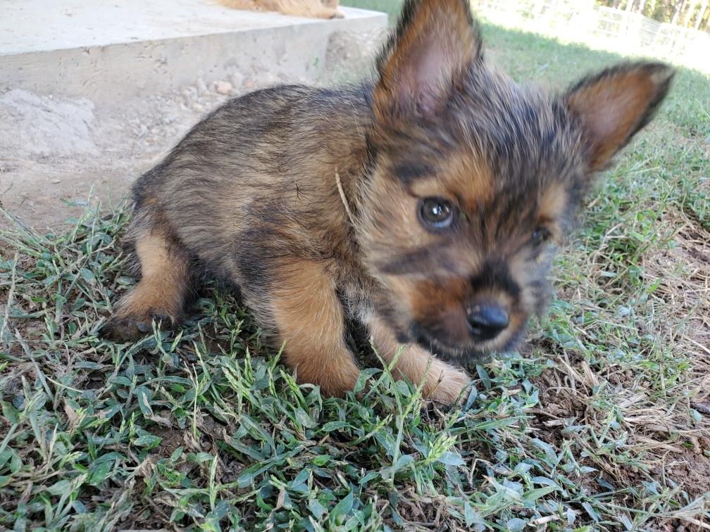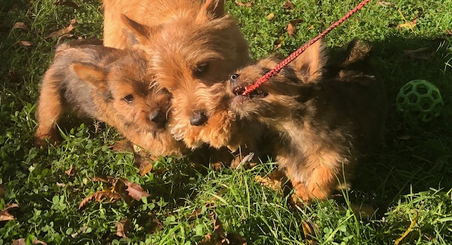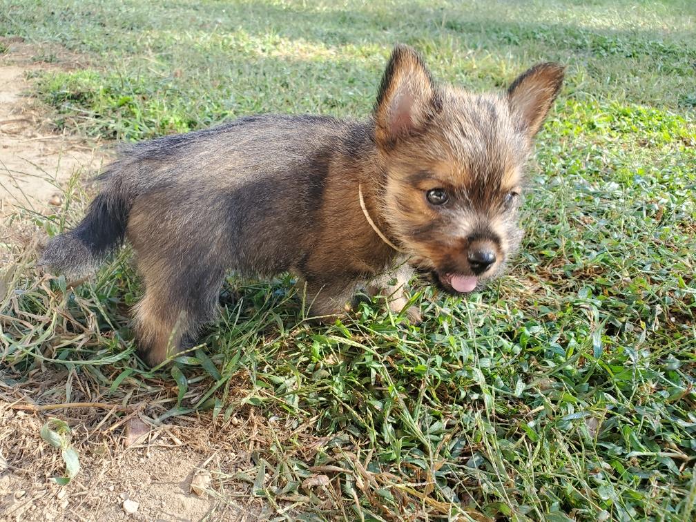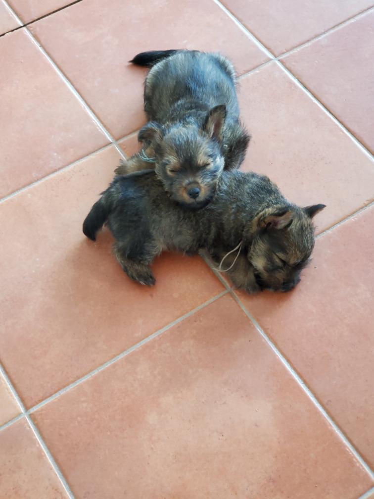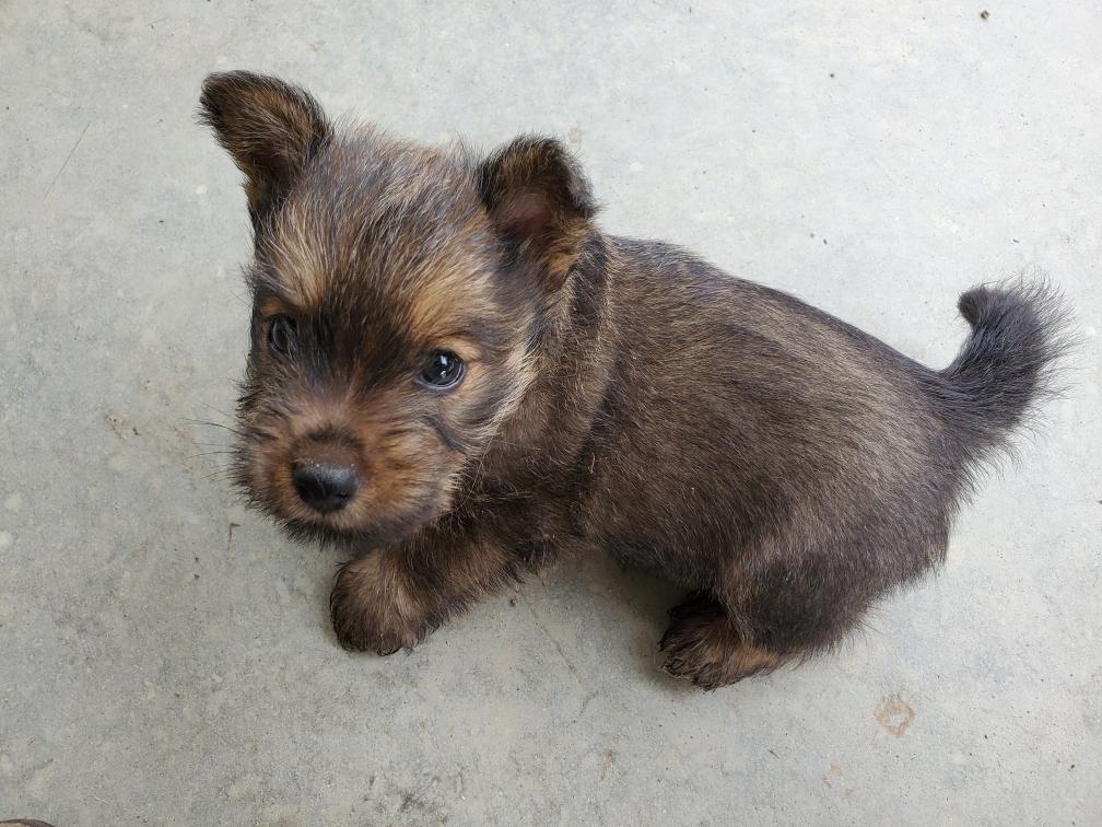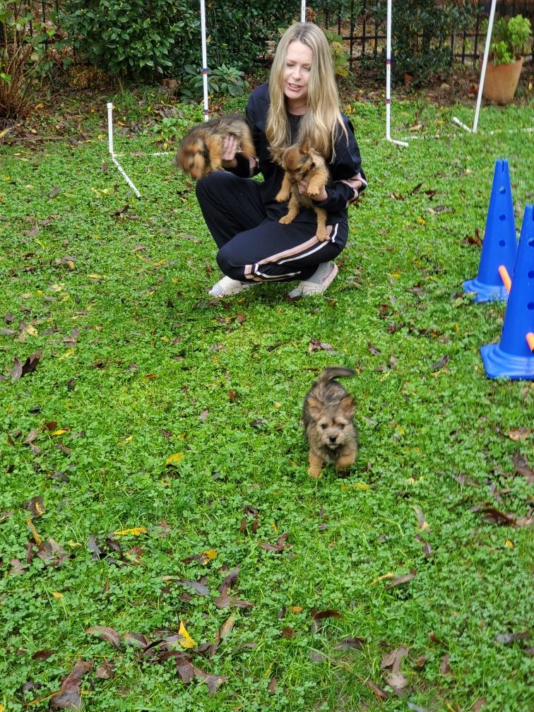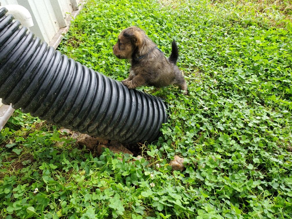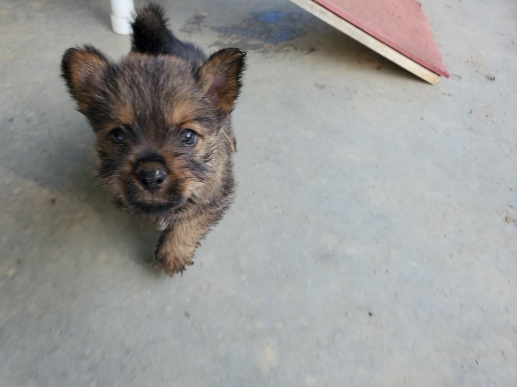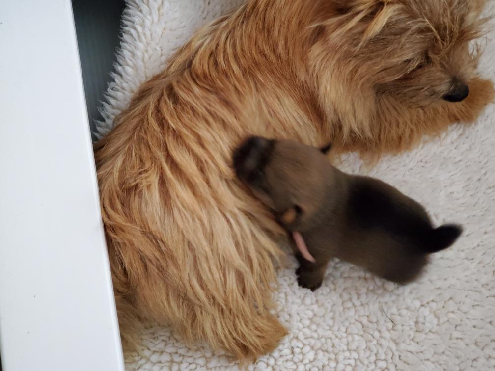 Polly is a "fluffy" Norwich. This means that Polly has two copies of the (recessive) long coat allele that makes a long (and soft) coat. So Polly does not look like a typical Norwich, either in terms of the feel of her coat or its color. In the picture, Polly is shaved down. Gunner does not carry the fluffy allele, so any puppies from a Gunner x Polly breeding will have a normal Norwich coat.