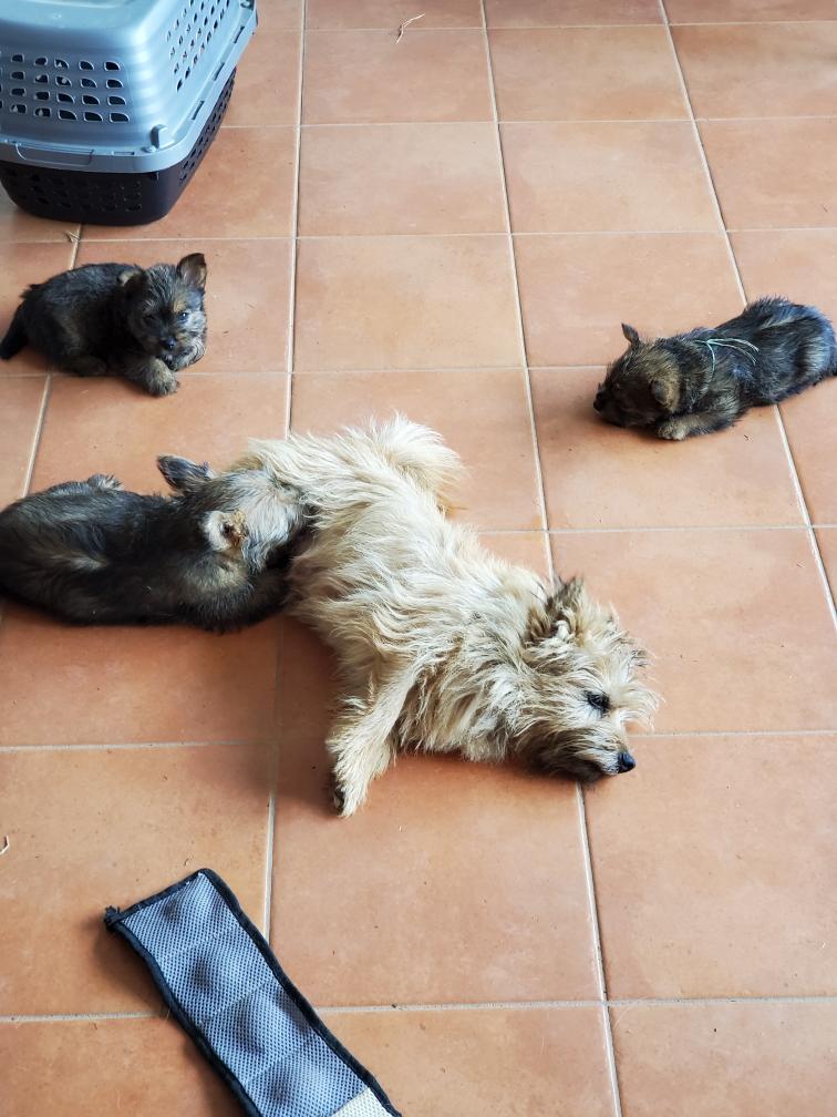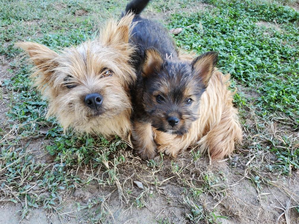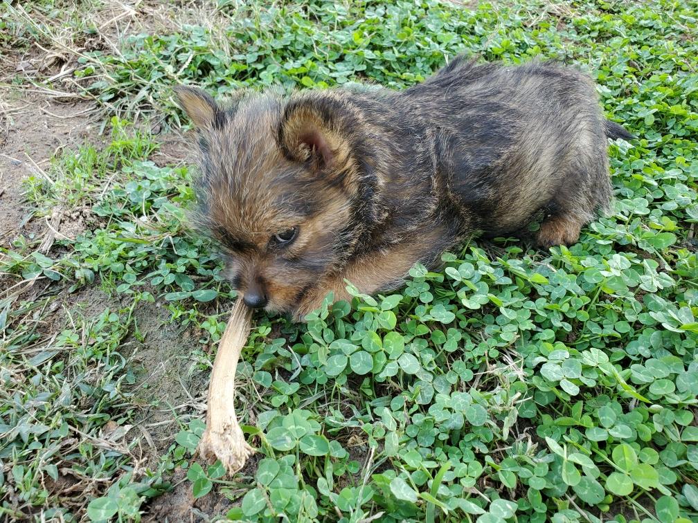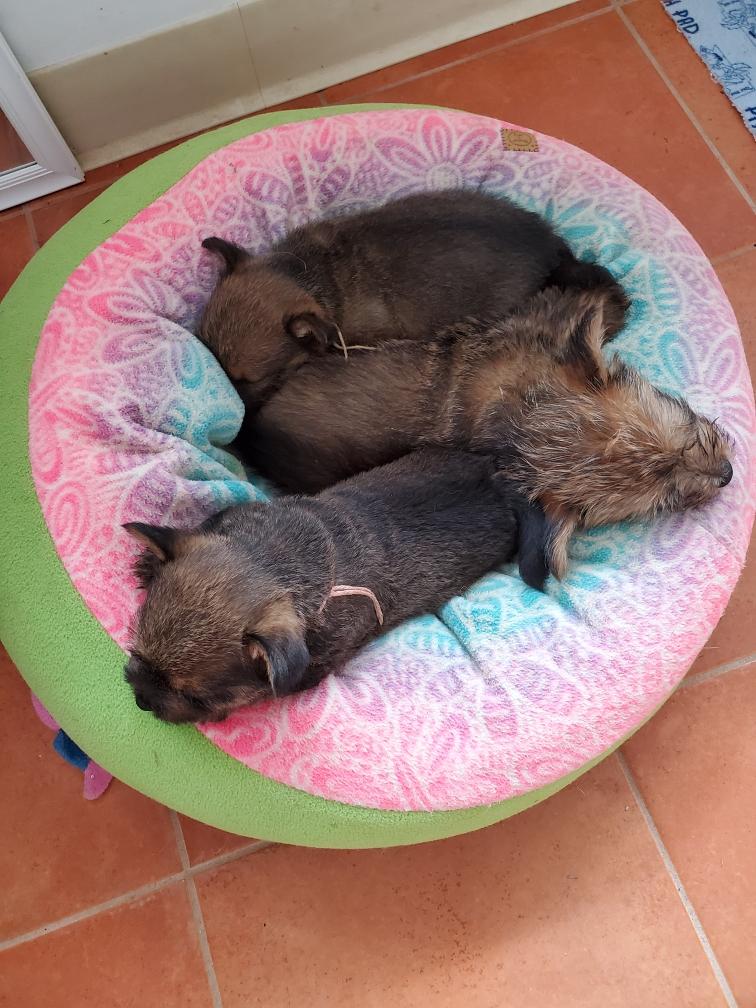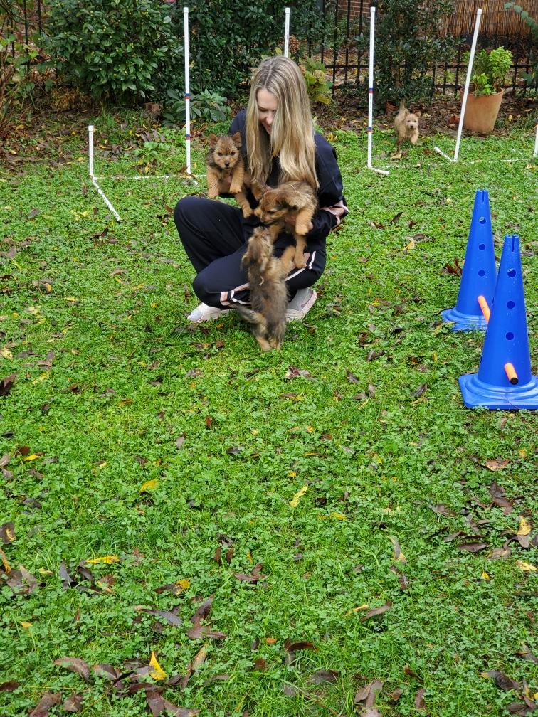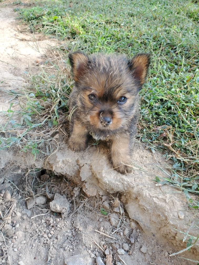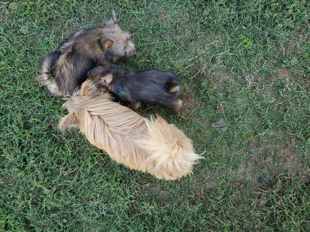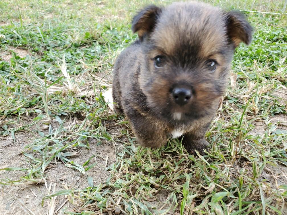 Polly is a "fluffy" Norwich. This means that Polly has two copies of the (recessive) long coat allele that makes a long (and soft) coat. So Polly does not look like a typical Norwich, either in terms of the feel of her coat or its color. In the picture, Polly is shaved down. Gunner does not carry the fluffy allele, so any puppies from a Gunner x Polly breeding will have a normal Norwich coat.