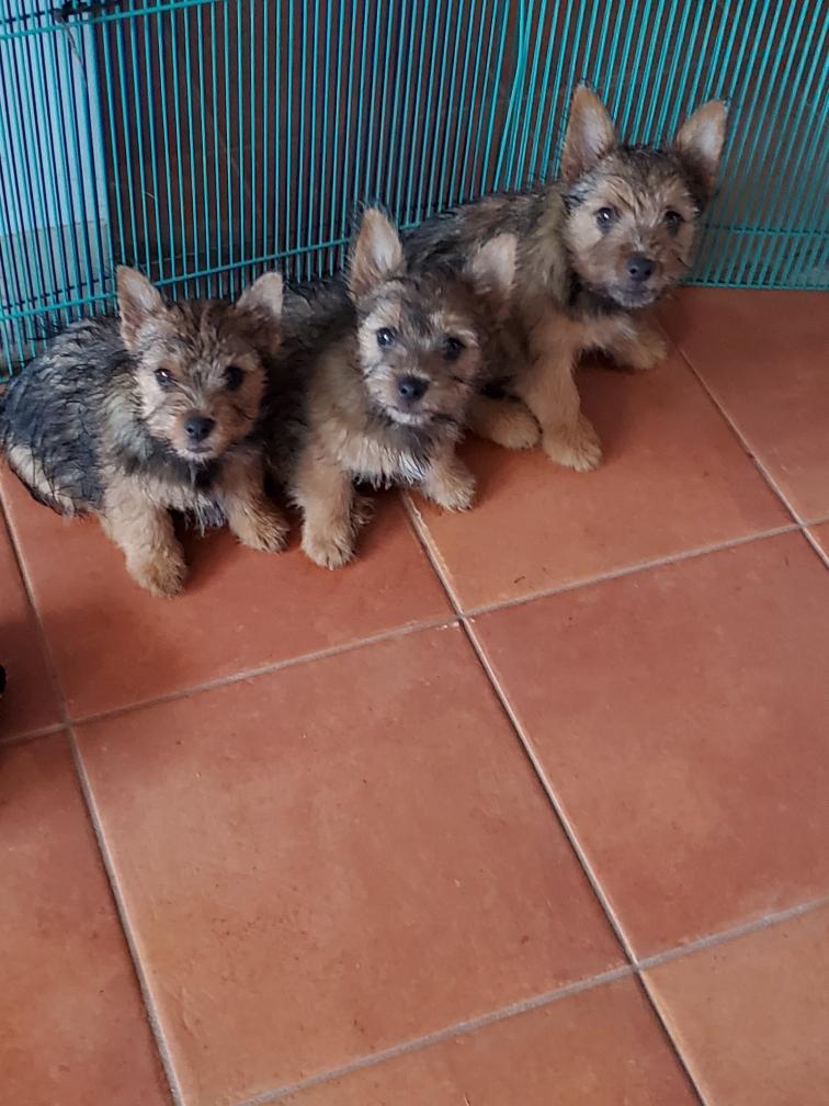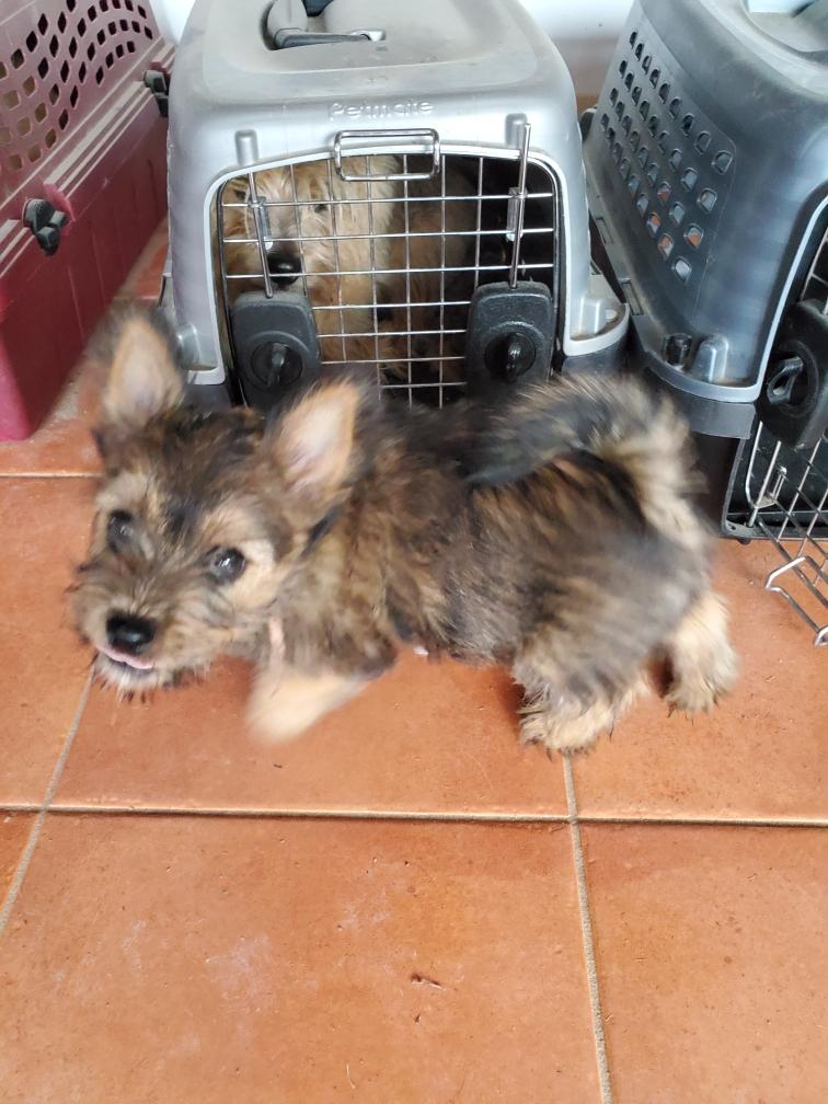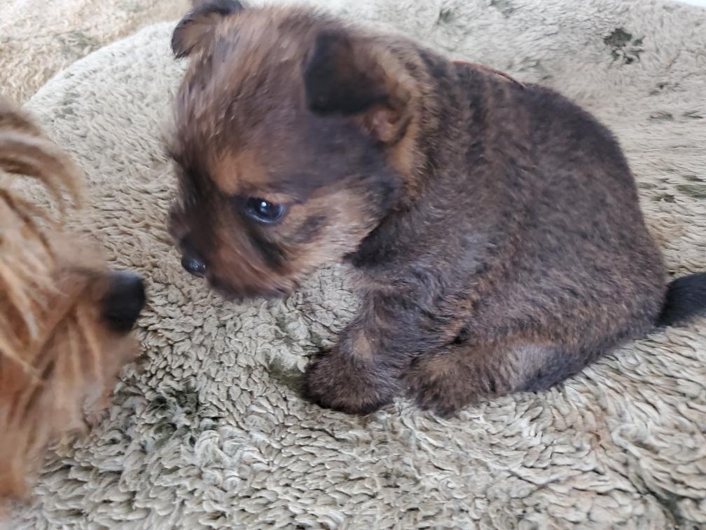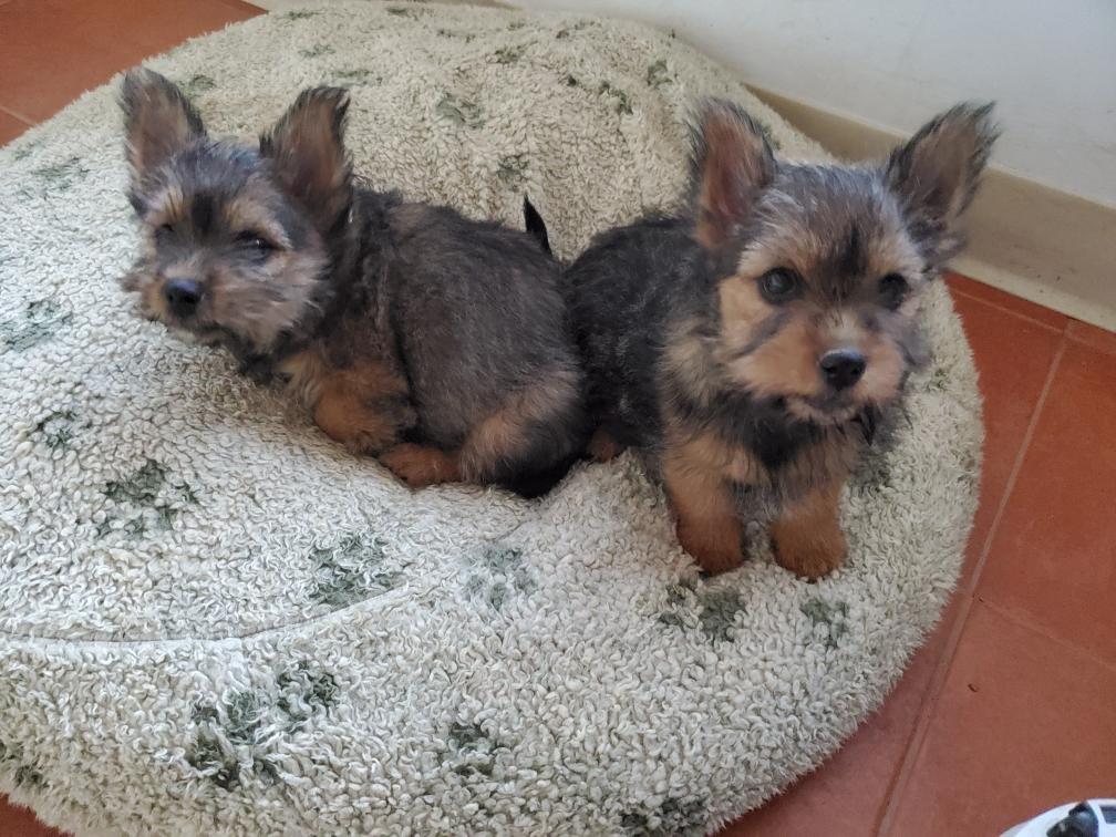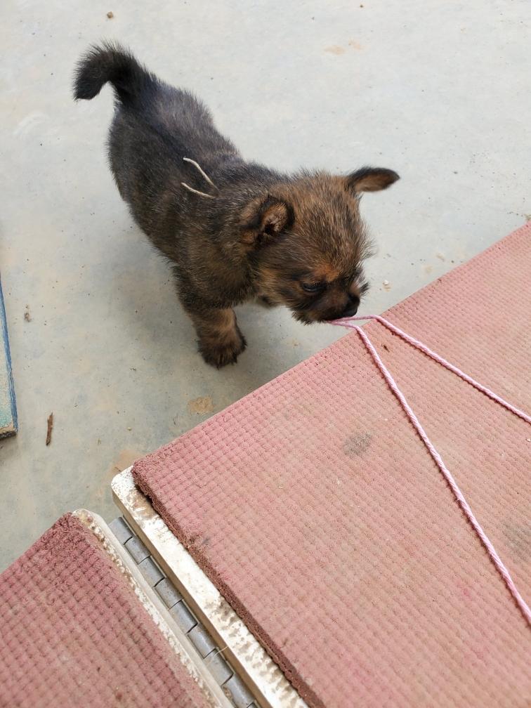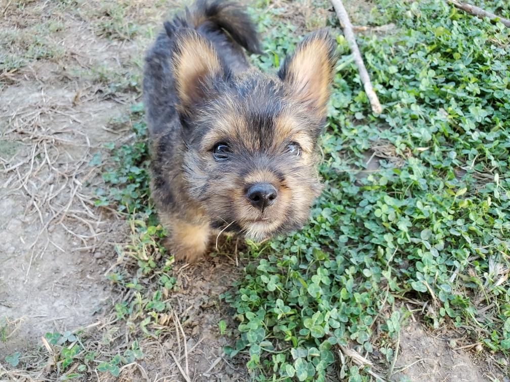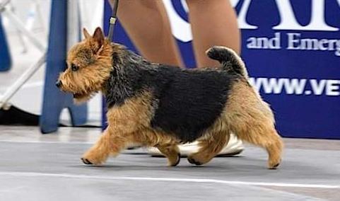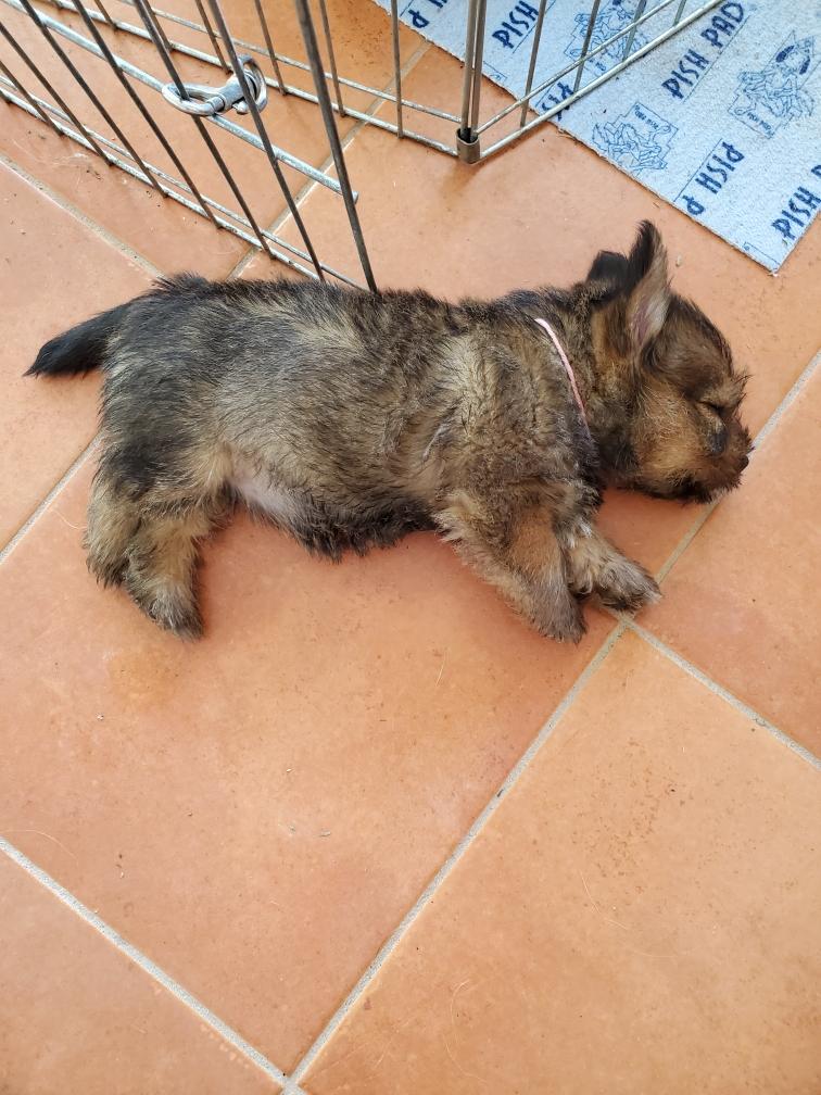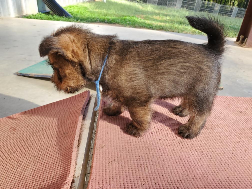 Polly is a "fluffy" Norwich. This means that Polly has two copies of the (recessive) long coat allele that makes a long (and soft) coat. So Polly does not look like a typical Norwich, either in terms of the feel of her coat or its color. In the picture, Polly is shaved down. Gunner does not carry the fluffy allele, so any puppies from a Gunner x Polly breeding will have a normal Norwich coat.