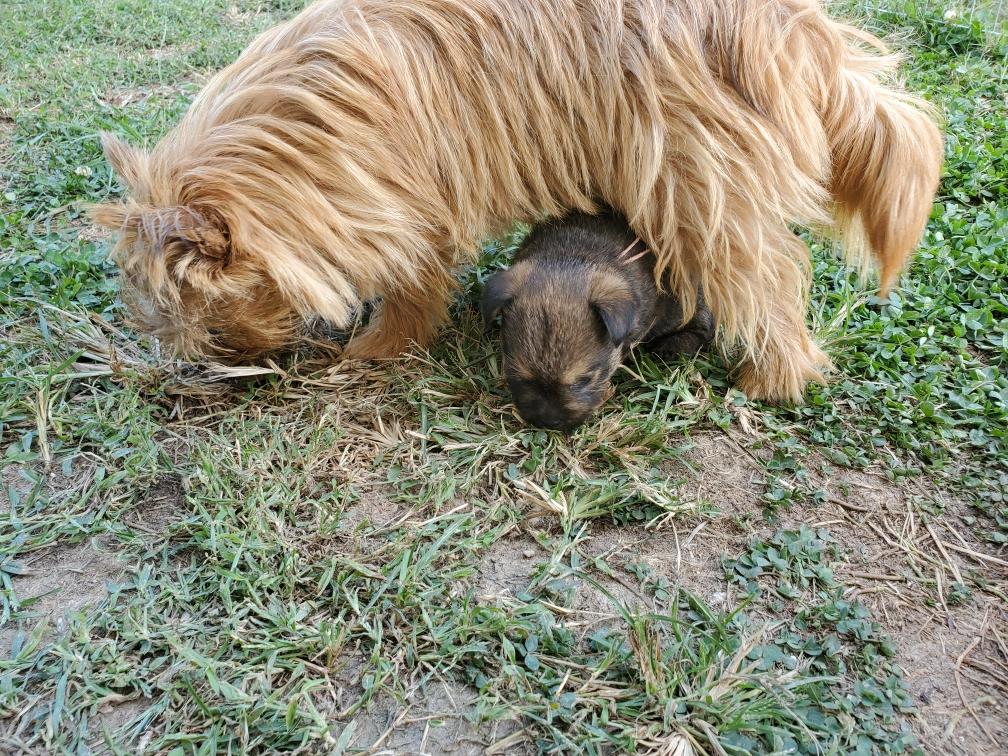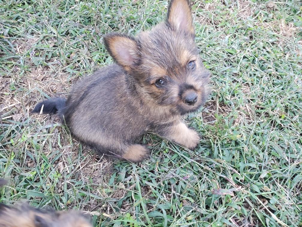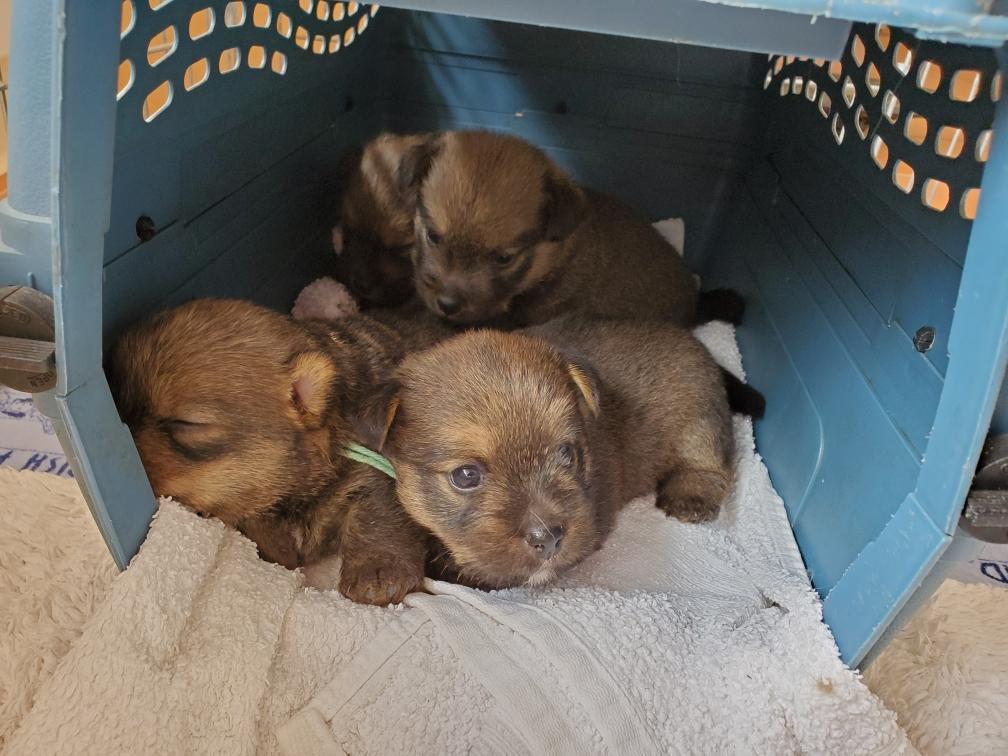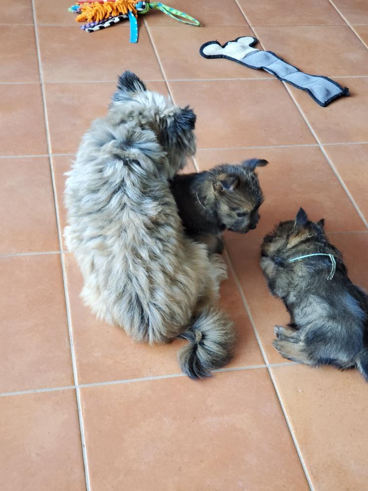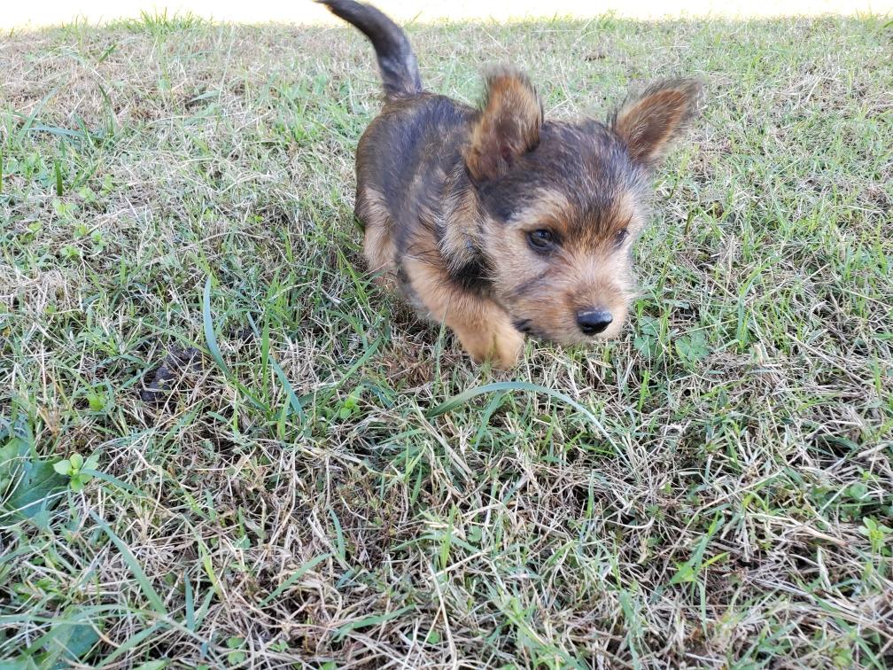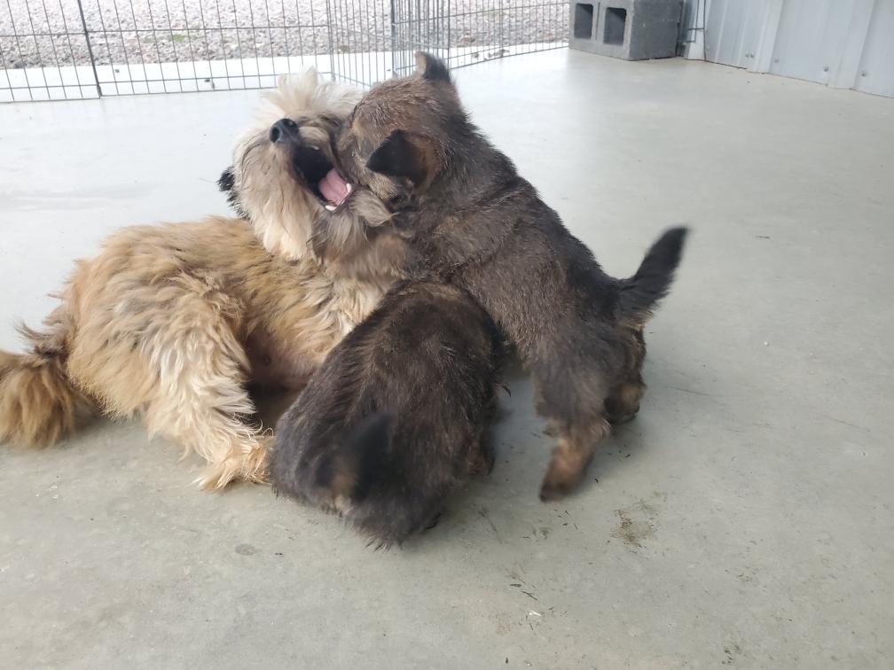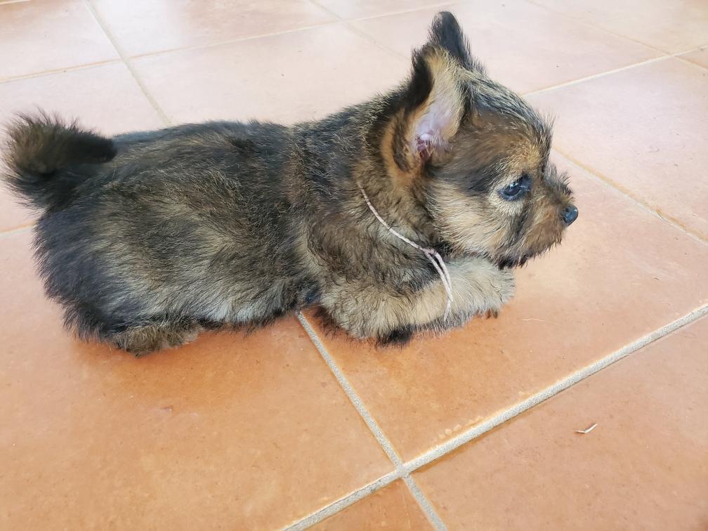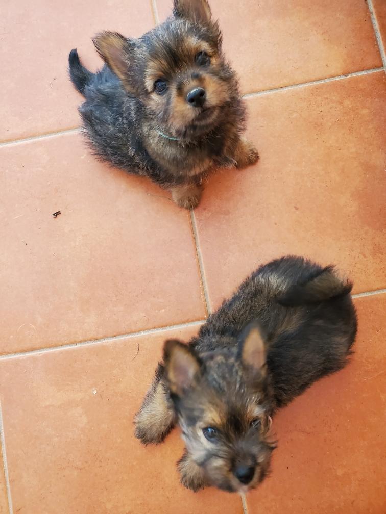 Polly is a "fluffy" Norwich. This means that Polly has two copies of the (recessive) long coat allele that makes a long (and soft) coat. So Polly does not look like a typical Norwich, either in terms of the feel of her coat or its color. In the picture, Polly is shaved down. Gunner does not carry the fluffy allele, so any puppies from a Gunner x Polly breeding will have a normal Norwich coat.