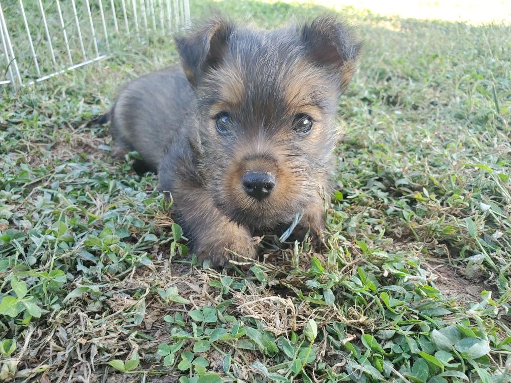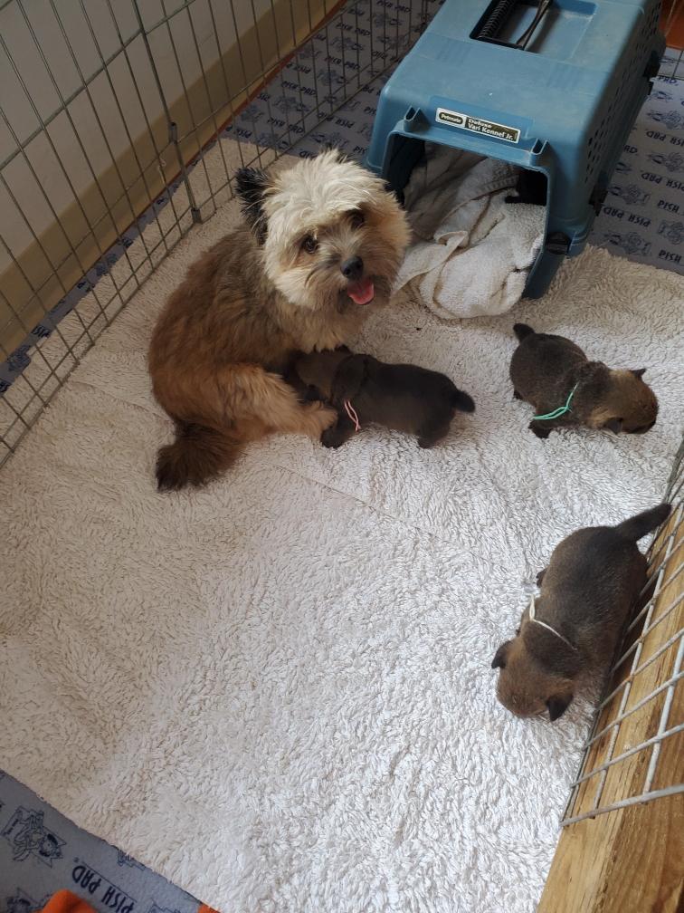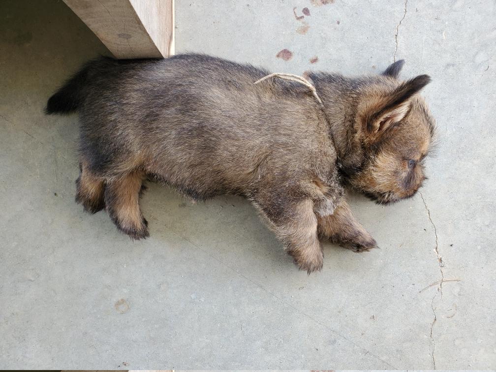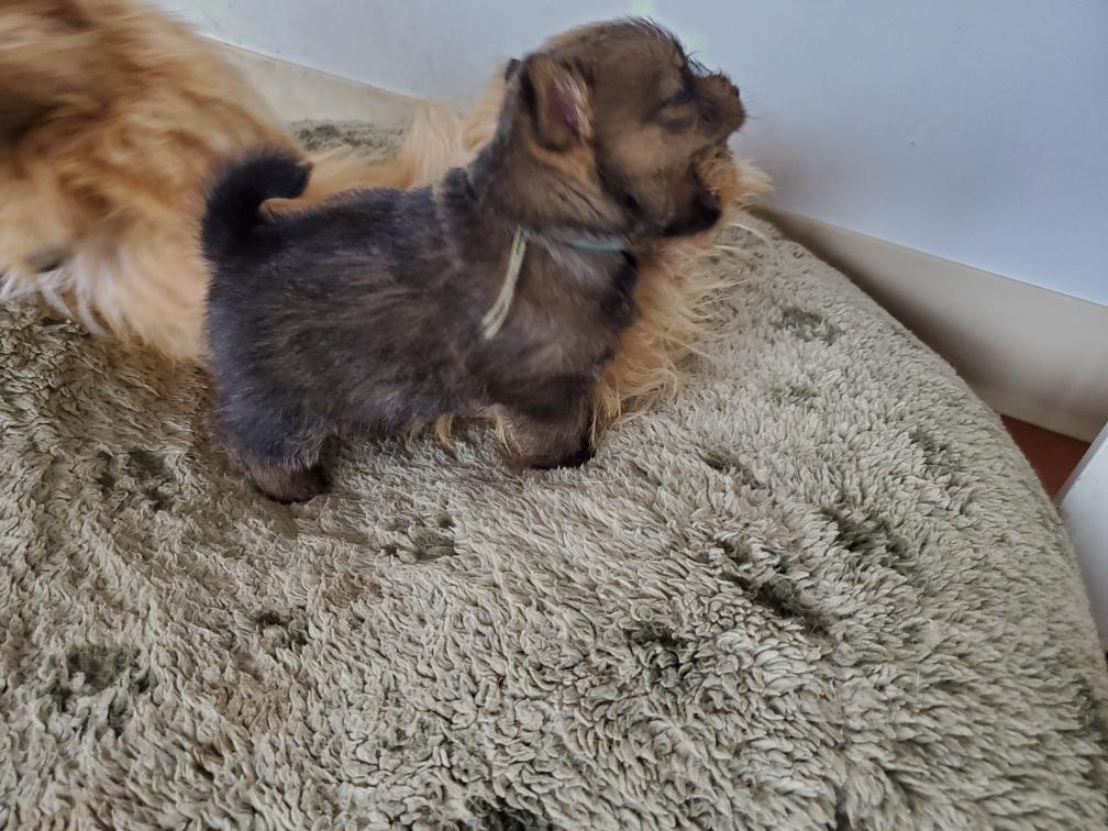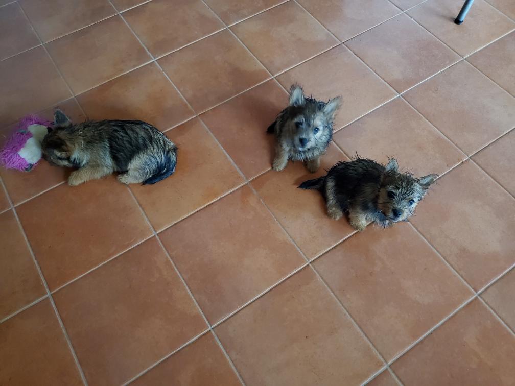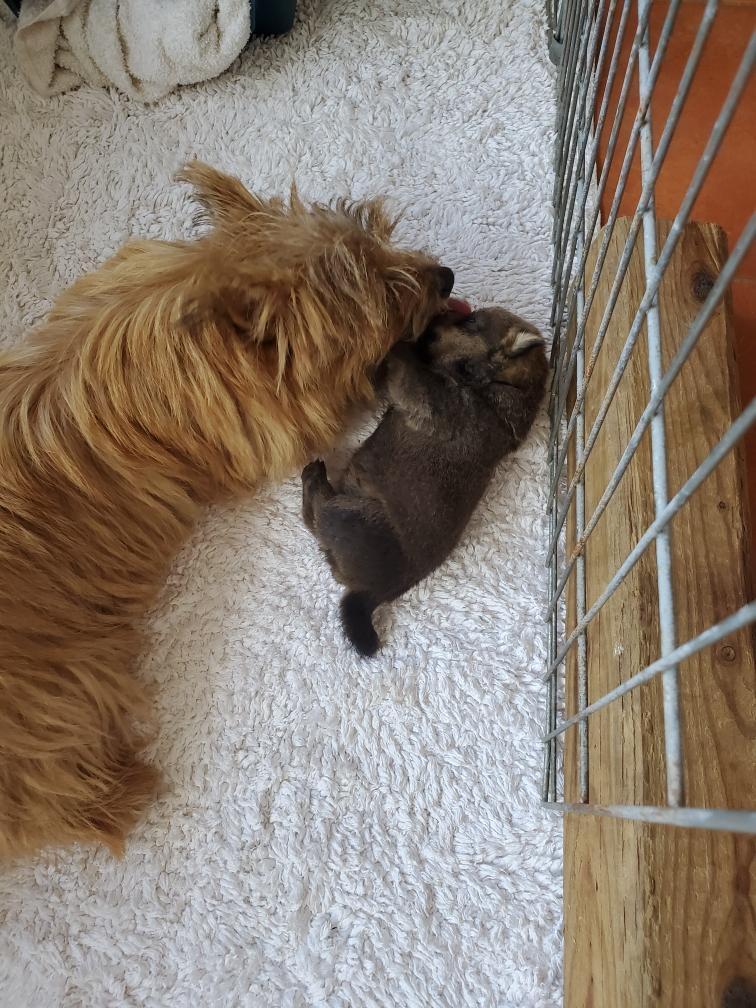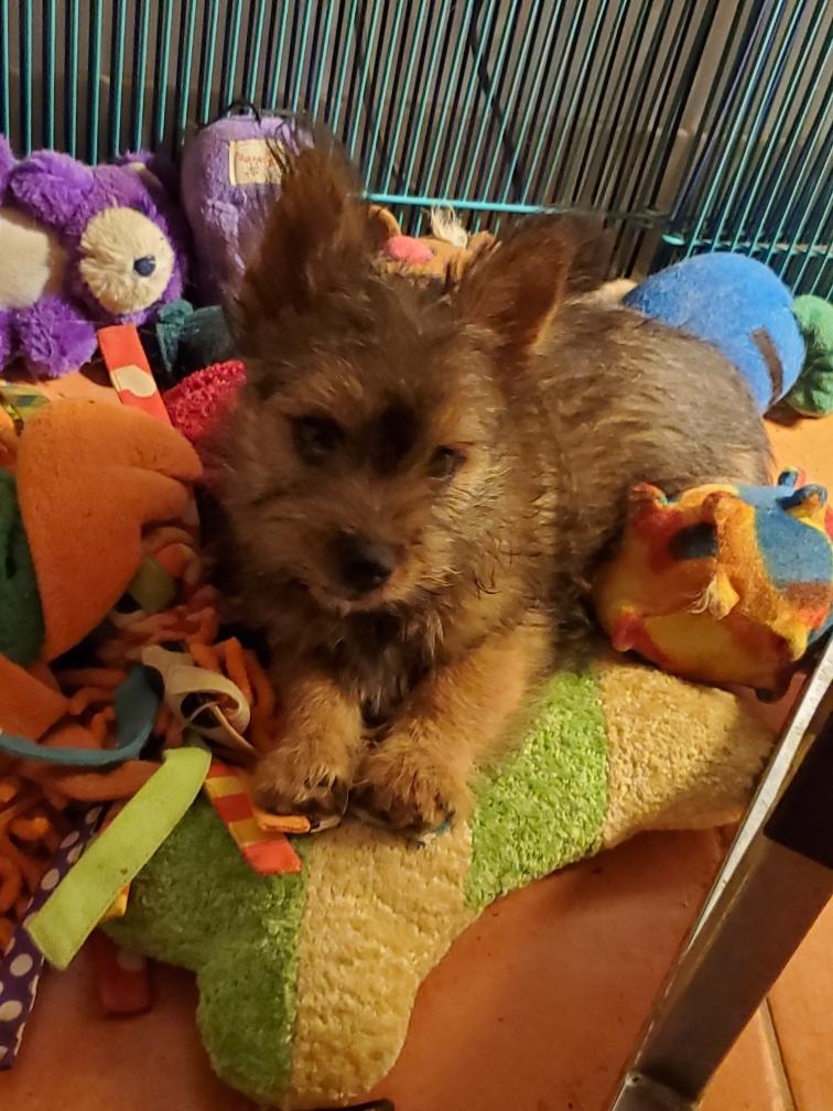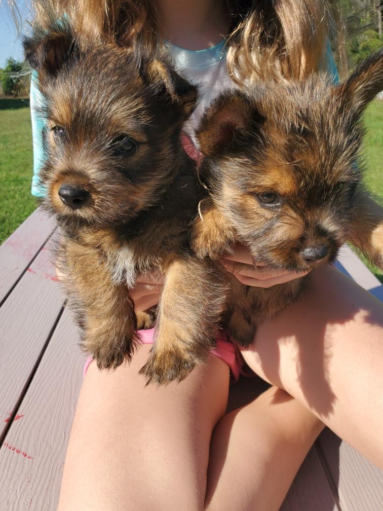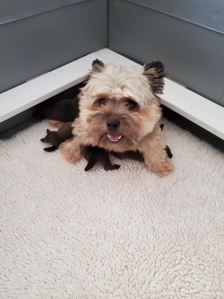 Polly is a "fluffy" Norwich. This means that Polly has two copies of the (recessive) long coat allele that makes a long (and soft) coat. So Polly does not look like a typical Norwich, either in terms of the feel of her coat or its color. In the picture, Polly is shaved down. Gunner does not carry the fluffy allele, so any puppies from a Gunner x Polly breeding will have a normal Norwich coat.