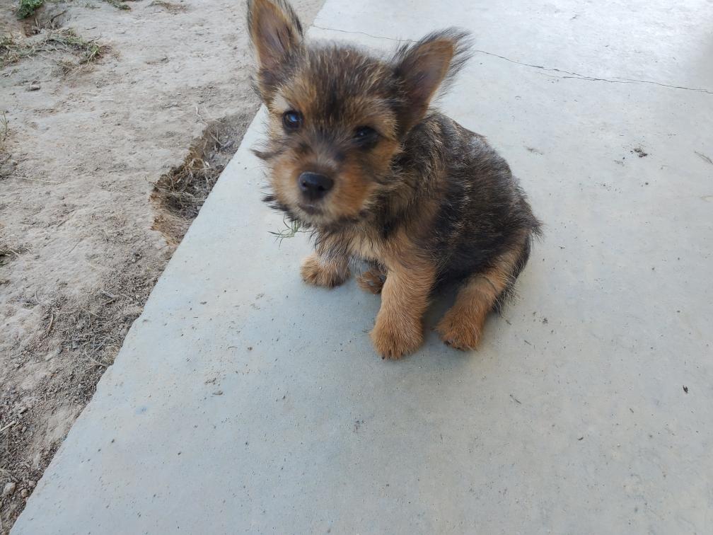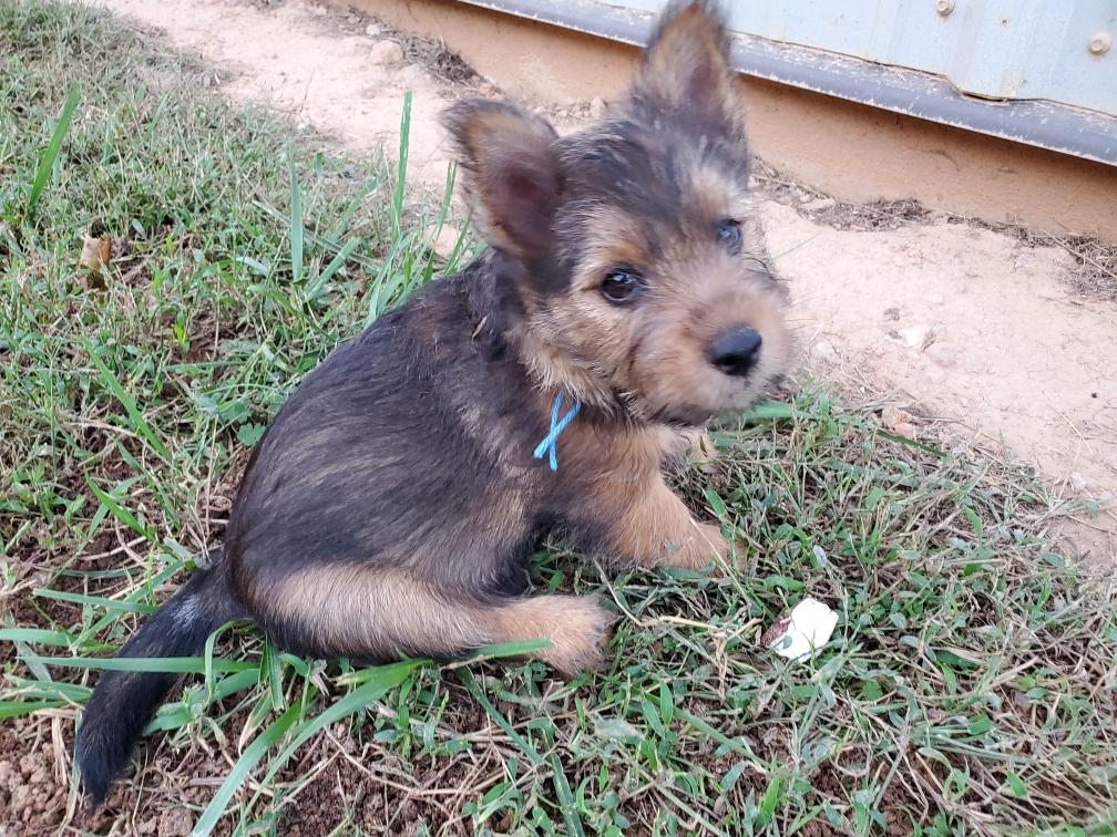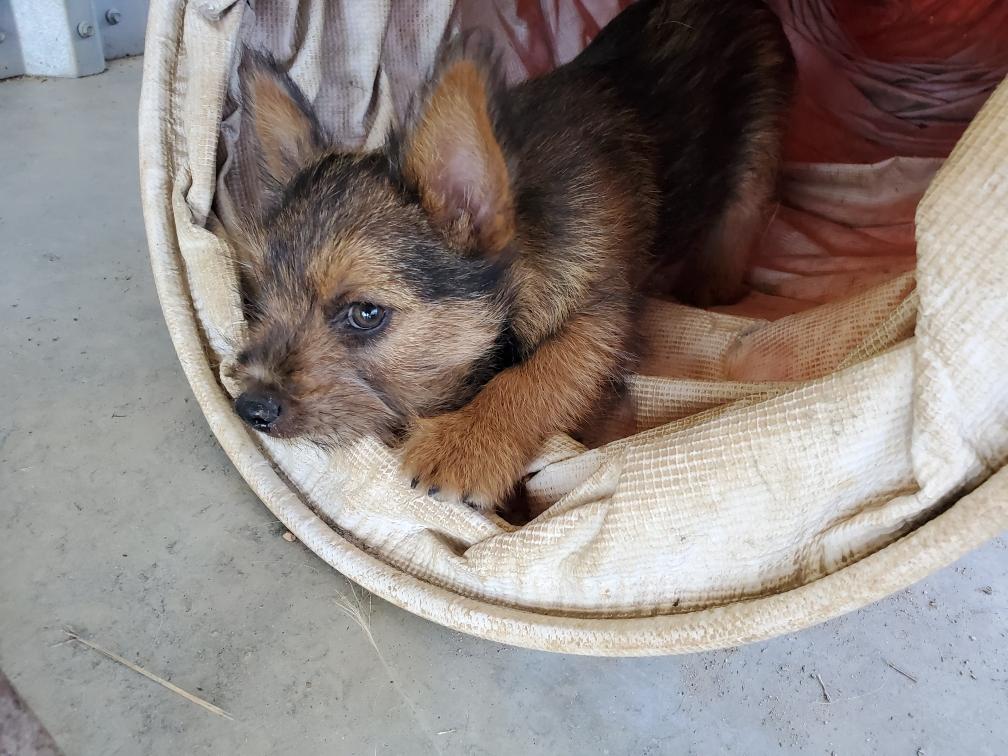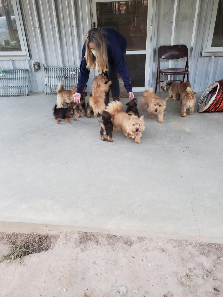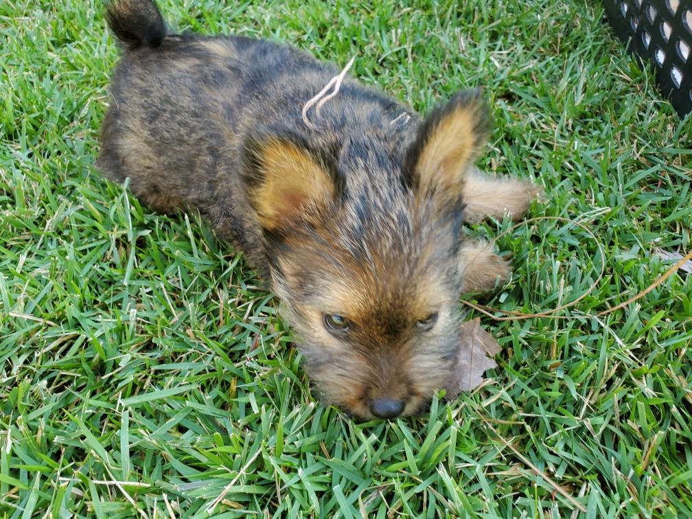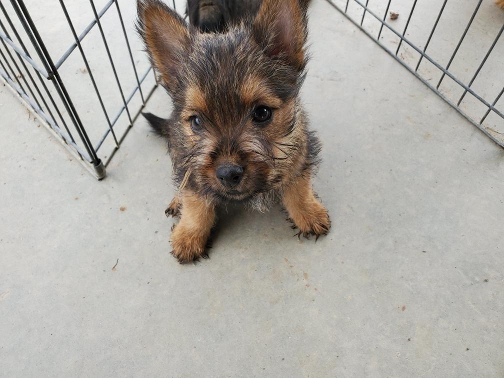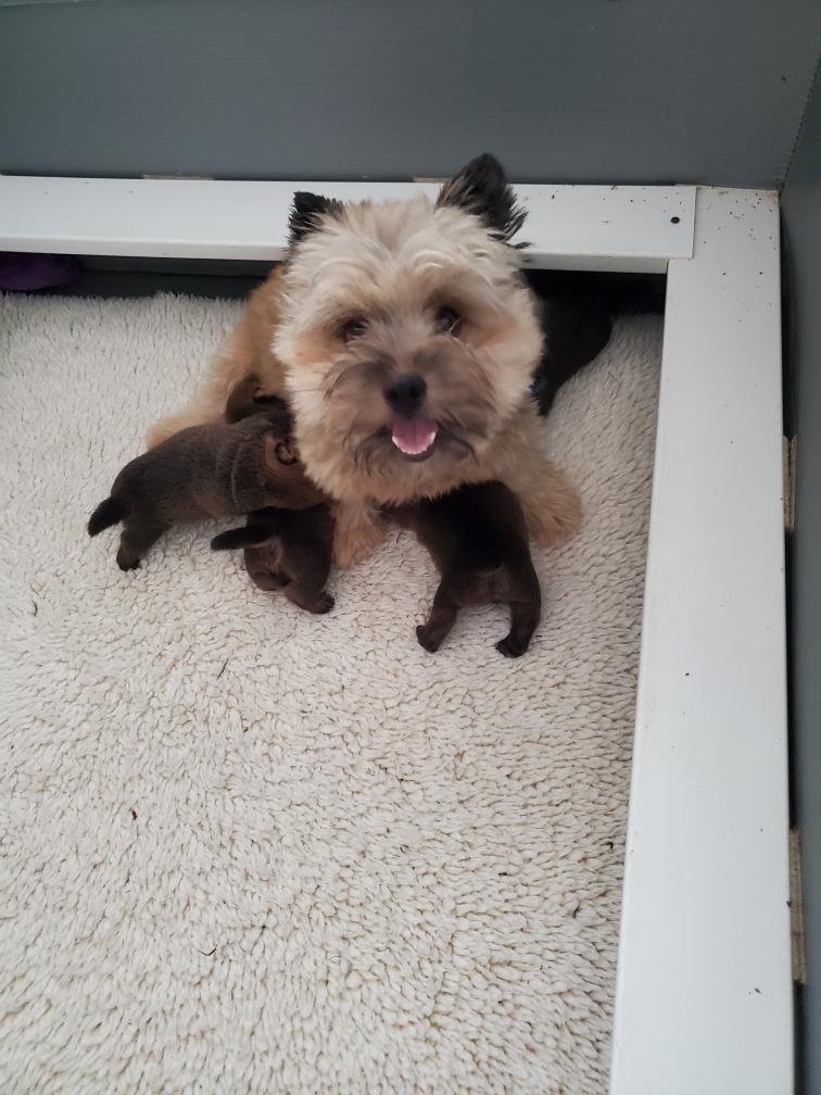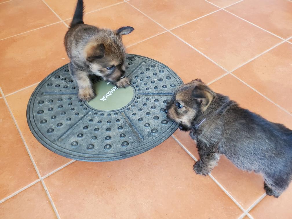Polly is a "fluffy" Norwich. This means that Polly has two copies of the (recessive) long coat allele that makes a long (and soft) coat. So Polly does not look like a typical Norwich, either in terms of the feel of her coat or its color. In the picture, Polly is shaved down. Gunner does not carry the fluffy allele, so any puppies from a Gunner x Polly breeding will have a normal Norwich coat.