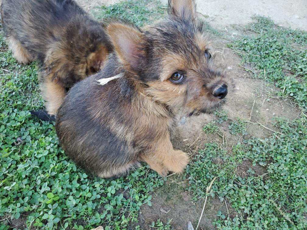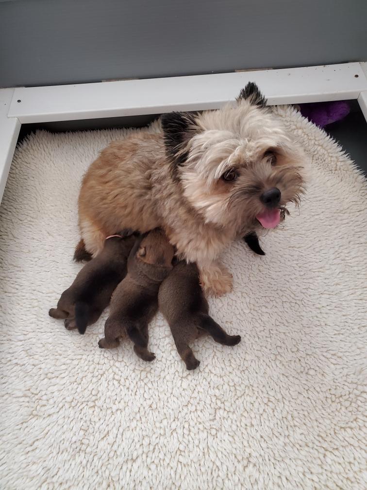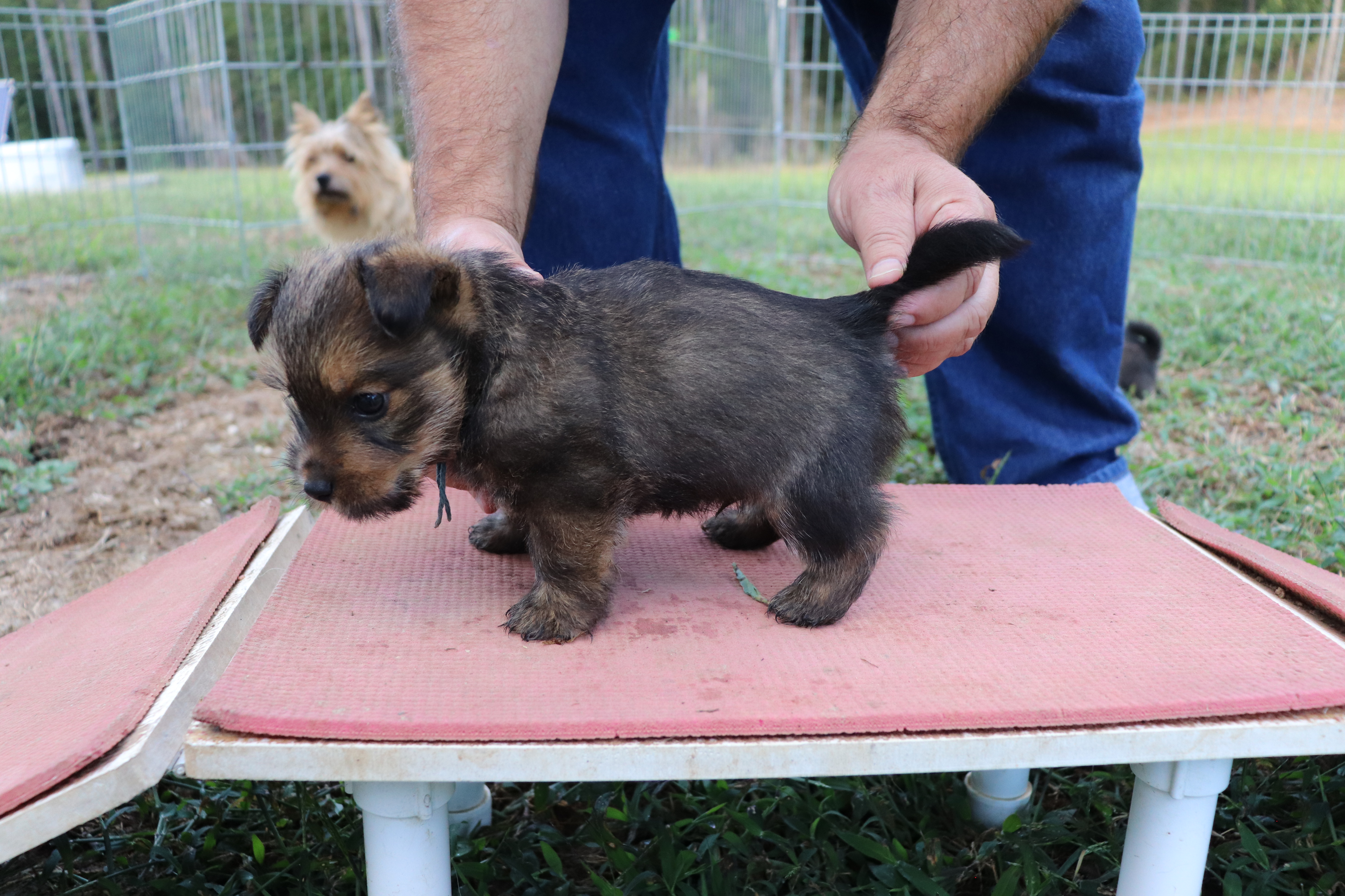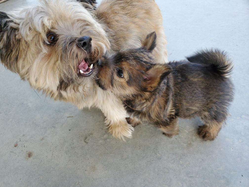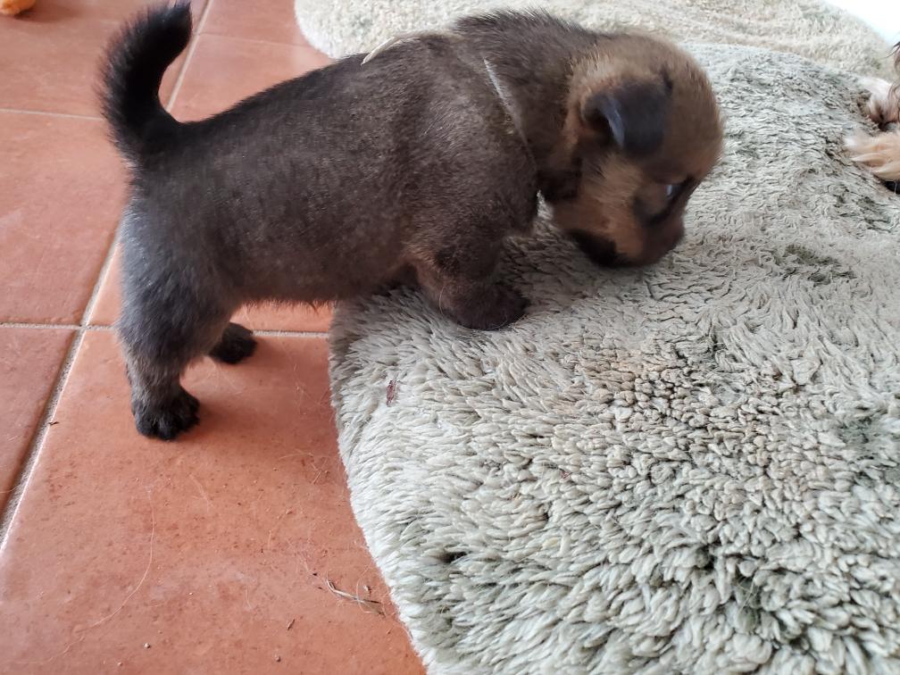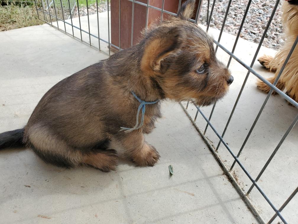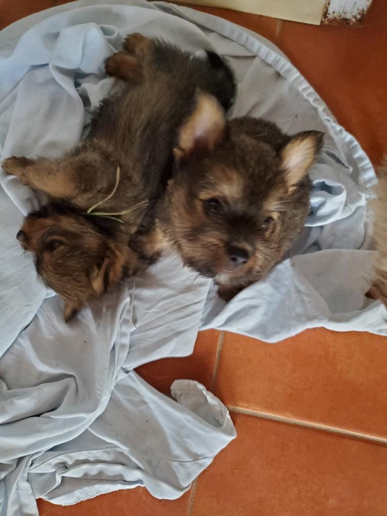 Polly is a "fluffy" Norwich. This means that Polly has two copies of the (recessive) long coat allele that makes a long (and soft) coat. So Polly does not look like a typical Norwich, either in terms of the feel of her coat or its color. In the picture, Polly is shaved down. Gunner does not carry the fluffy allele, so any puppies from a Gunner x Polly breeding will have a normal Norwich coat.