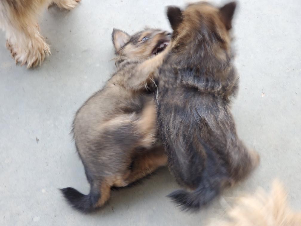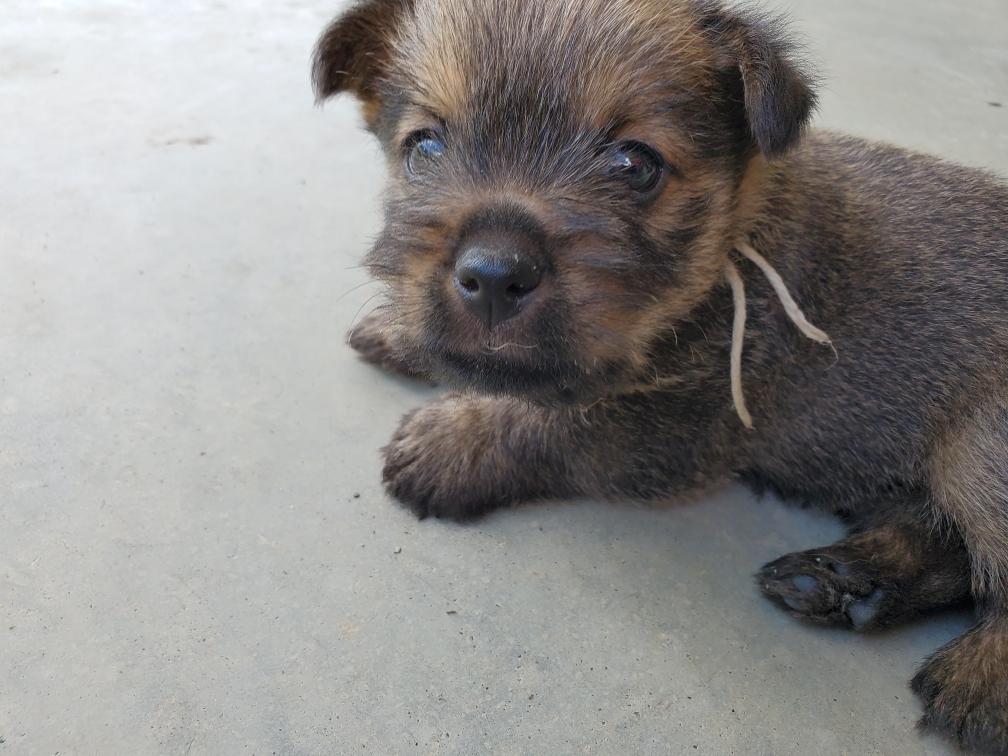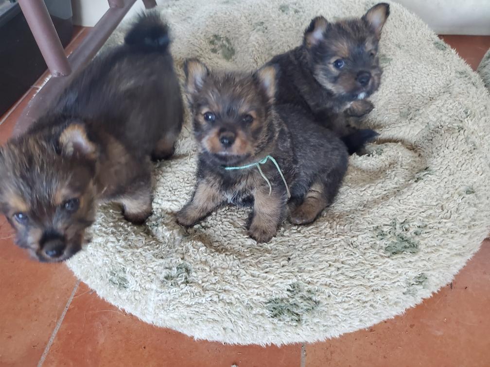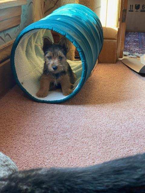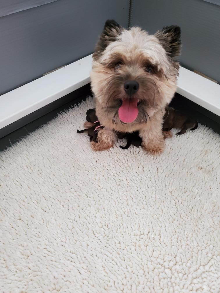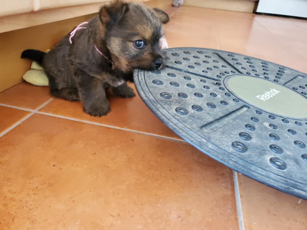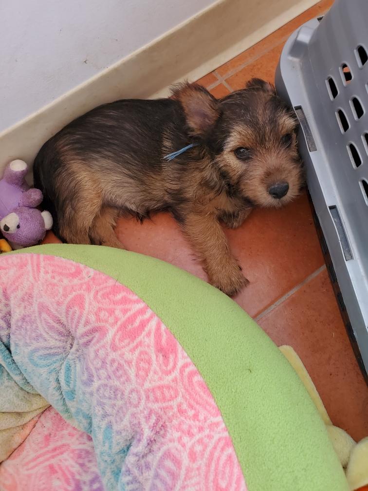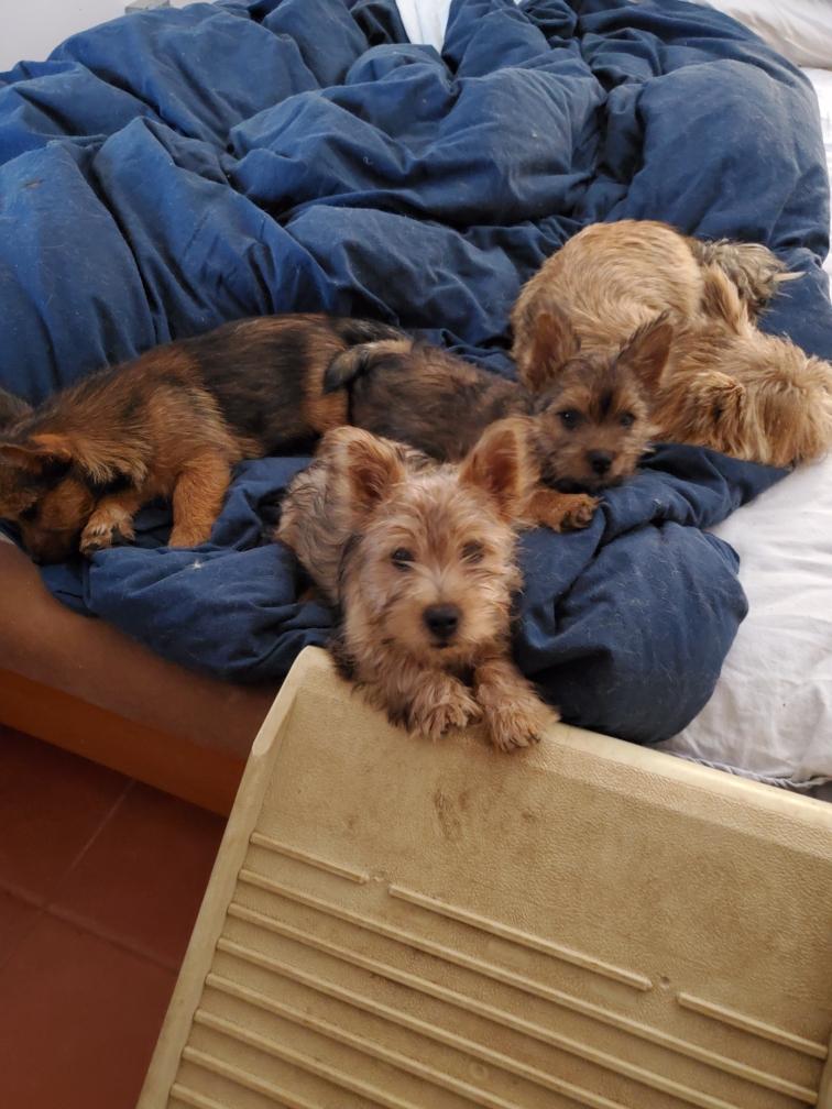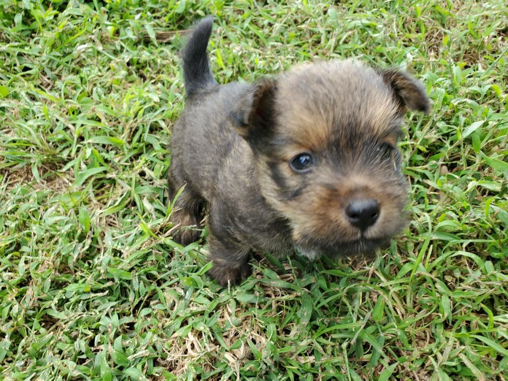 Polly is a "fluffy" Norwich. This means that Polly has two copies of the (recessive) long coat allele that makes a long (and soft) coat. So Polly does not look like a typical Norwich, either in terms of the feel of her coat or its color. In the picture, Polly is shaved down. Gunner does not carry the fluffy allele, so any puppies from a Gunner x Polly breeding will have a normal Norwich coat.