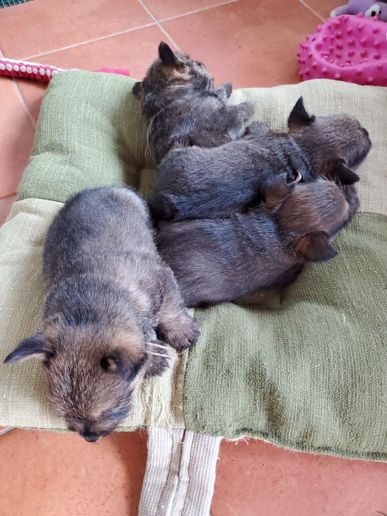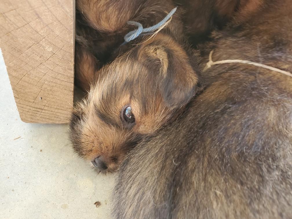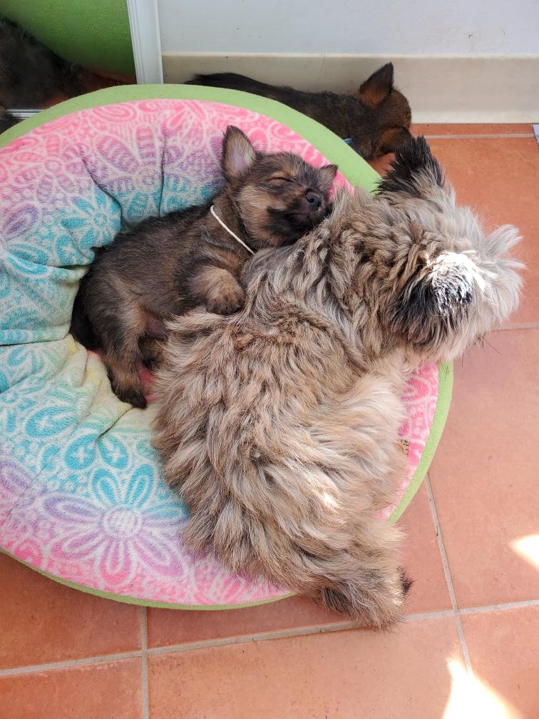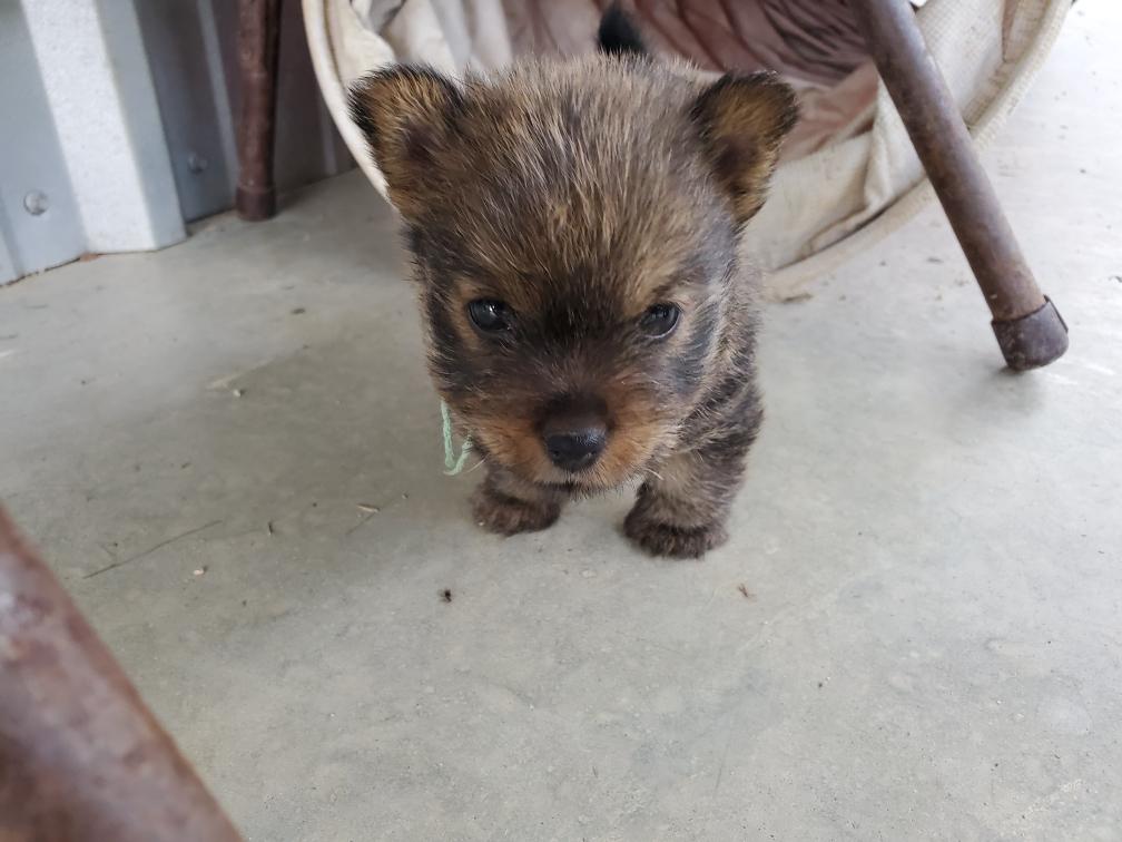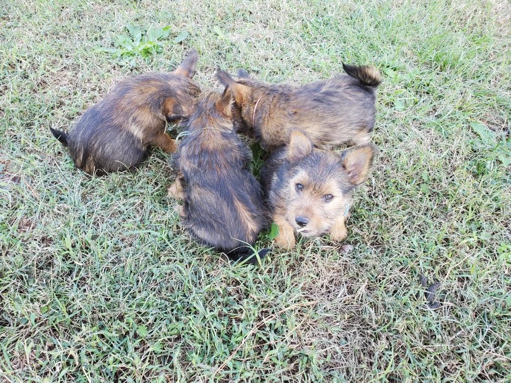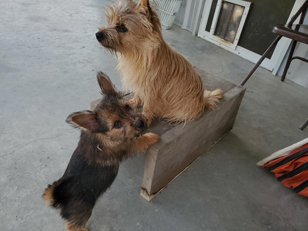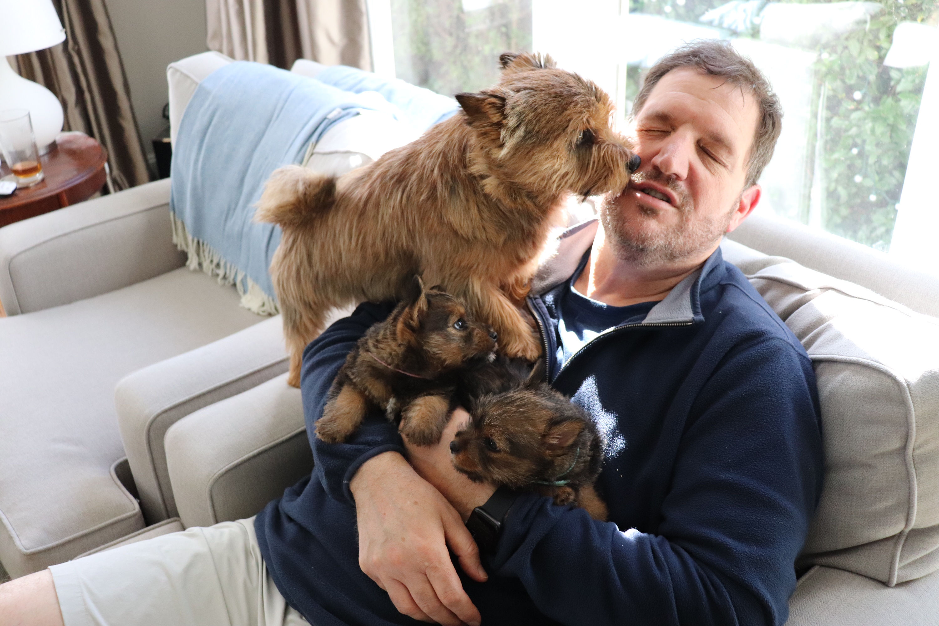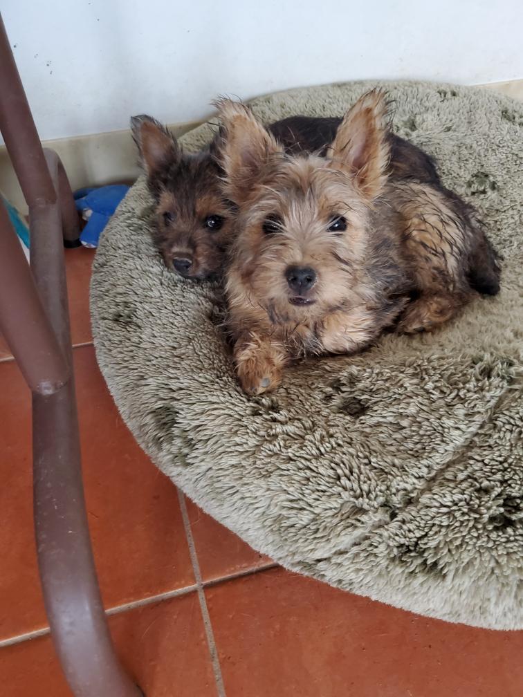 Polly is a "fluffy" Norwich. This means that Polly has two copies of the (recessive) long coat allele that makes a long (and soft) coat. So Polly does not look like a typical Norwich, either in terms of the feel of her coat or its color. In the picture, Polly is shaved down. Gunner does not carry the fluffy allele, so any puppies from a Gunner x Polly breeding will have a normal Norwich coat.