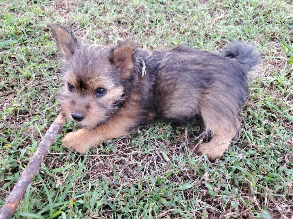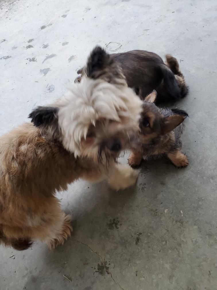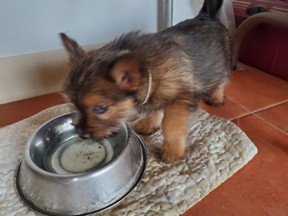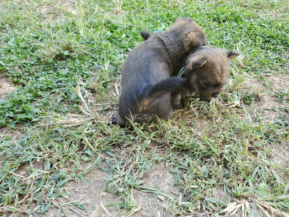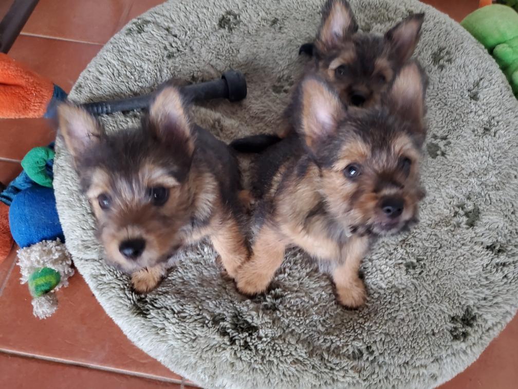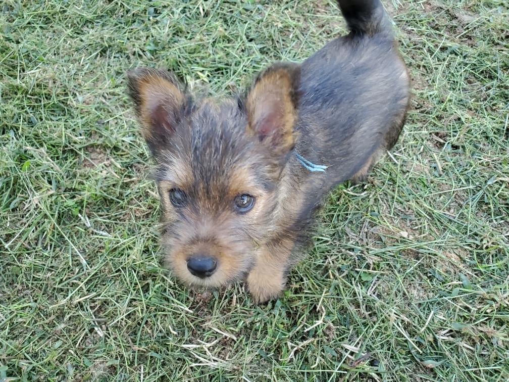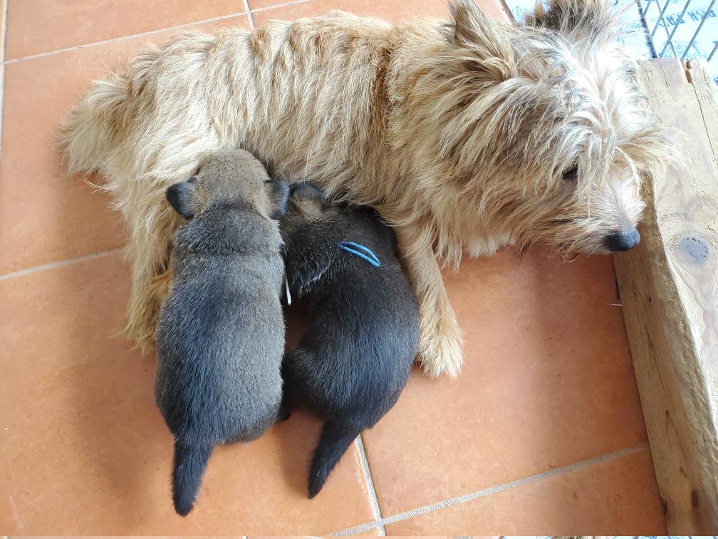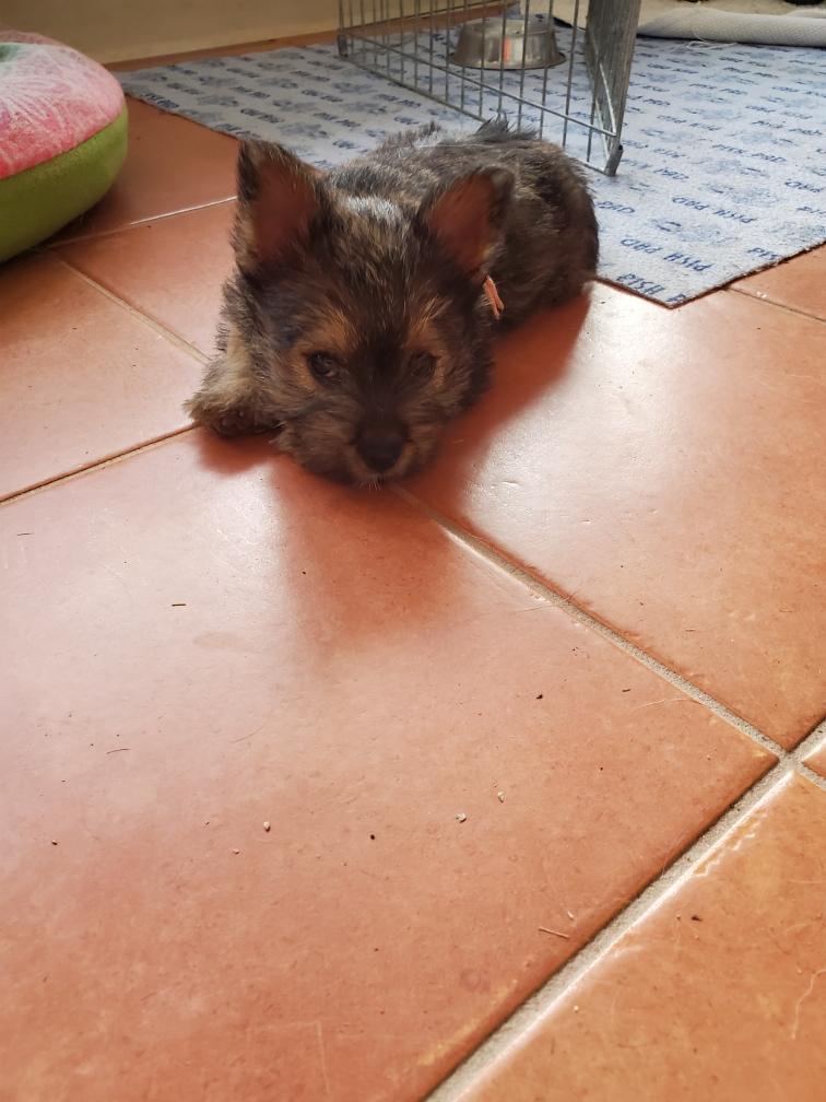 Polly is a "fluffy" Norwich. This means that Polly has two copies of the (recessive) long coat allele that makes a long (and soft) coat. So Polly does not look like a typical Norwich, either in terms of the feel of her coat or its color. In the picture, Polly is shaved down. Gunner does not carry the fluffy allele, so any puppies from a Gunner x Polly breeding will have a normal Norwich coat.