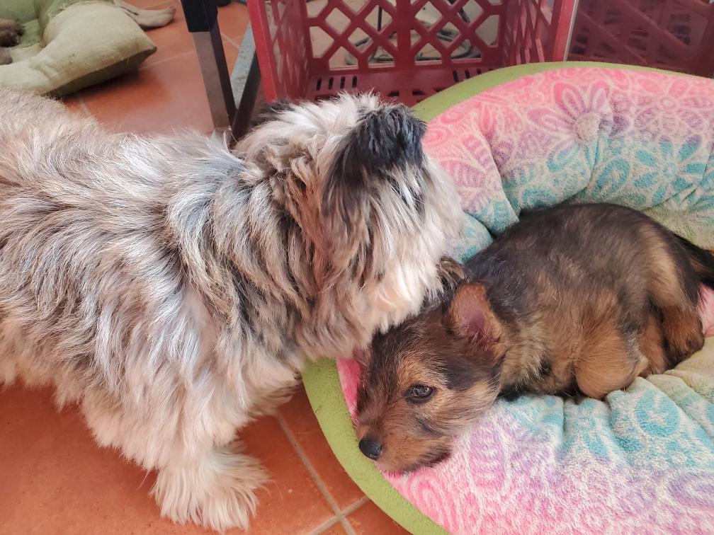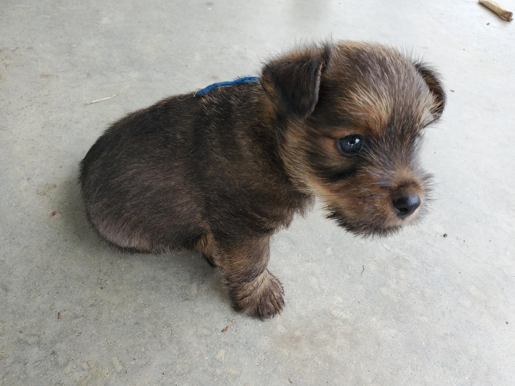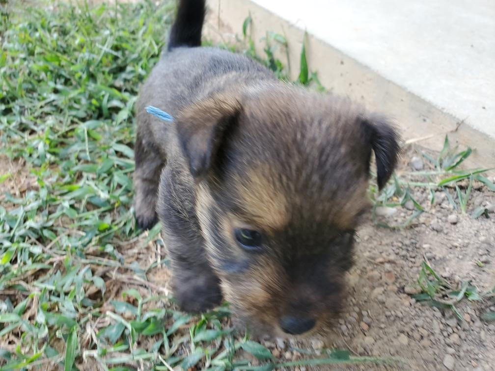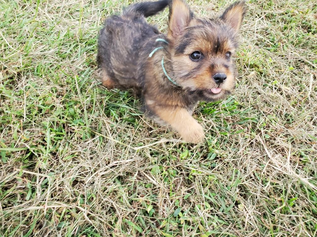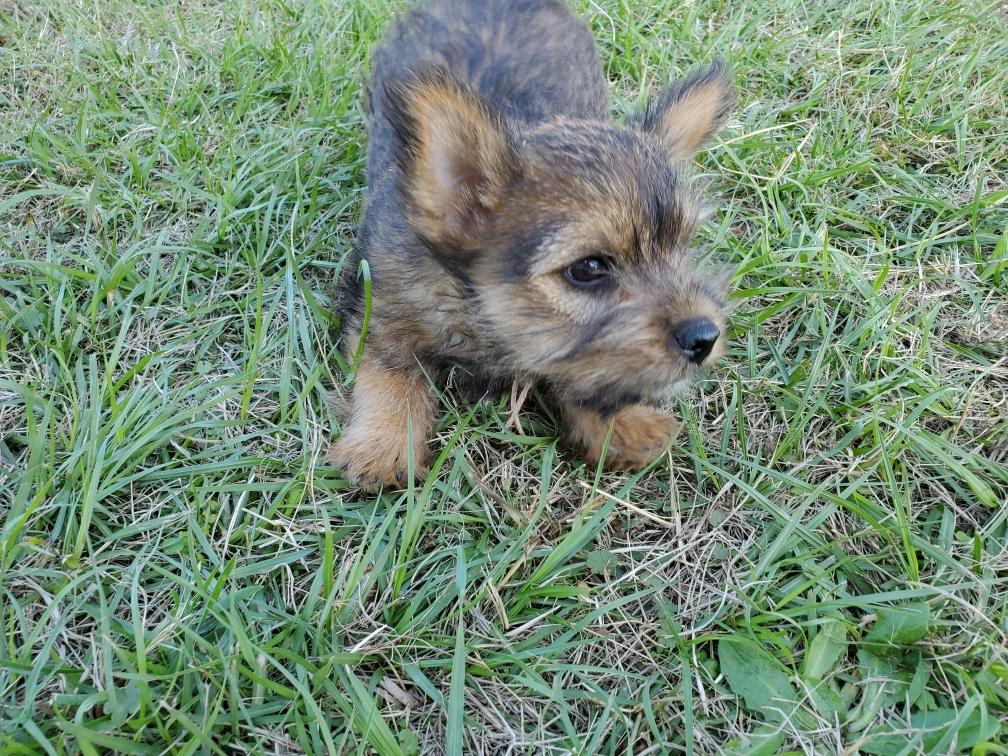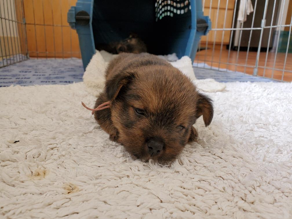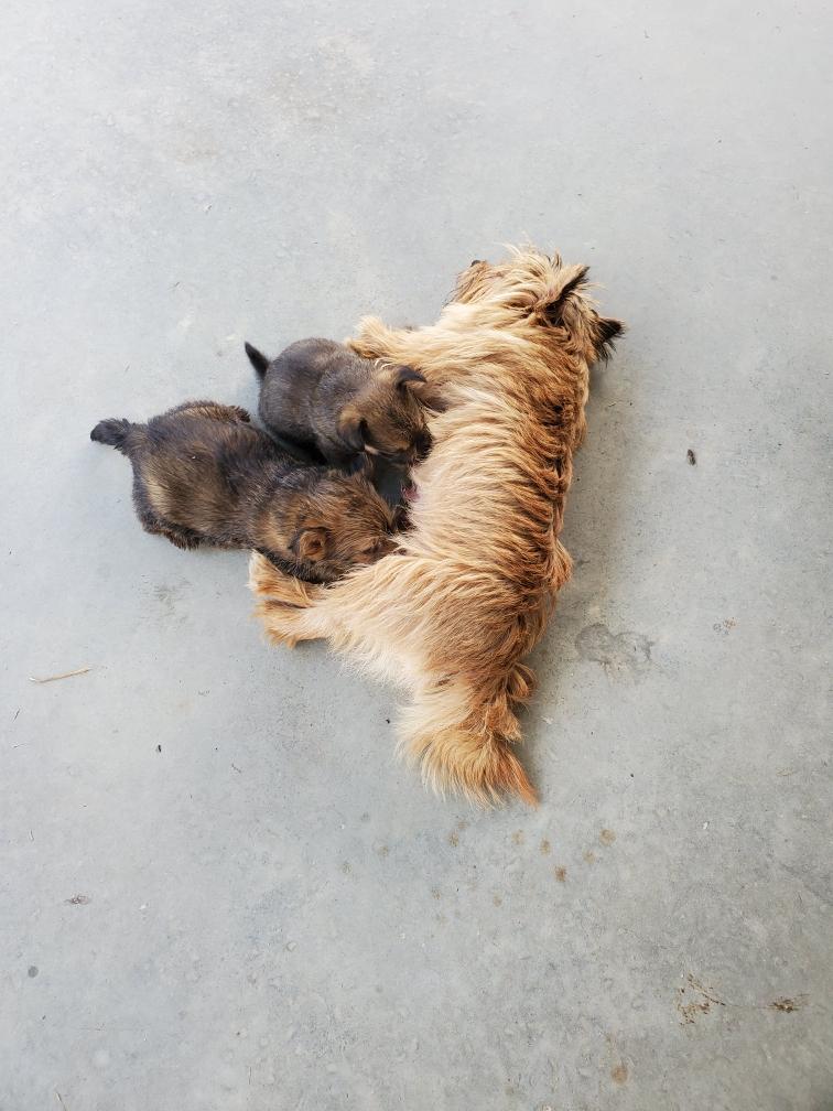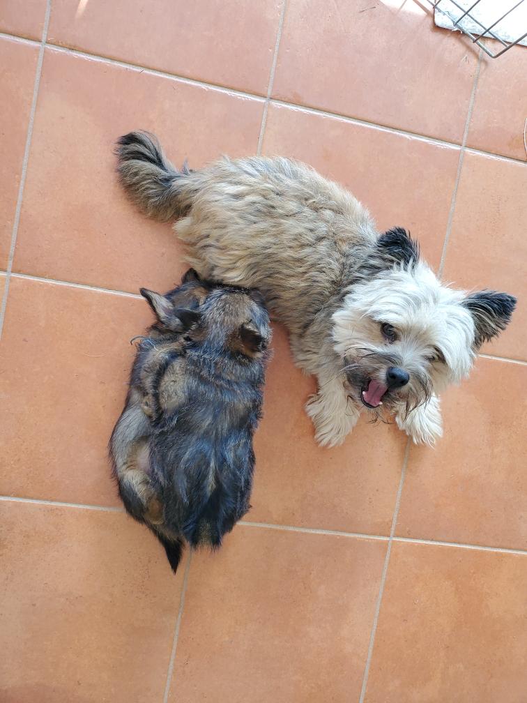 Polly is a "fluffy" Norwich. This means that Polly has two copies of the (recessive) long coat allele that makes a long (and soft) coat. So Polly does not look like a typical Norwich, either in terms of the feel of her coat or its color. In the picture, Polly is shaved down. Gunner does not carry the fluffy allele, so any puppies from a Gunner x Polly breeding will have a normal Norwich coat.