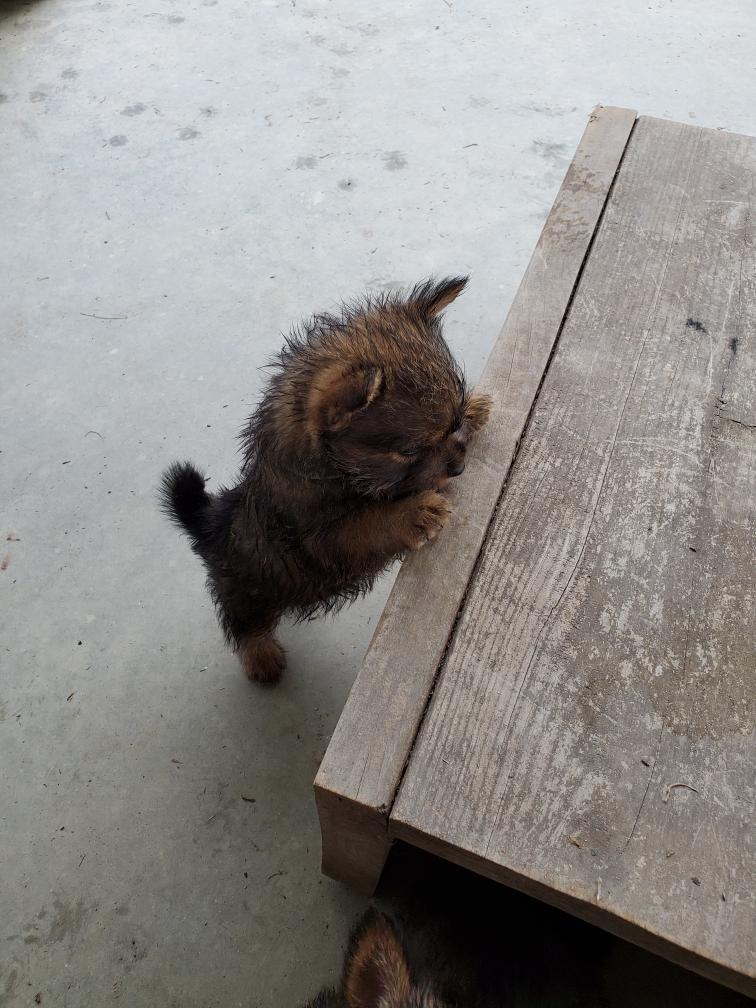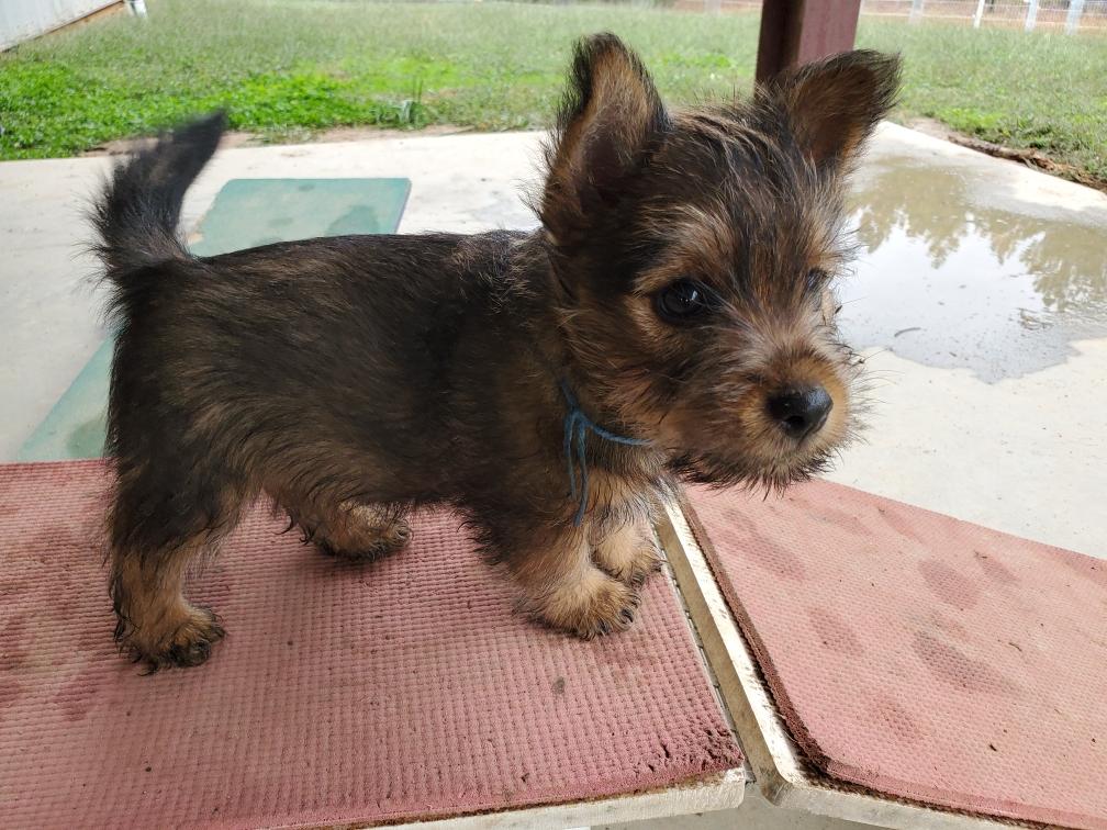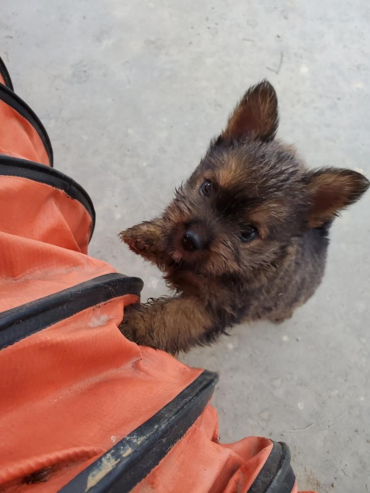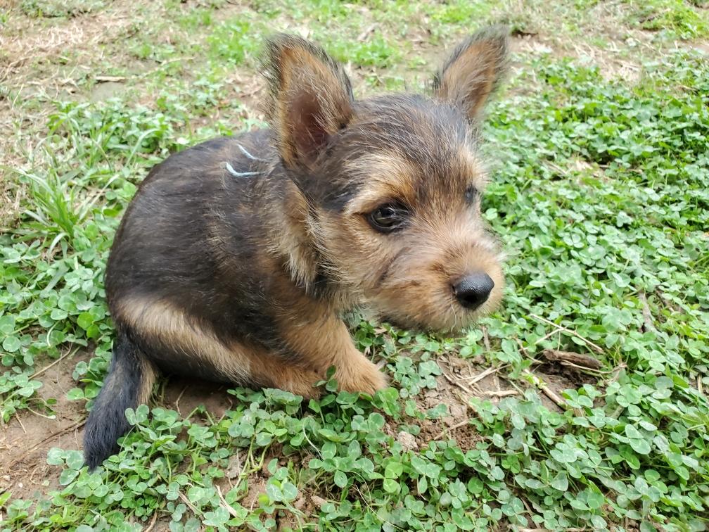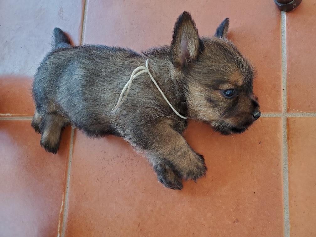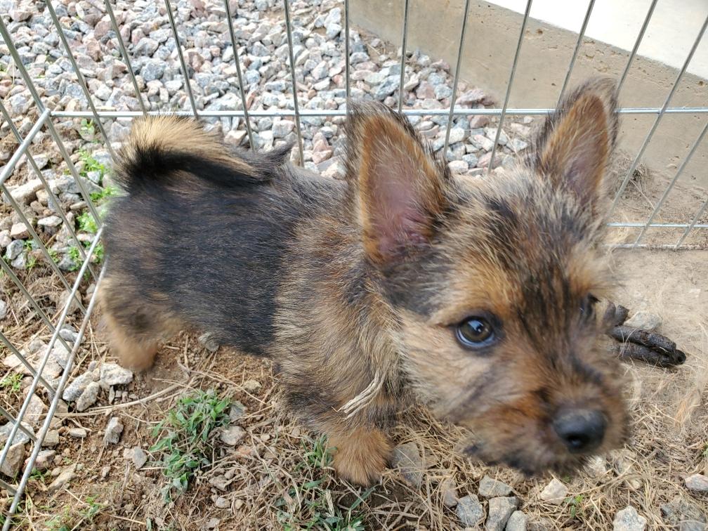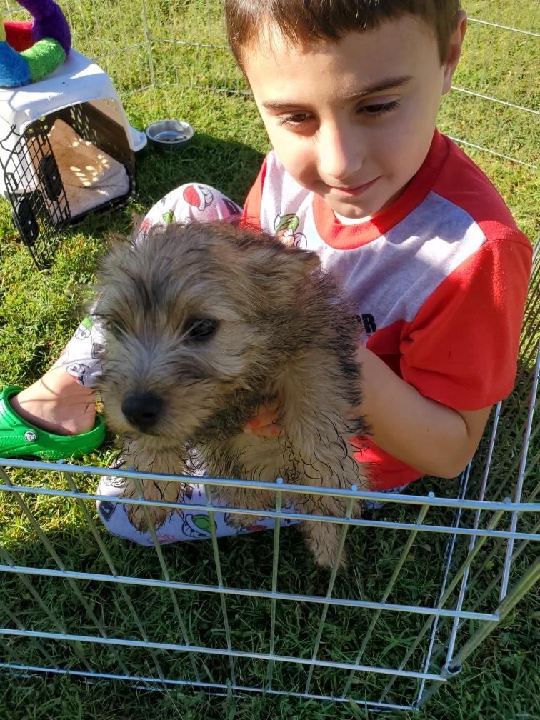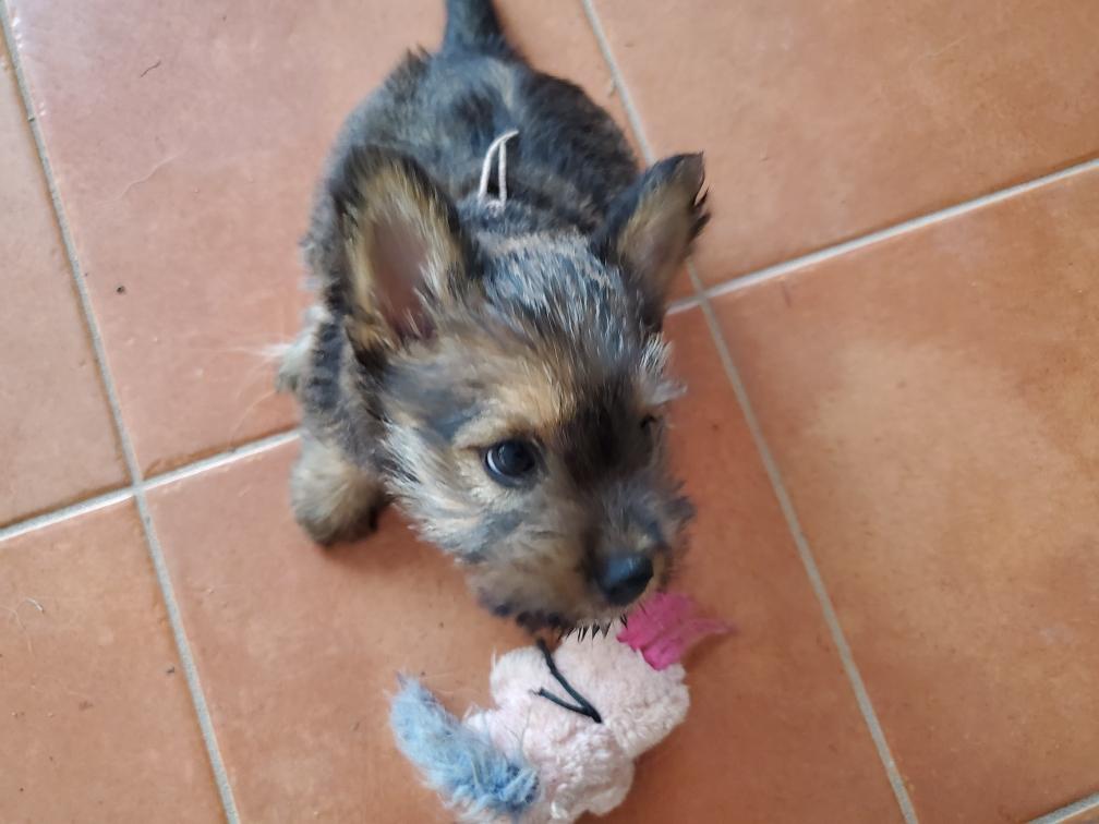 Polly is a "fluffy" Norwich. This means that Polly has two copies of the (recessive) long coat allele that makes a long (and soft) coat. So Polly does not look like a typical Norwich, either in terms of the feel of her coat or its color. In the picture, Polly is shaved down. Gunner does not carry the fluffy allele, so any puppies from a Gunner x Polly breeding will have a normal Norwich coat.