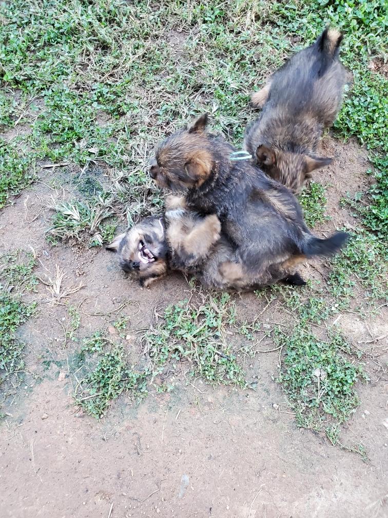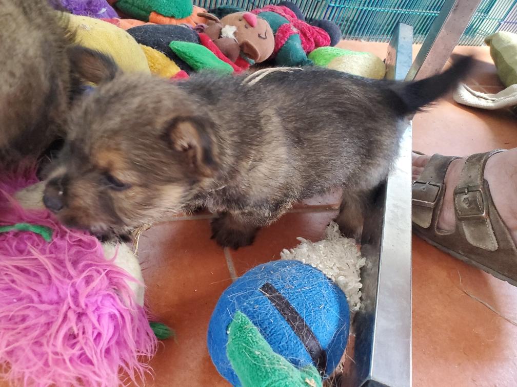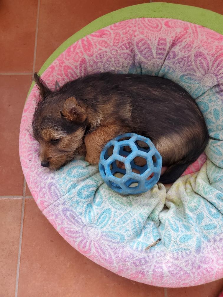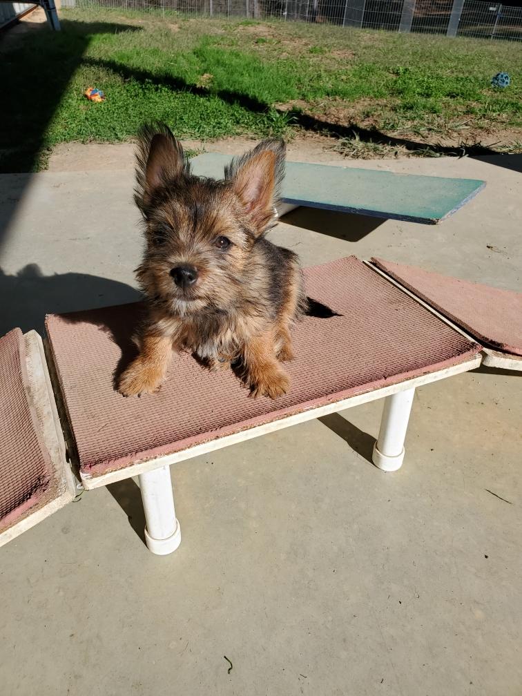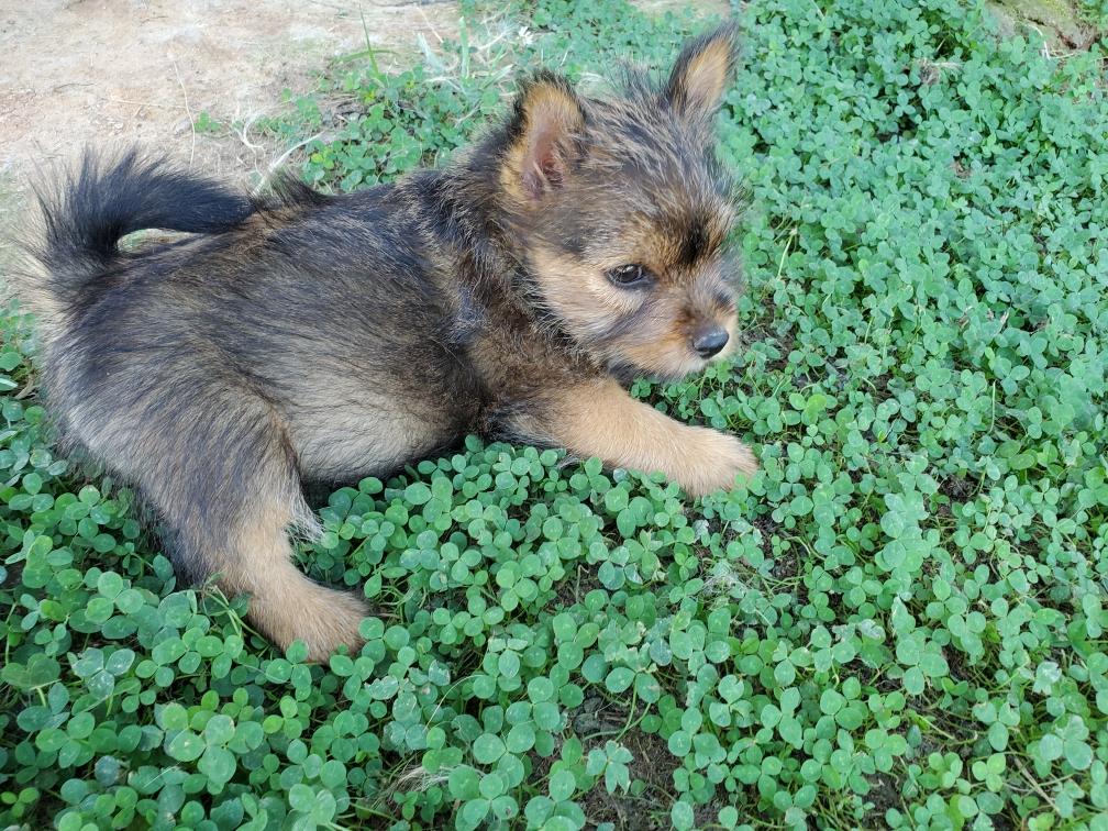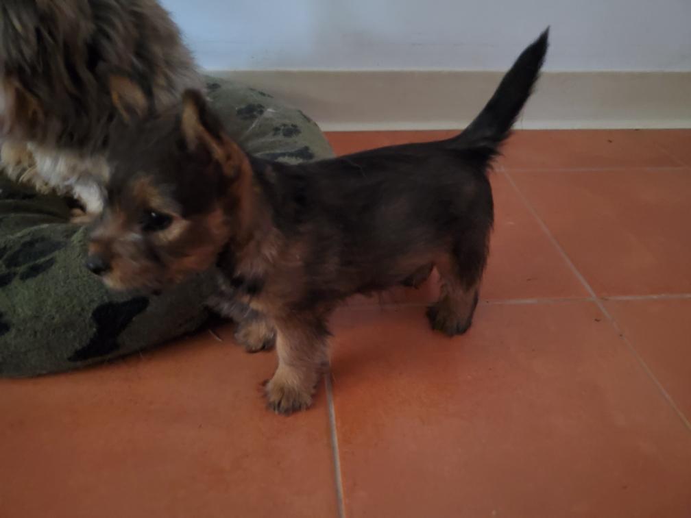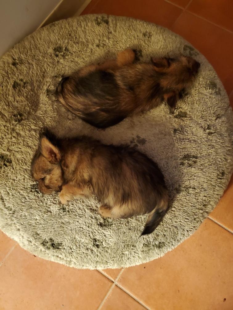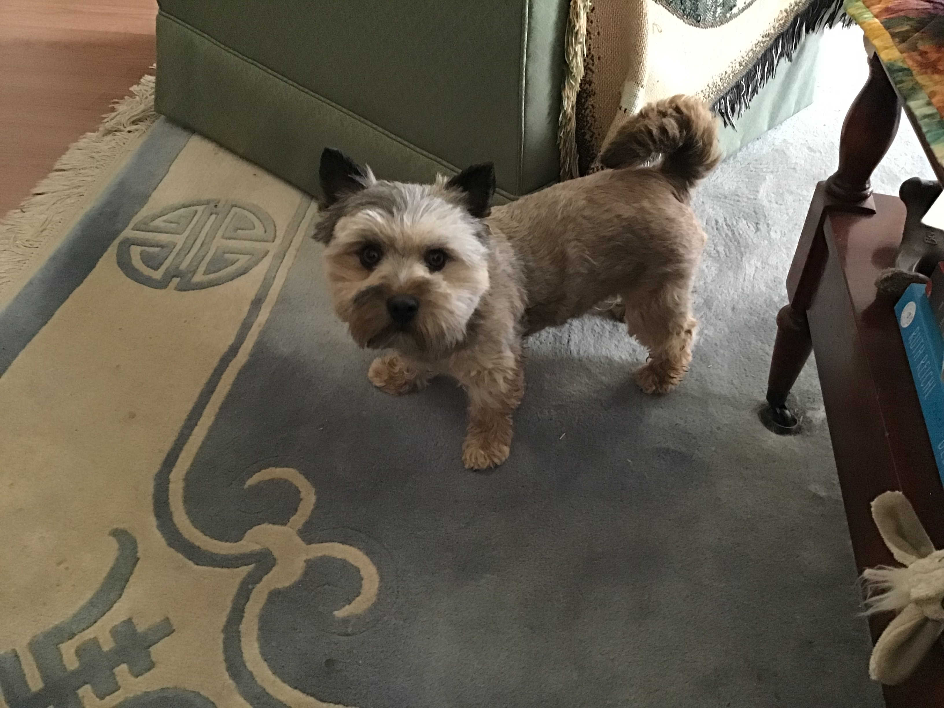 Polly is a "fluffy" Norwich. This means that Polly has two copies of the (recessive) long coat allele that makes a long (and soft) coat. So Polly does not look like a typical Norwich, either in terms of the feel of her coat or its color. In the picture, Polly is shaved down. Gunner does not carry the fluffy allele, so any puppies from a Gunner x Polly breeding will have a normal Norwich coat.