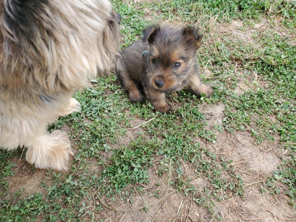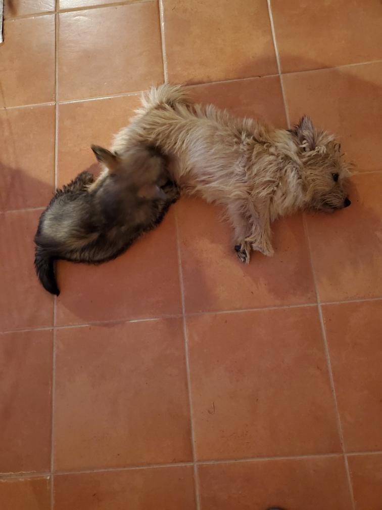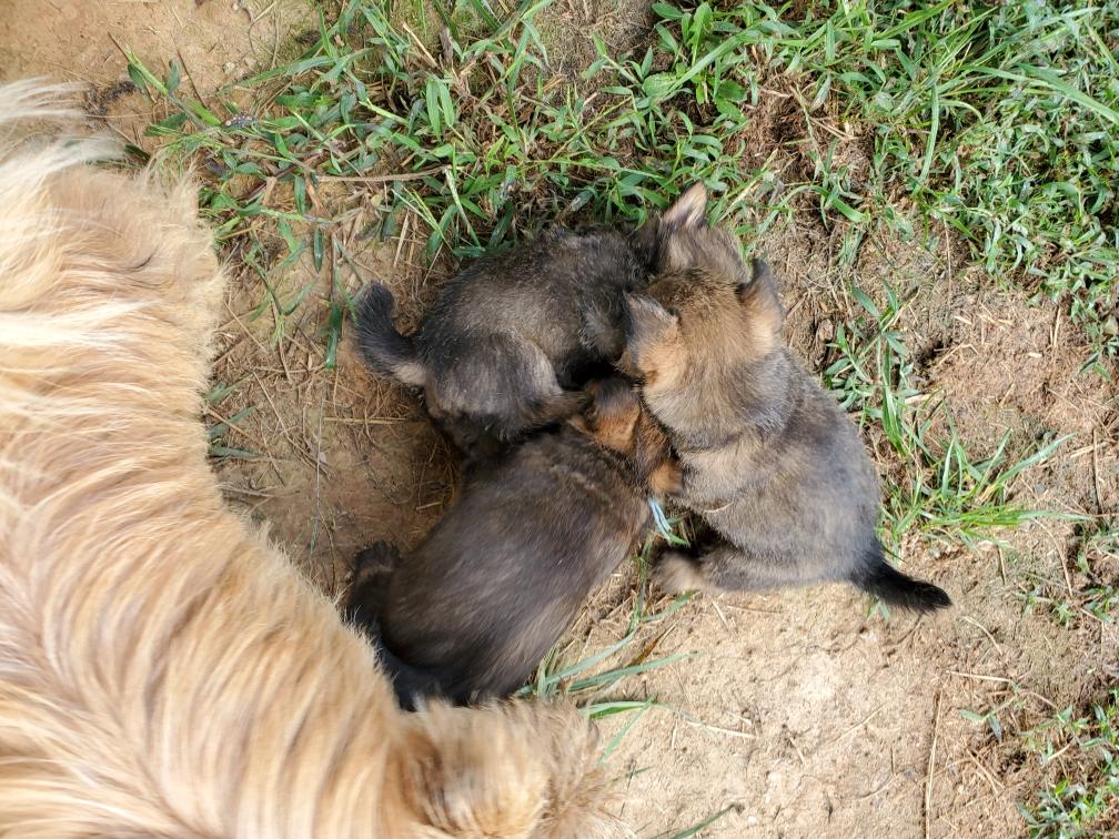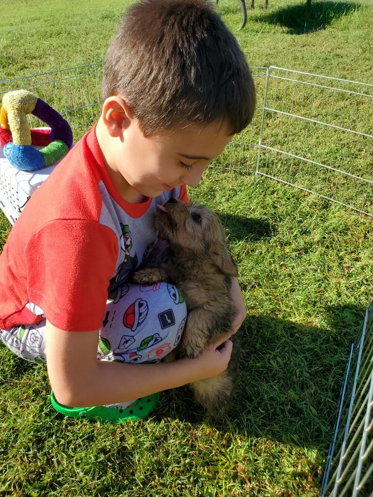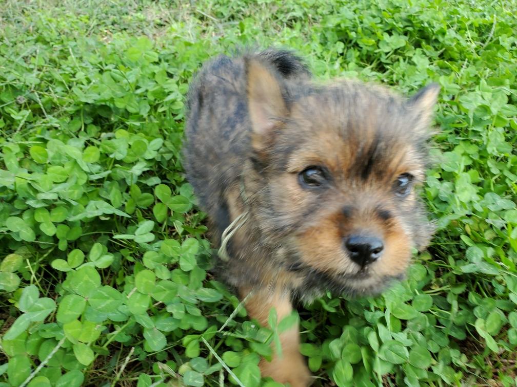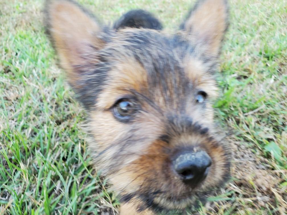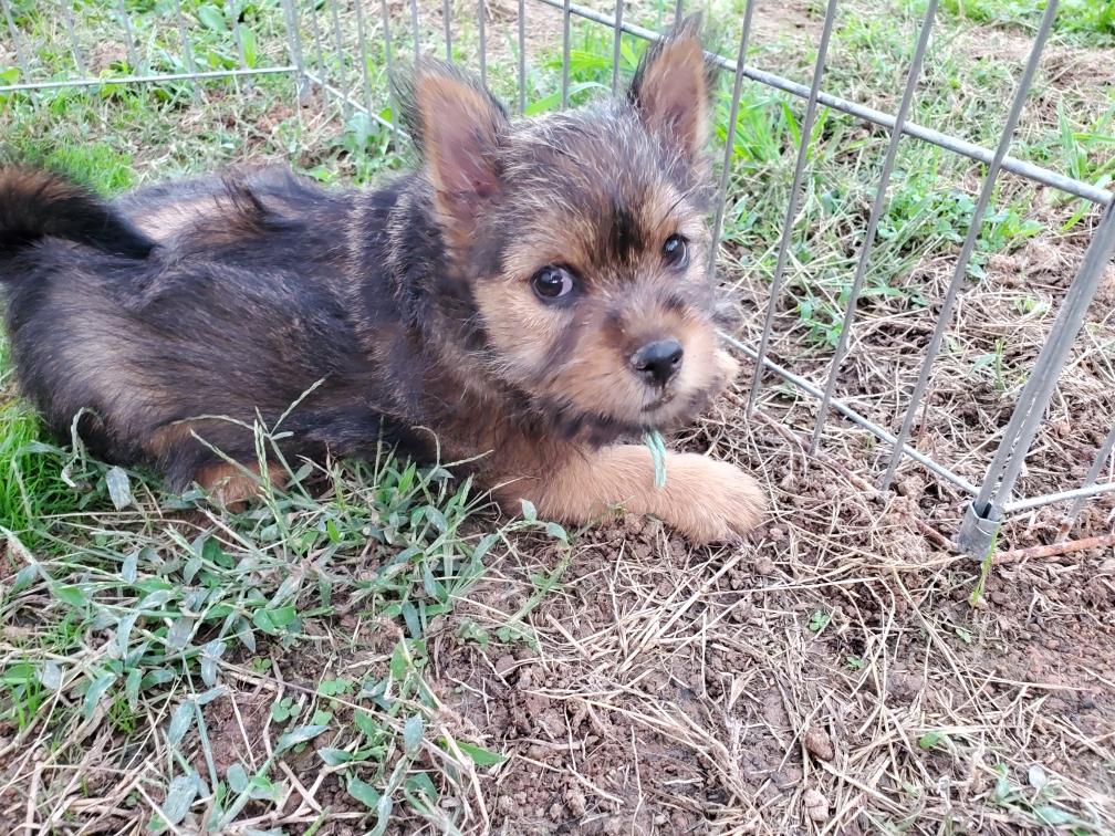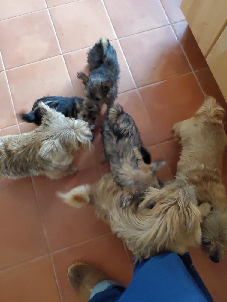 Polly is a "fluffy" Norwich. This means that Polly has two copies of the (recessive) long coat allele that makes a long (and soft) coat. So Polly does not look like a typical Norwich, either in terms of the feel of her coat or its color. In the picture, Polly is shaved down. Gunner does not carry the fluffy allele, so any puppies from a Gunner x Polly breeding will have a normal Norwich coat.