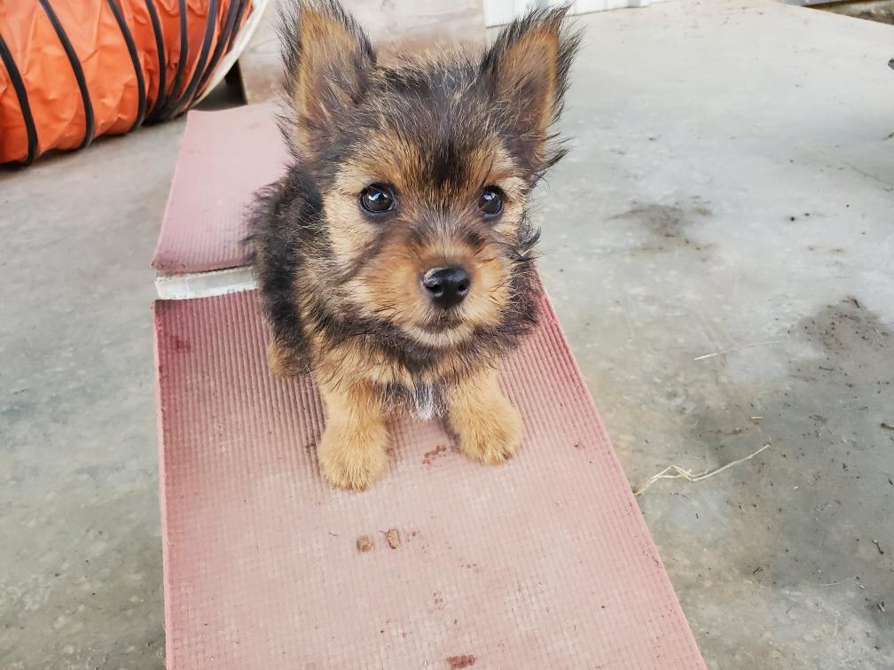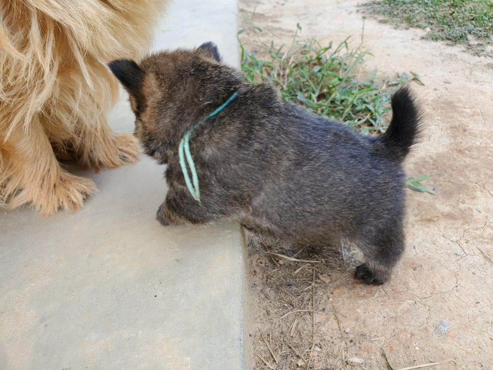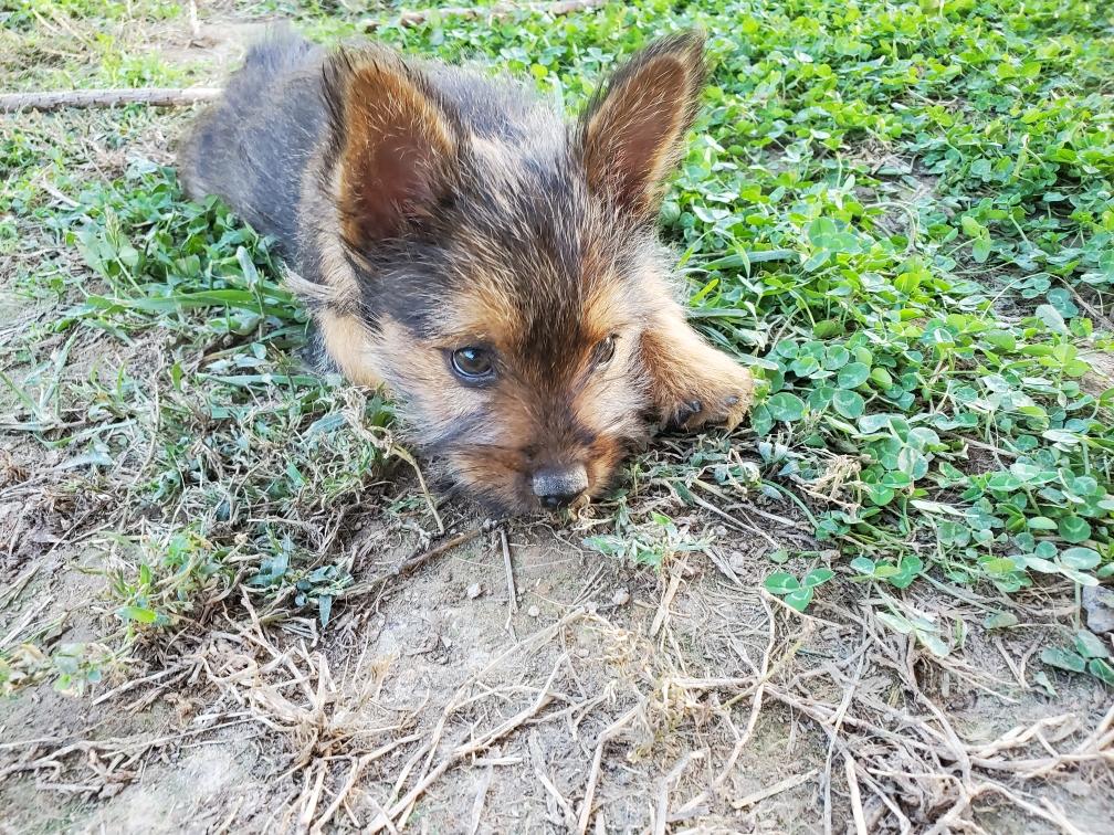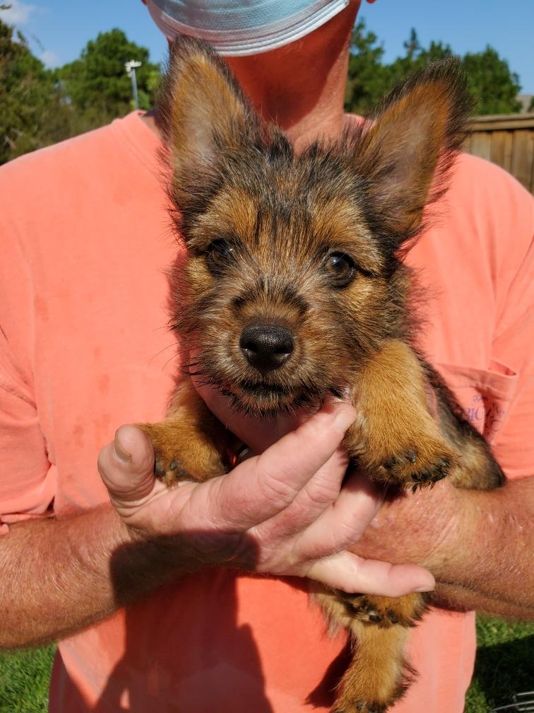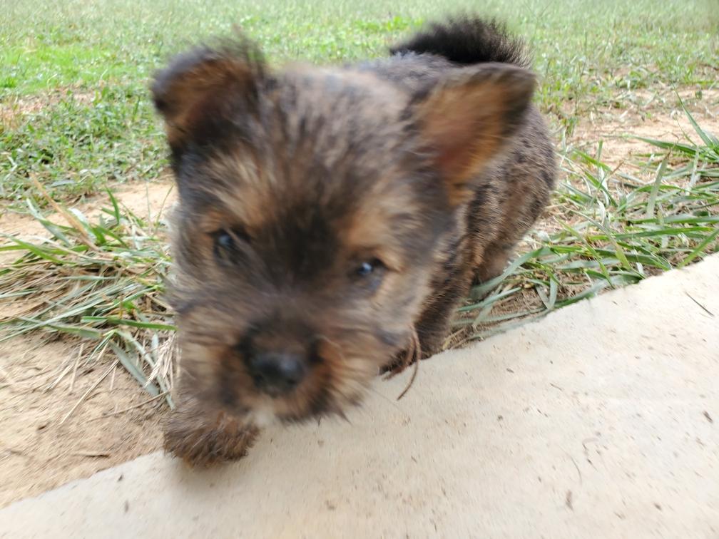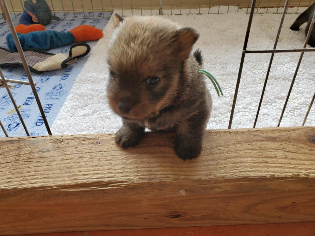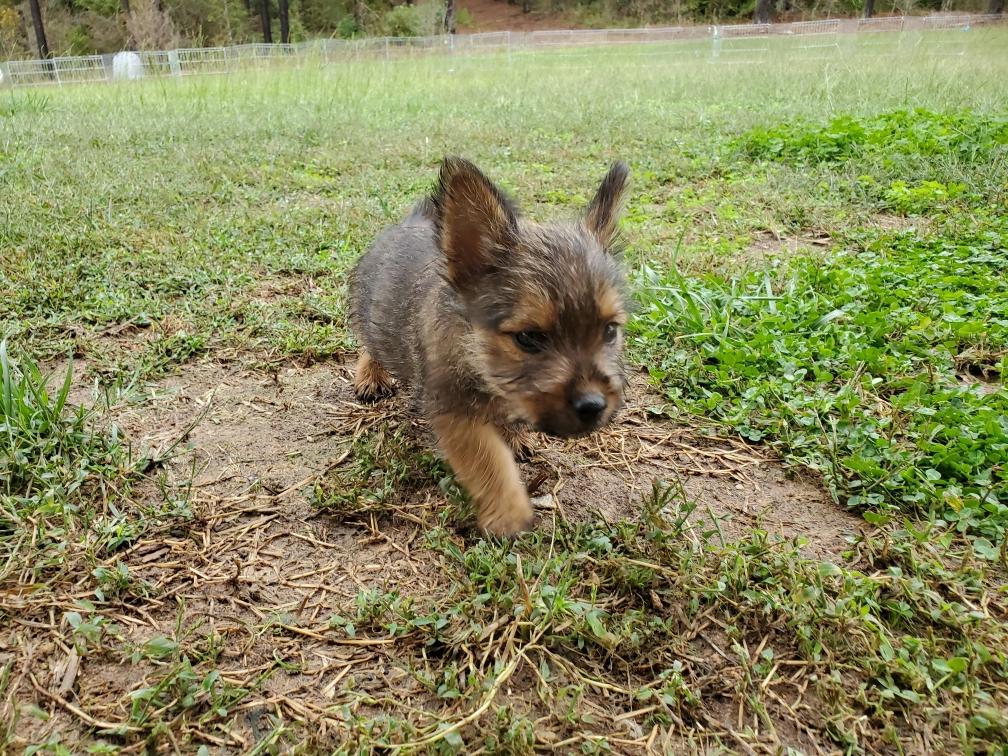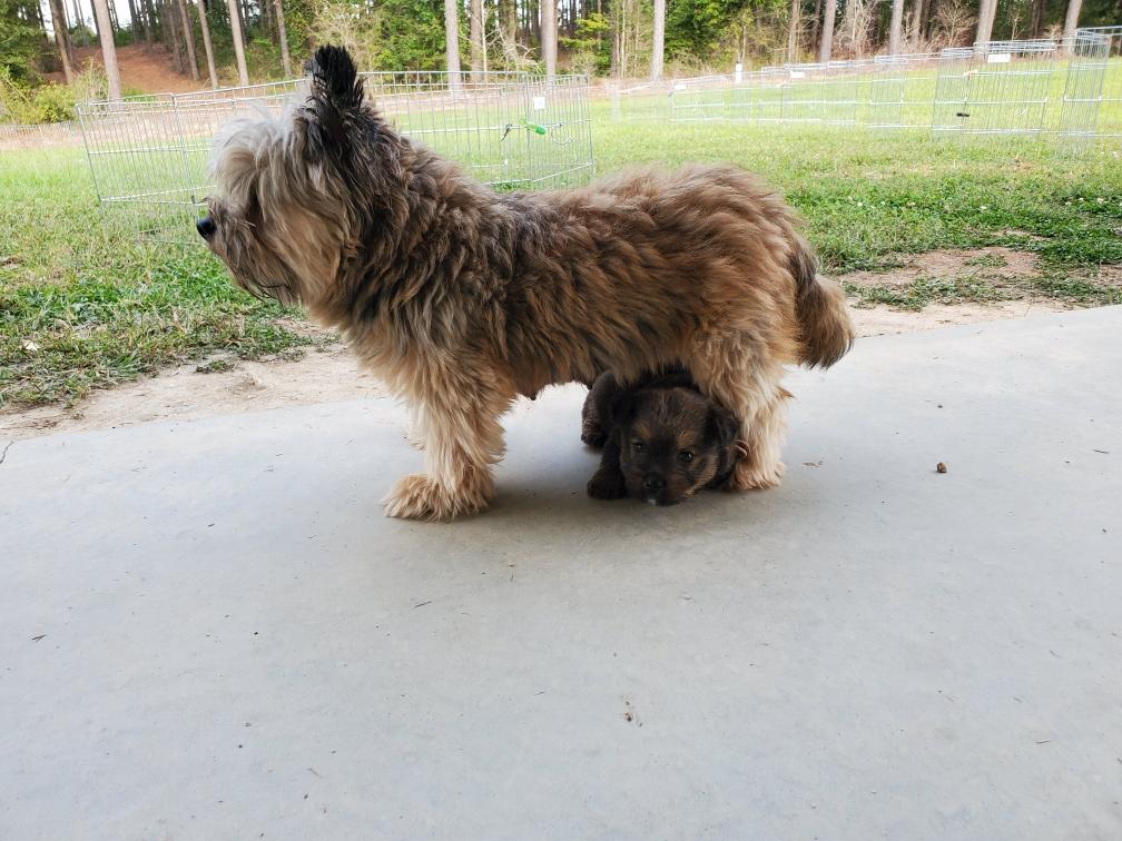 Polly is a "fluffy" Norwich. This means that Polly has two copies of the (recessive) long coat allele that makes a long (and soft) coat. So Polly does not look like a typical Norwich, either in terms of the feel of her coat or its color. In the picture, Polly is shaved down. Gunner does not carry the fluffy allele, so any puppies from a Gunner x Polly breeding will have a normal Norwich coat.